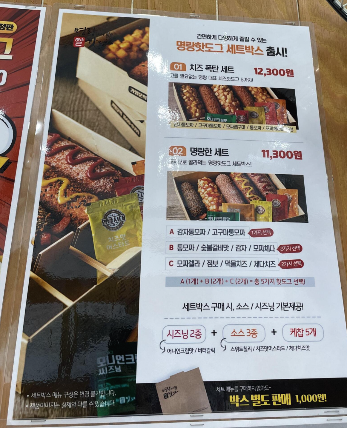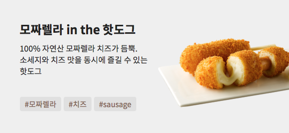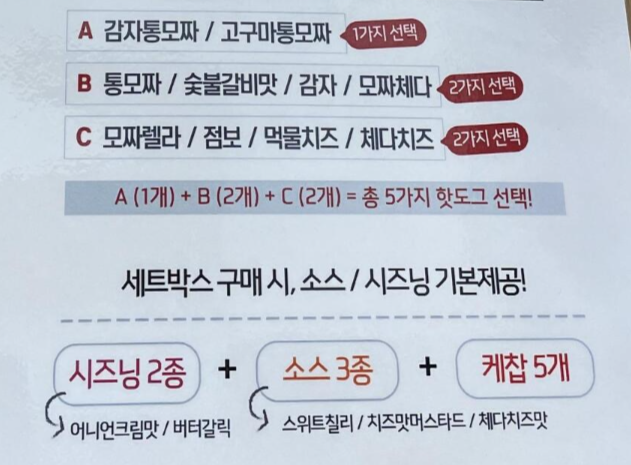 홈페이지에 나와있는 소개는 이러합니다. 치즈가 들어간 떡볶이에 핫도그 5개 구성이에요. 핫도그의 종류는 고정이라고 생각했는데, 5개를 골라야 해서 당황했어요!