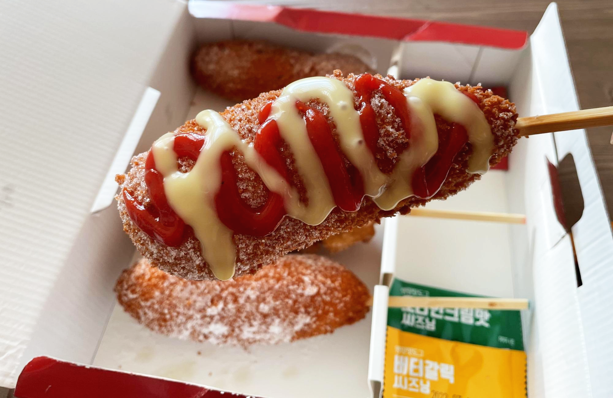 이번에는 모짜렐라 핫도그를 케첩과 치즈맛 머스타드를 뿌려 이대로만 먹어봤어요. 위에는 모짜렐라치즈가, 아래는 소시지가 들어있네요. 맛있었어요!!! :-) 둘이서 먹는 거라 딱 여기까지만 먹었어요.