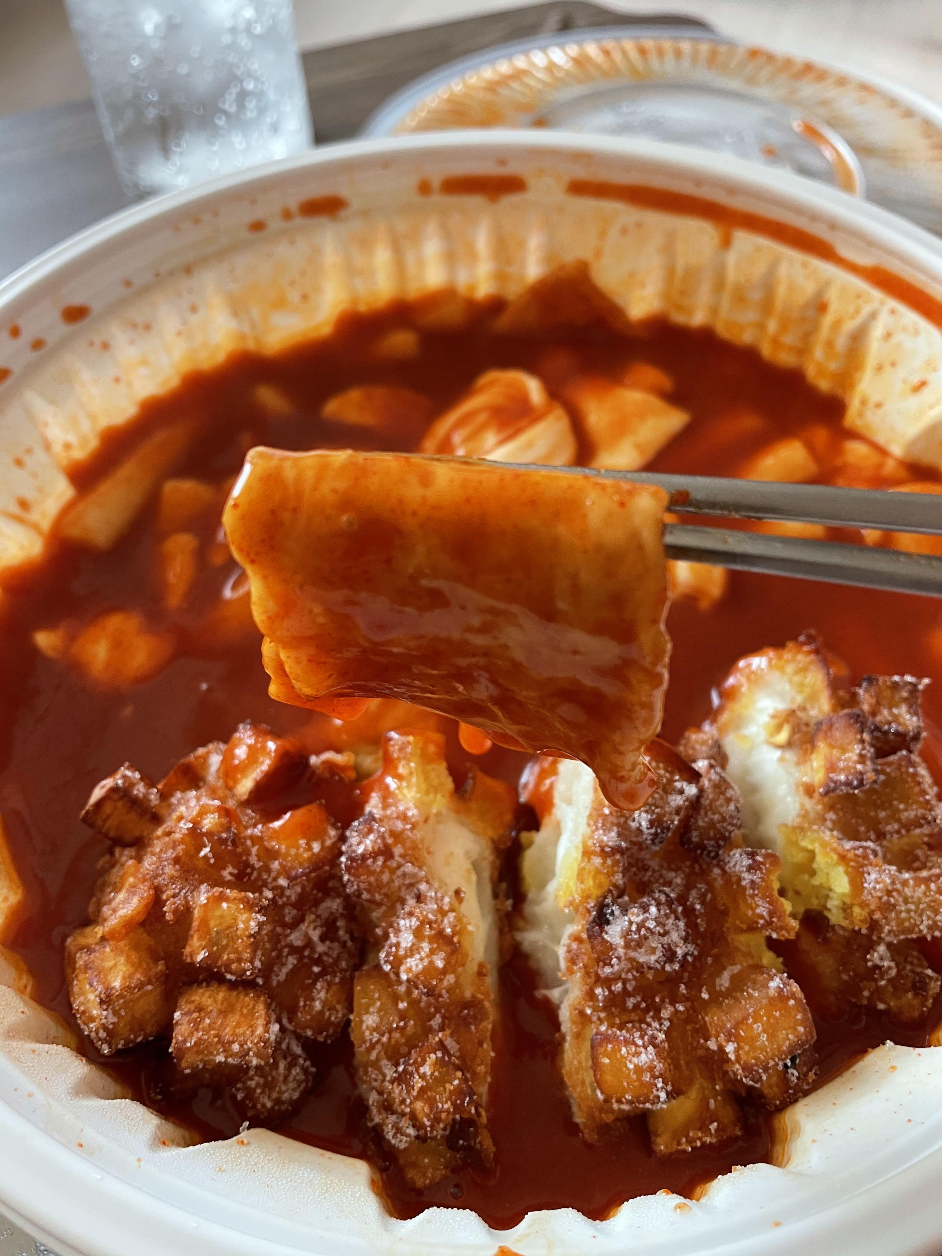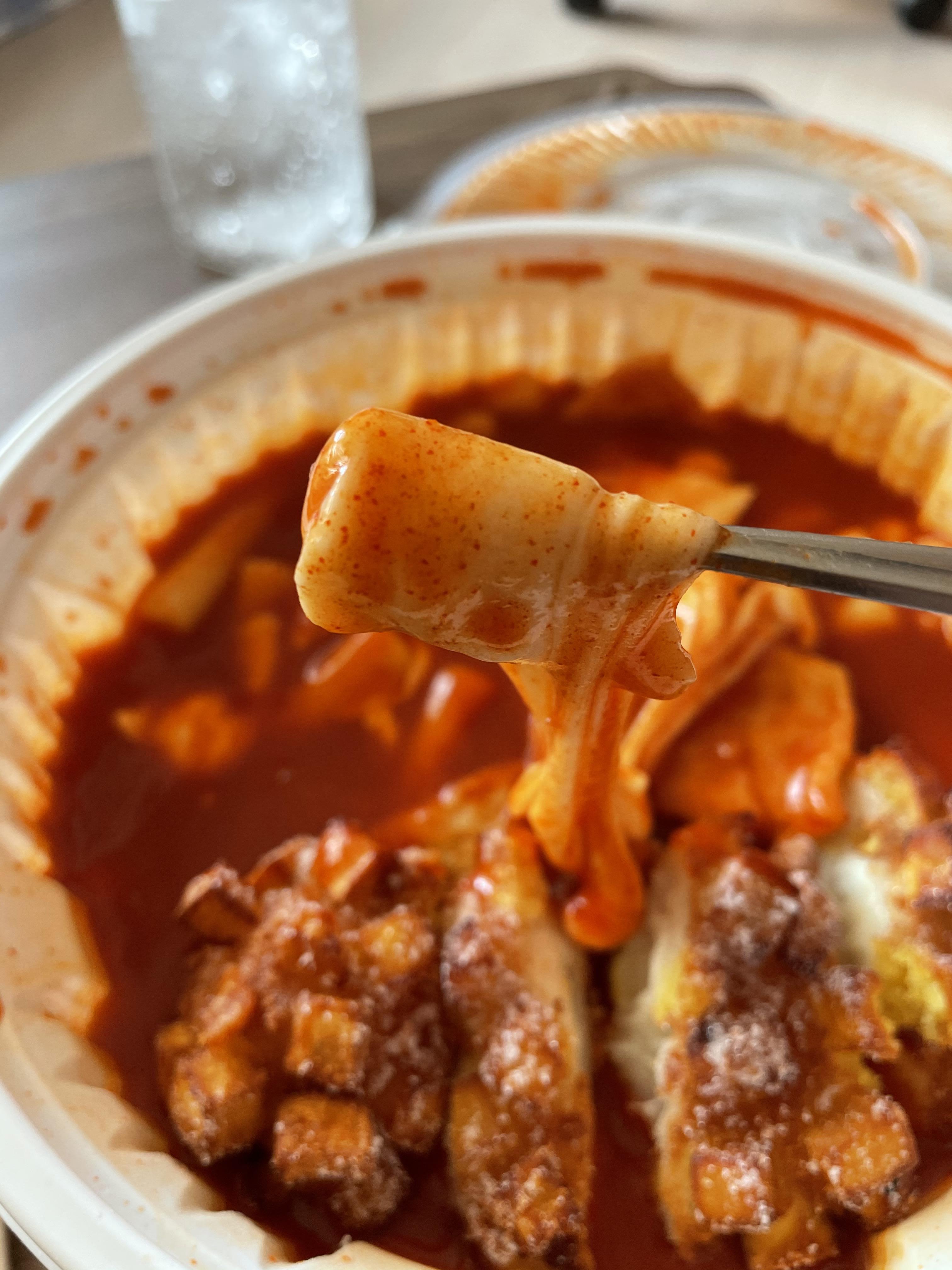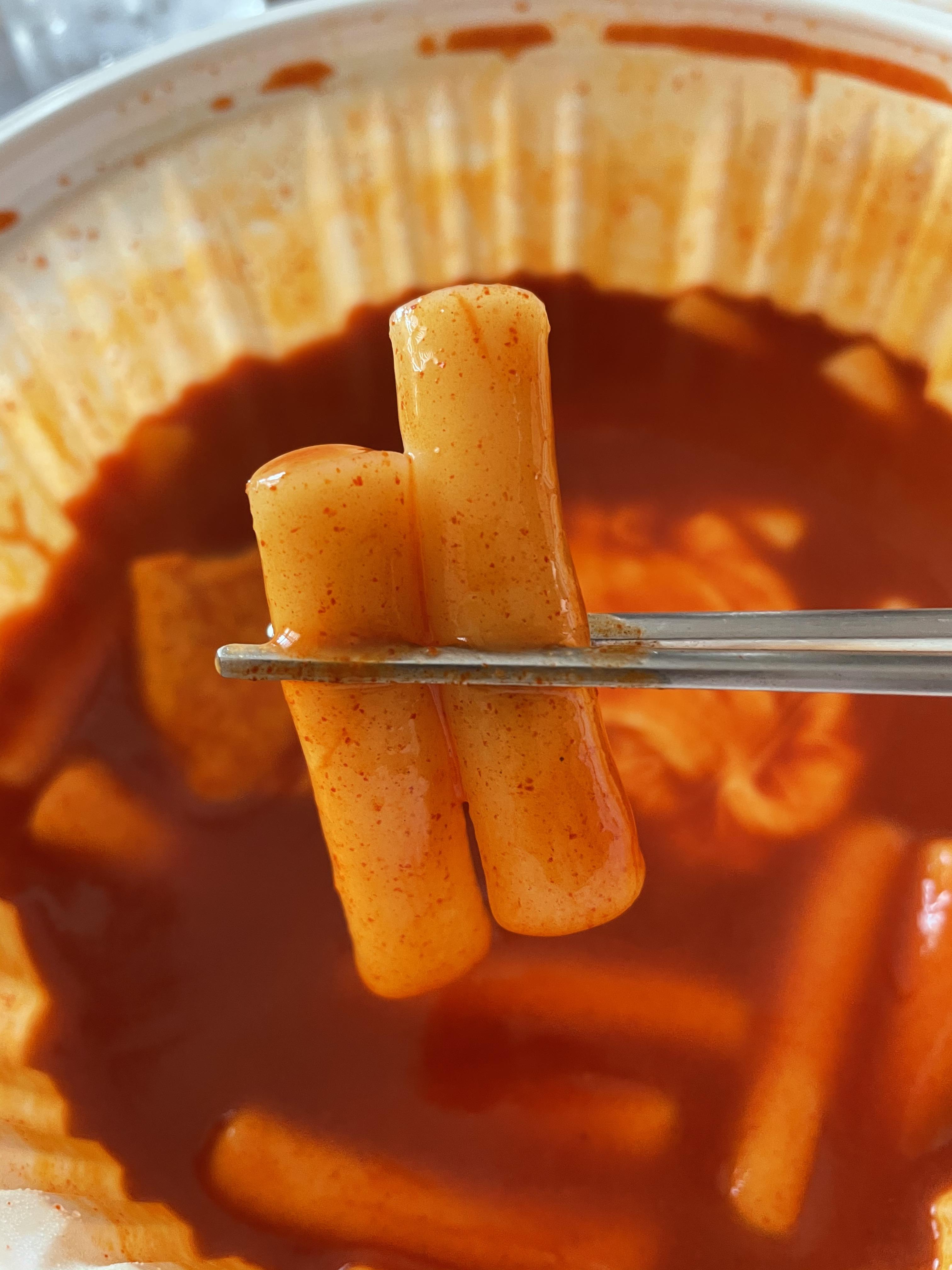 떡은 밀떡이고, 짧고 깔끔한 형태입니다. 맛있었어요! 소스는 달달하면서 약간 초딩입맛이 정말 좋아할 맛입니다. 약간 매운 편이었어요. 하지만 엽떡처럼 속이 쓰리거나 하진 않았어요. 맛있게 매운맛이었어요. 어린이가 먹기에는 매울 것 같네요.
