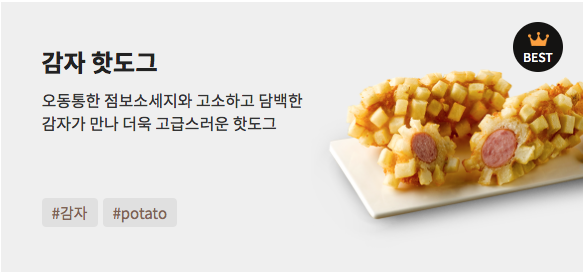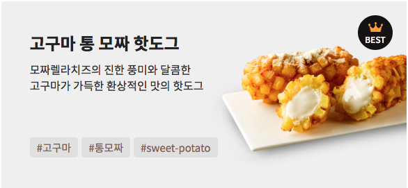 고구마통모짜는 겉이 깍둑썰기 된 고구마로 둘러싸여 있고, 속은 소시지 대신 모짜렐라 치즈가 가득차 있는 핫도그입니다. 단짠의 환상의 조합이죠. 떡볶이 소스에 찍어먹으니 참 맛있긴 했는데, 저는 아무래도 떡볶이랑 같이 먹는 핫도그는 기본 핫도그가 제일 맛있는 것 같아요.