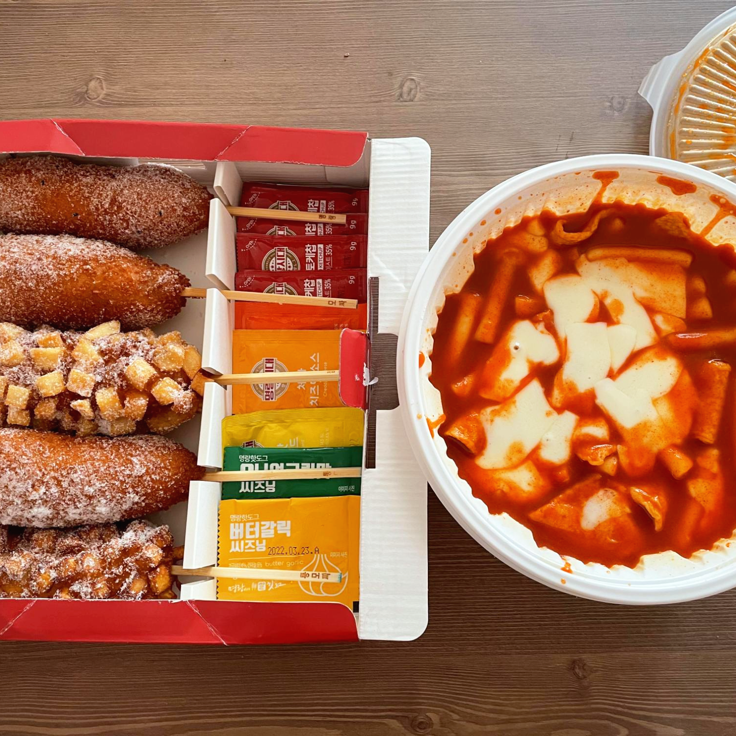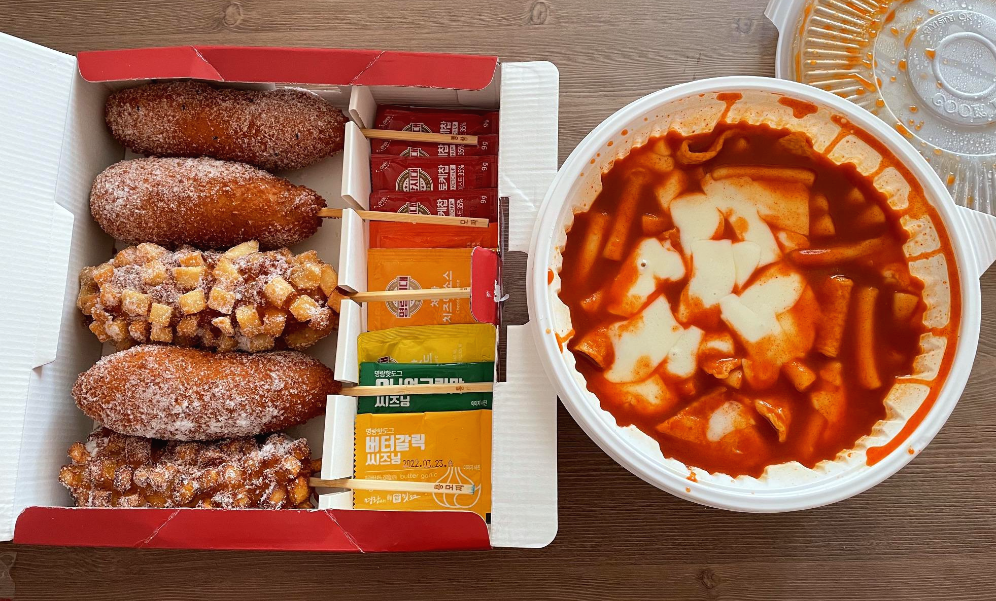 핫도그 박스와 떡볶이입니다. 일회용품은 안주셔도 된다고 말씀드리고 안 받았어요.