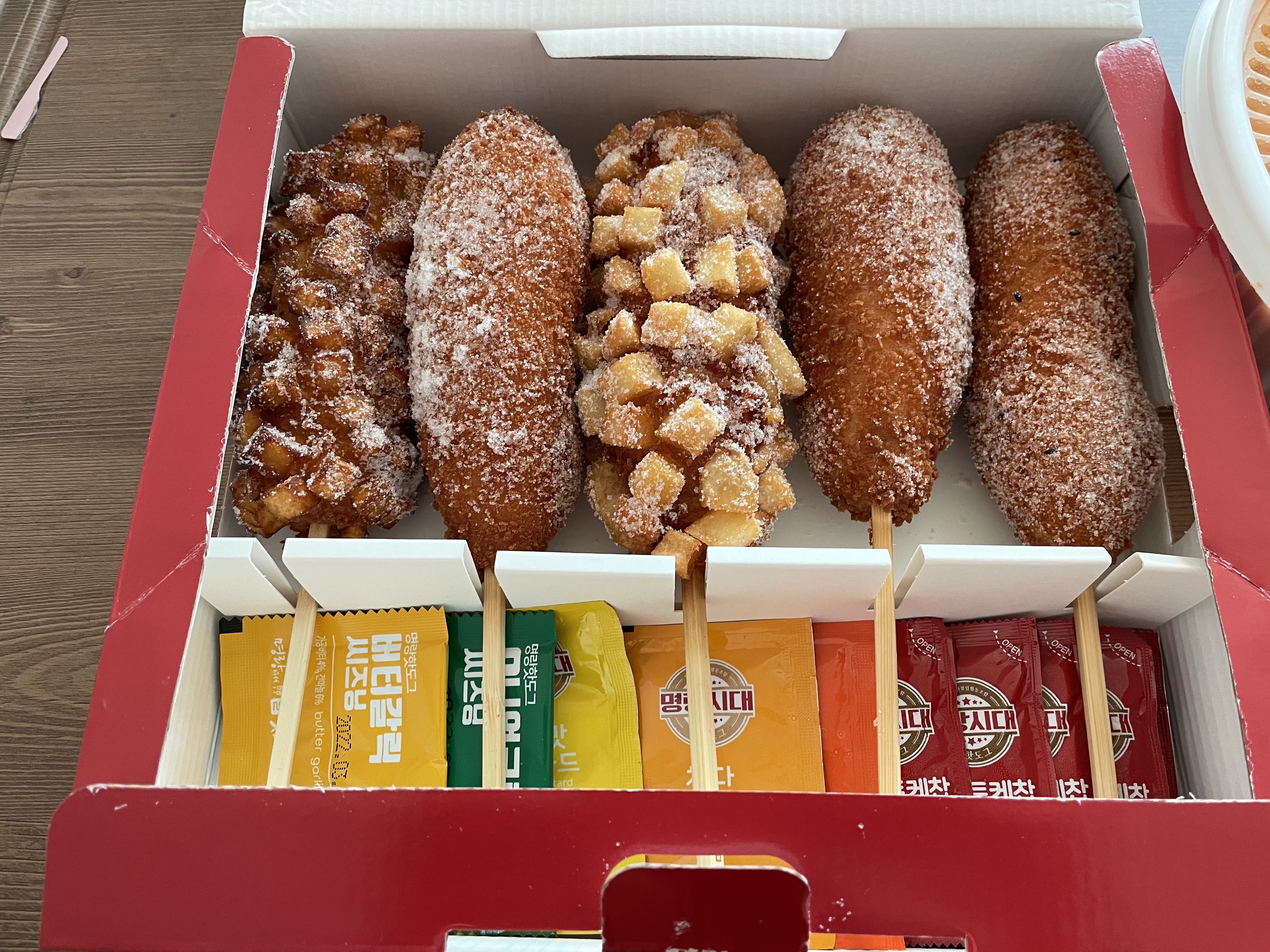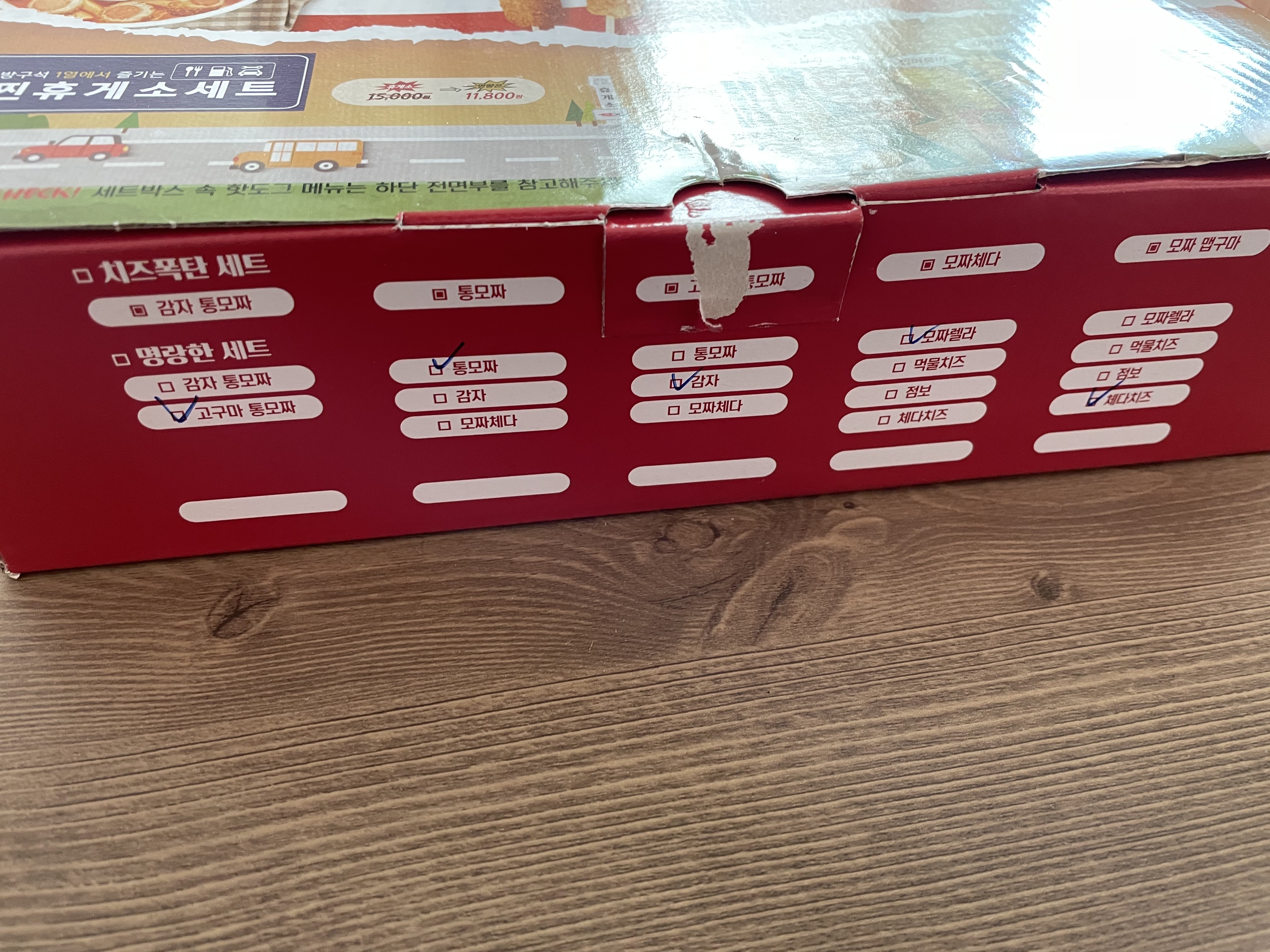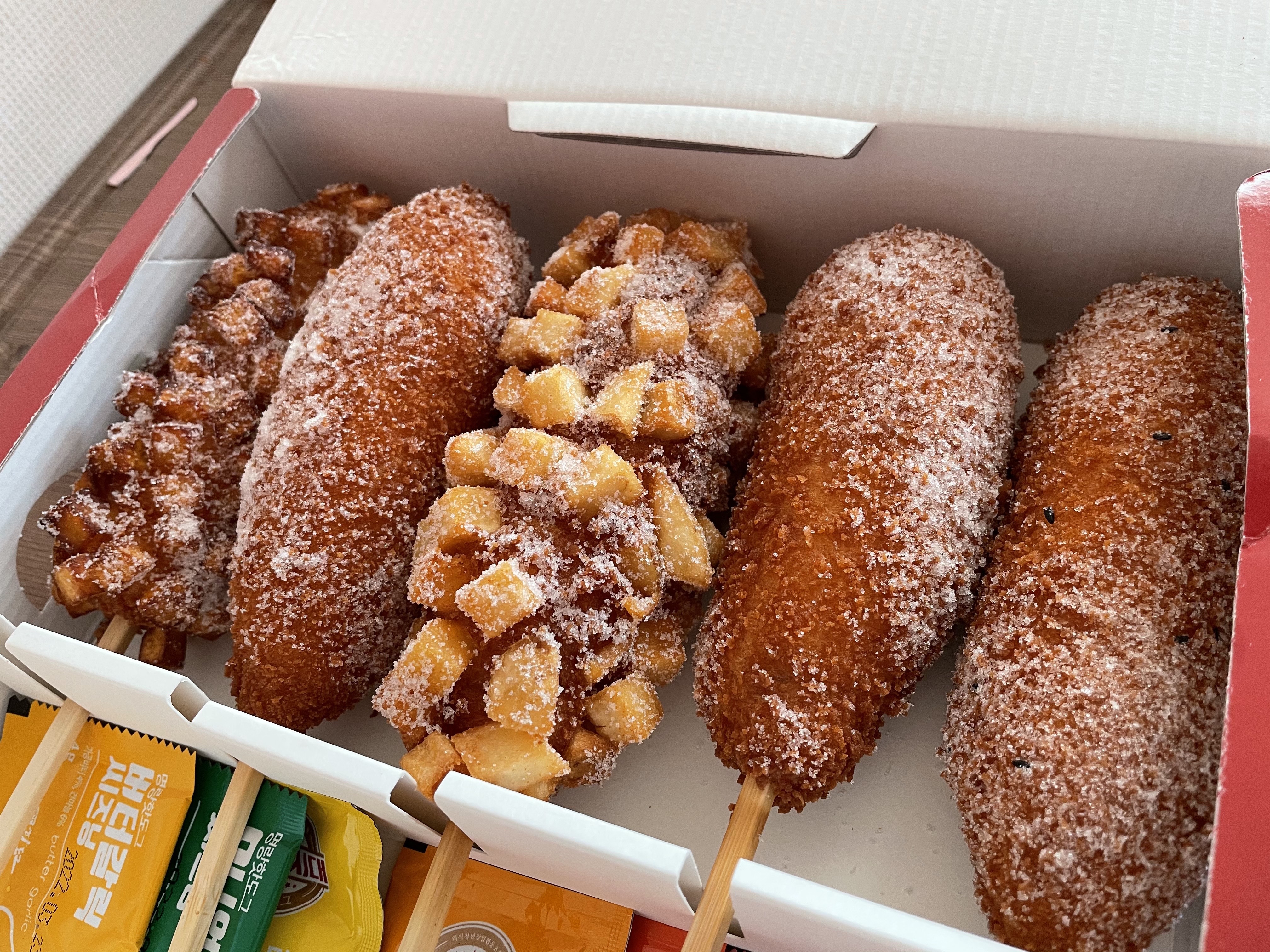 고구마 통모짜, 통모짜, 모짜, 체다치즈, 감자 핫도그입니다. 지금 보면 무슨 치즈에 환장한 사람 같네요. 급하게 선택하느라 현명하게 고르지 못한 게 아쉬워요. 다시 돌아가서 선택을 하라면 저는 통모짜 대신 점보핫도그를 골랐을 것 같아요.