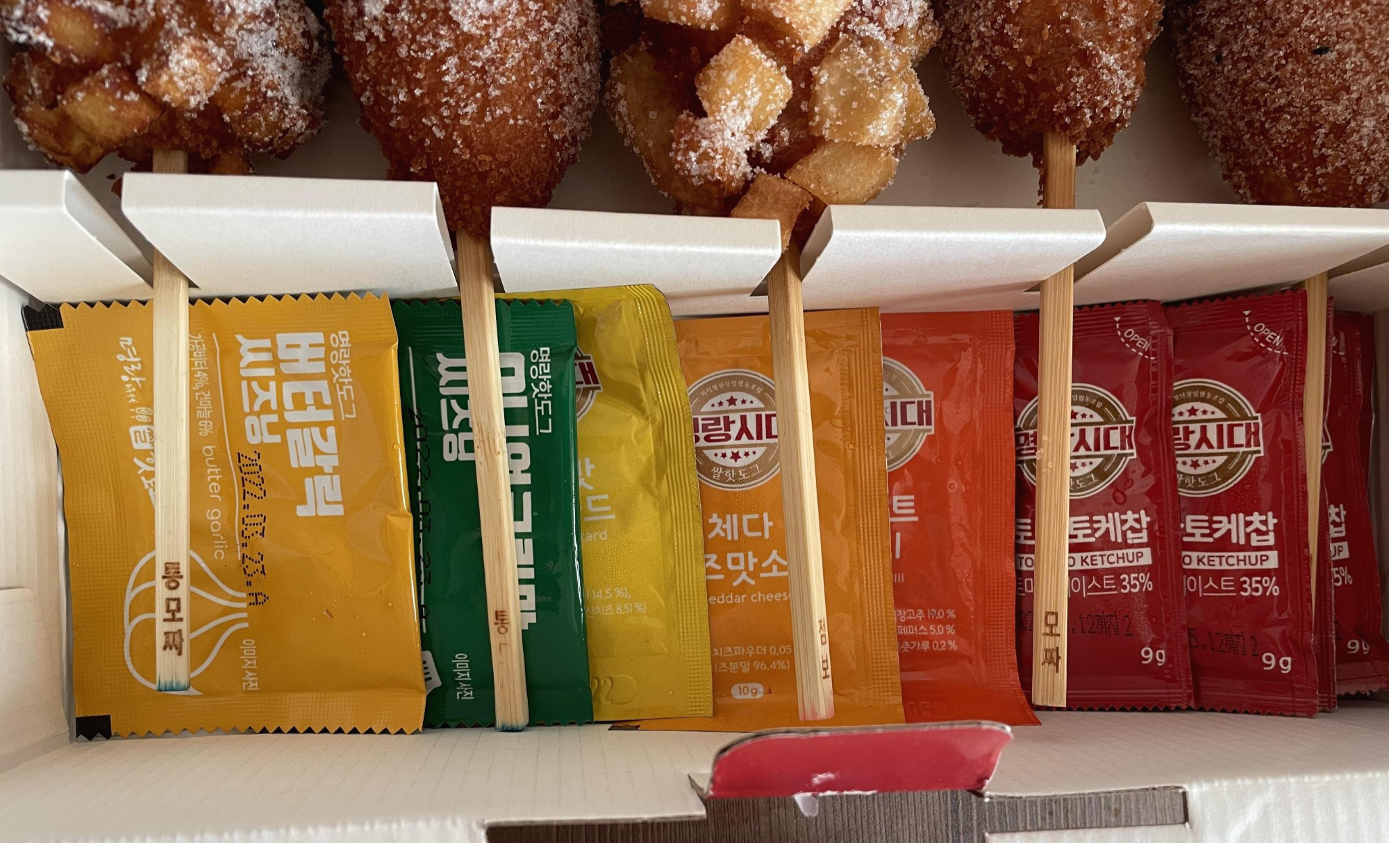 이렇게 아래에는 버터갈릭/어니언크림 씨즈닝, 스위트칠리, 치즈맛머스타드, 체다치즈맛 소스와 케첩 5개가 들어있었어요.