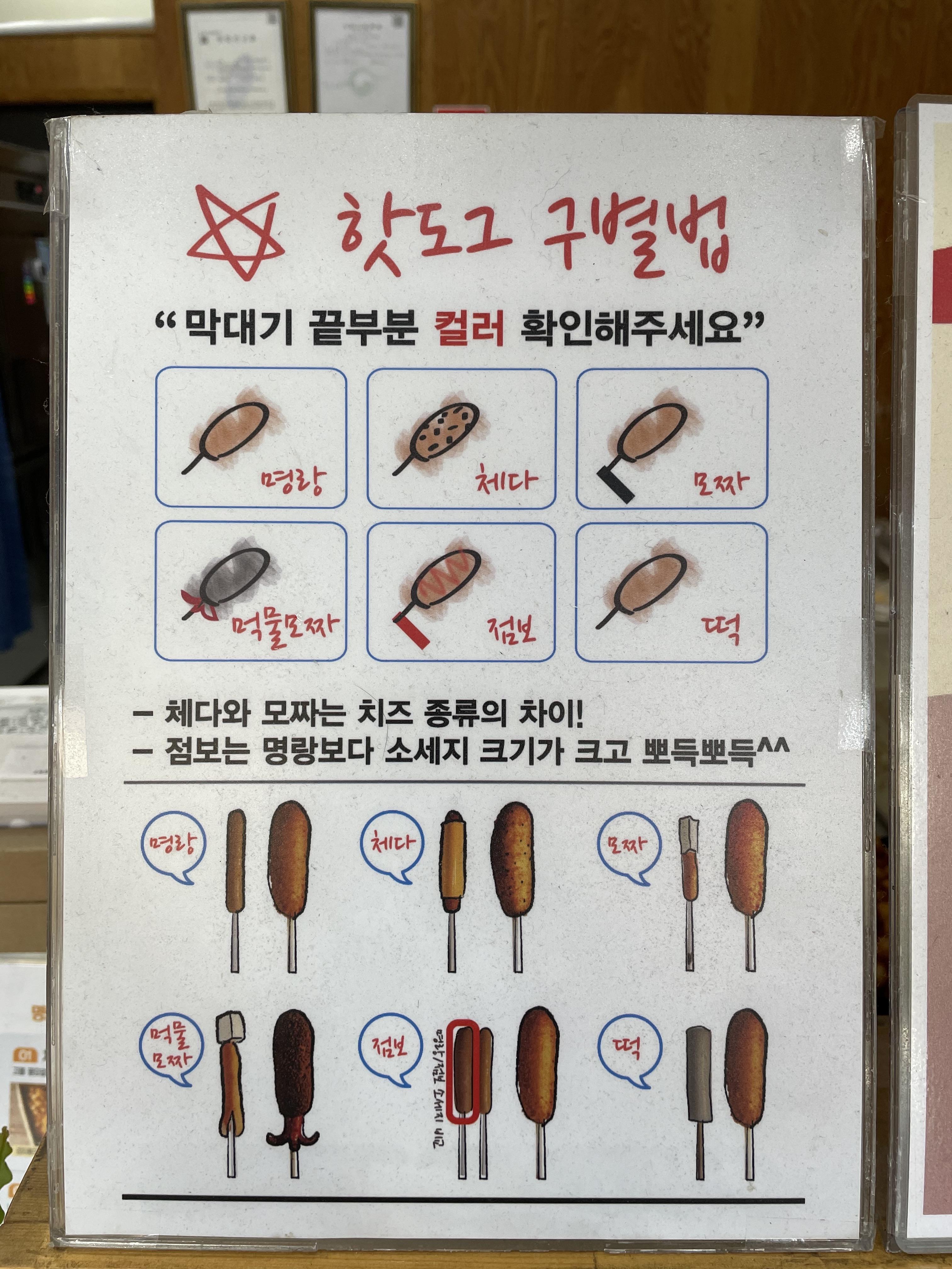 매장 내 있는 핫도그 구별법이에요. 하도 핫도그의 종류가 많아서 꼭 구별할 수 있는 방법이 필요한 것 같아요. 나중에 보니 막대기 끝에 무슨 종류인지 글씨가 적혀 있어서 좋았어요!