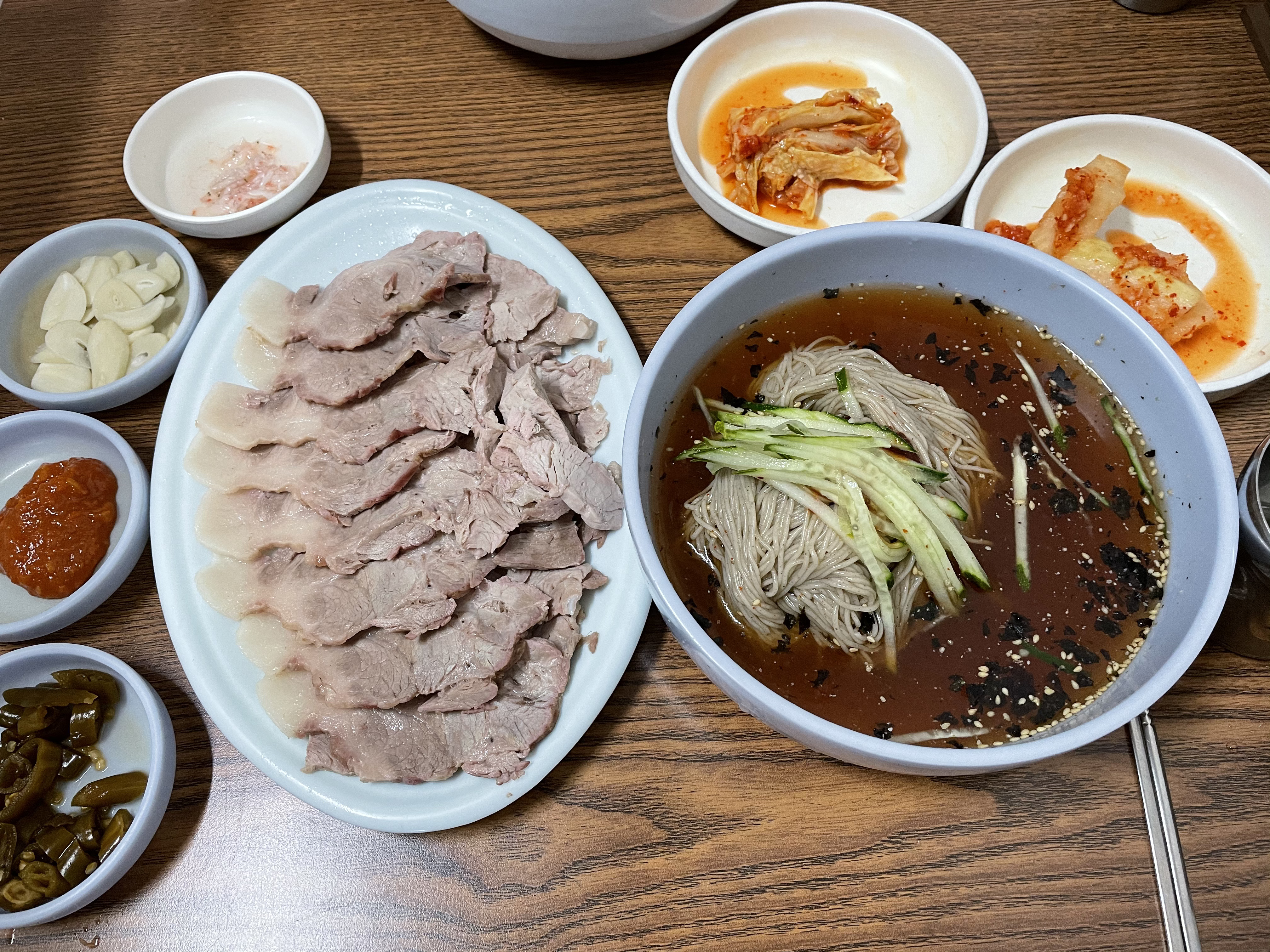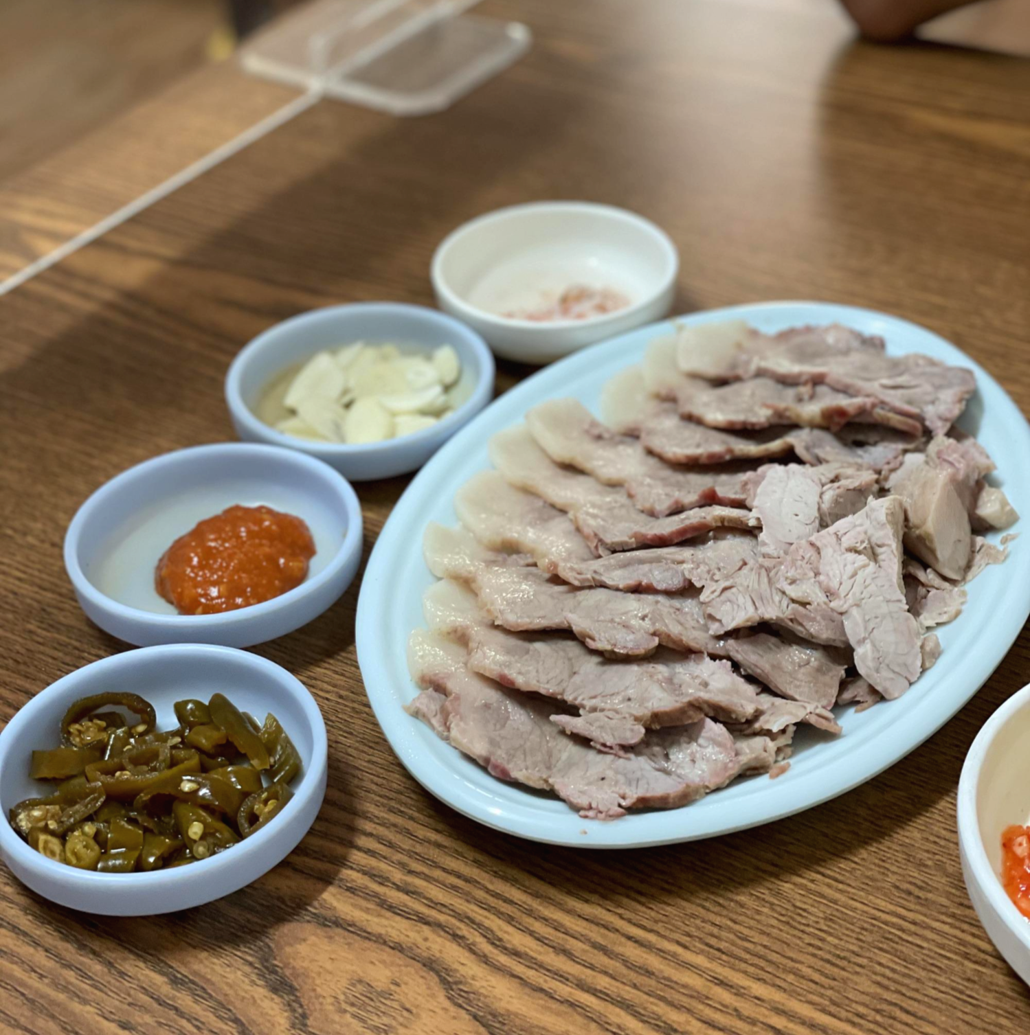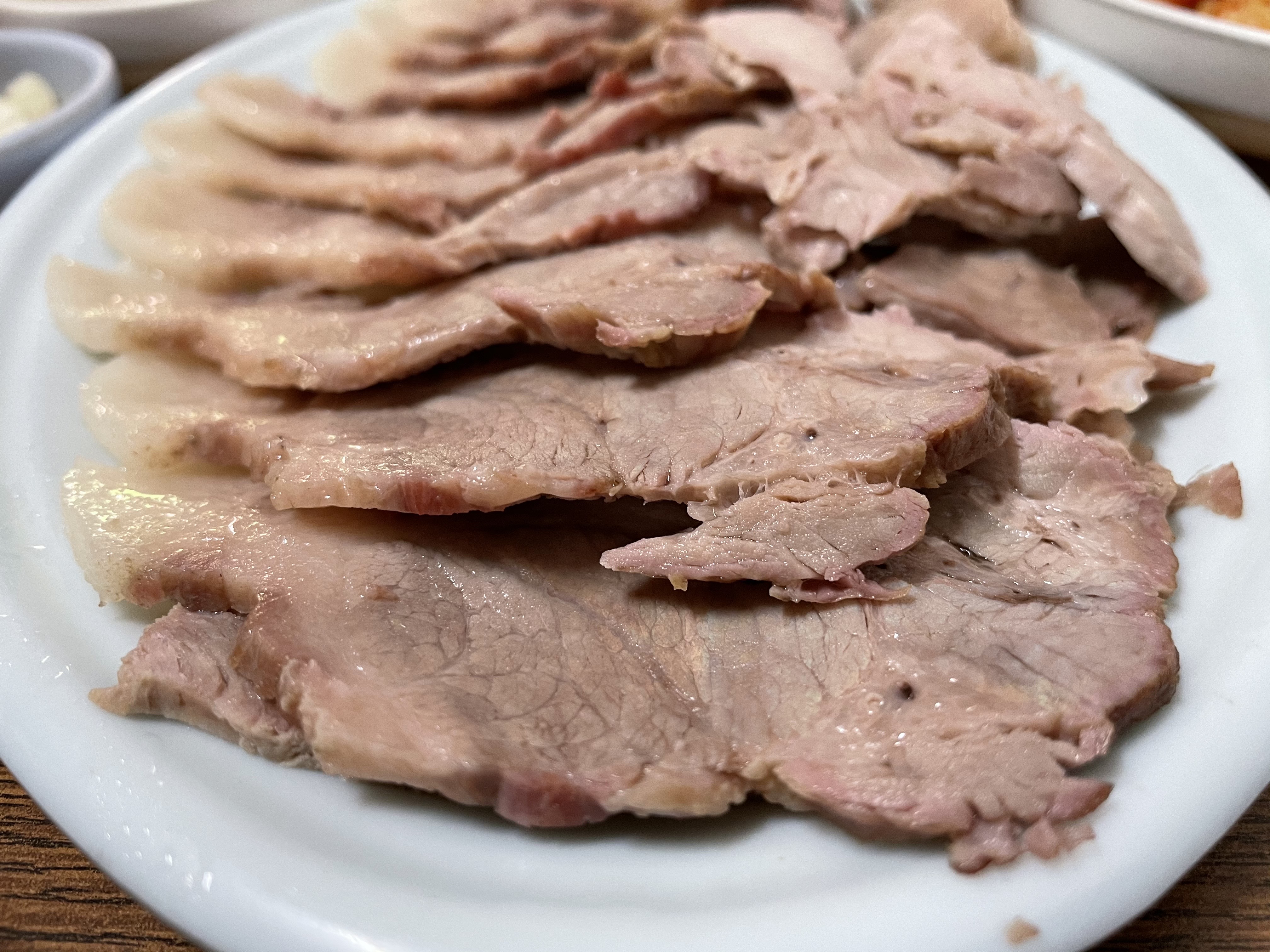 편육은 굉장히 얇게 썰어져서 먹기 편했어요. 저는 개인적으로 쌈장에 찍어먹는 게 제일 맛있었어요. 뜨거운 김이 살짝 식으니 끝에 미세한 잡내가 나긴 했지만 거슬릴 정도는 아니었습니다.