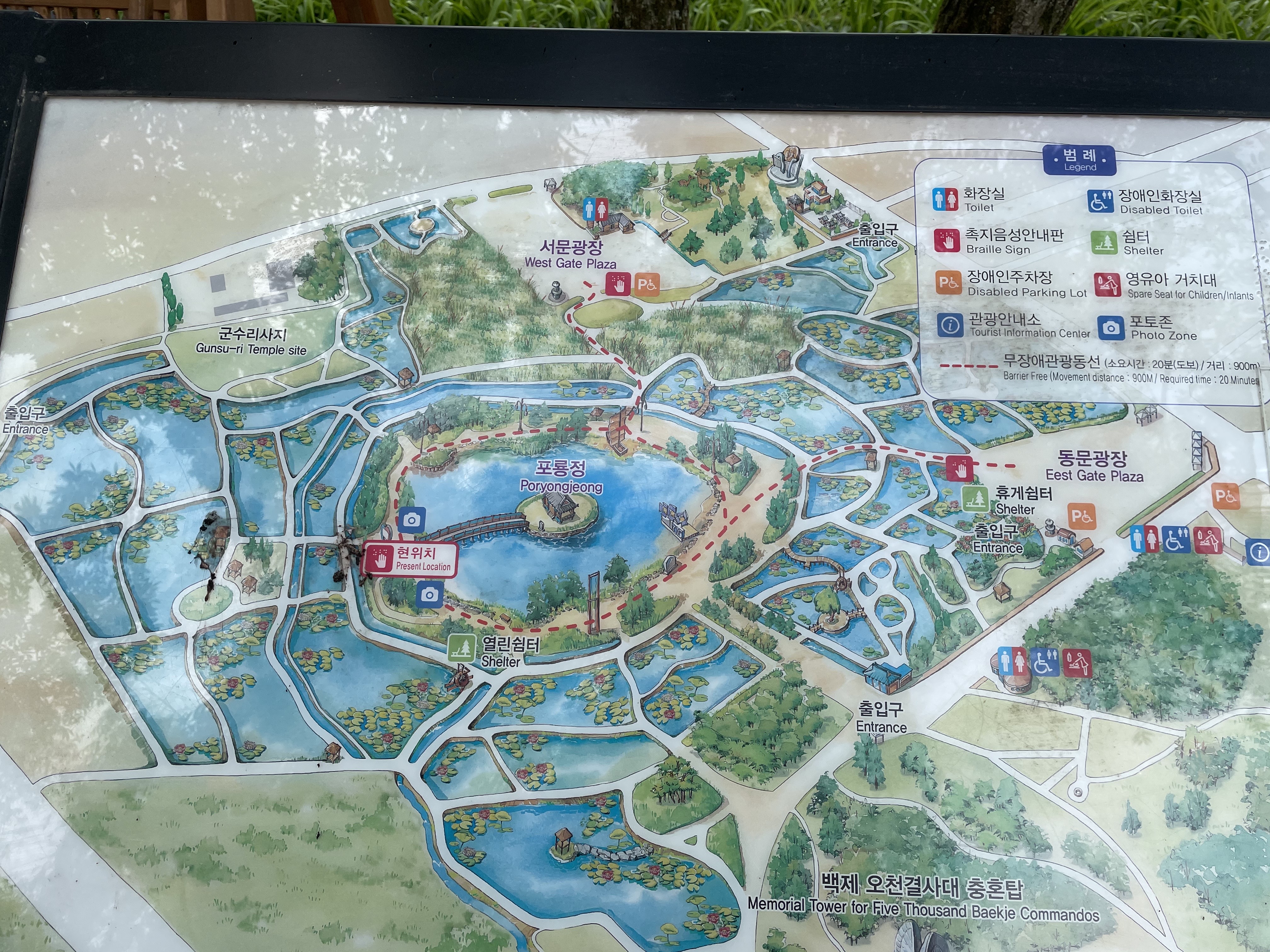 궁남지 지도입니다. 저희는 동문광장에 주차했는데, 서문광장이나 동문광장이나 어디서든 들어갈 수 있기 때문에 큰 차이는 없어 보여요.