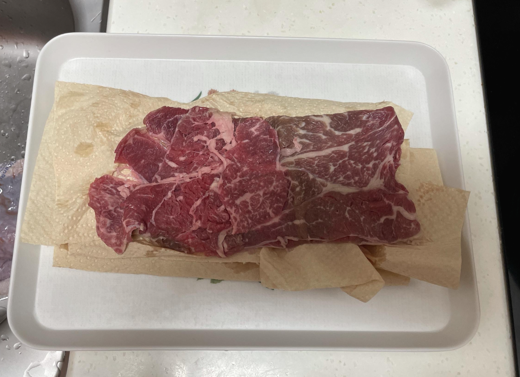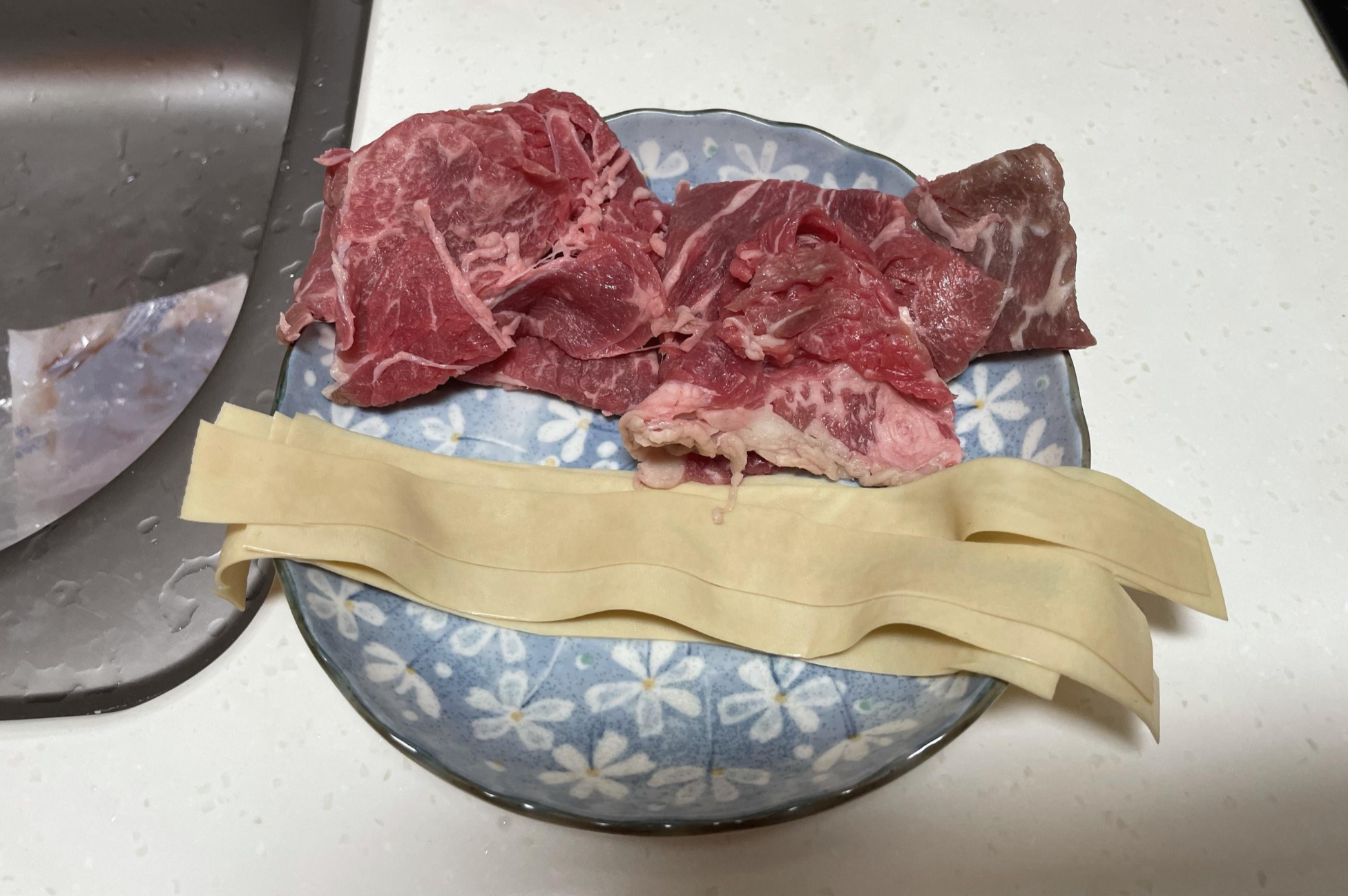 소고기는 키친타월로 핏물을 제거하고 포두부와 함께 잘라둡니다.