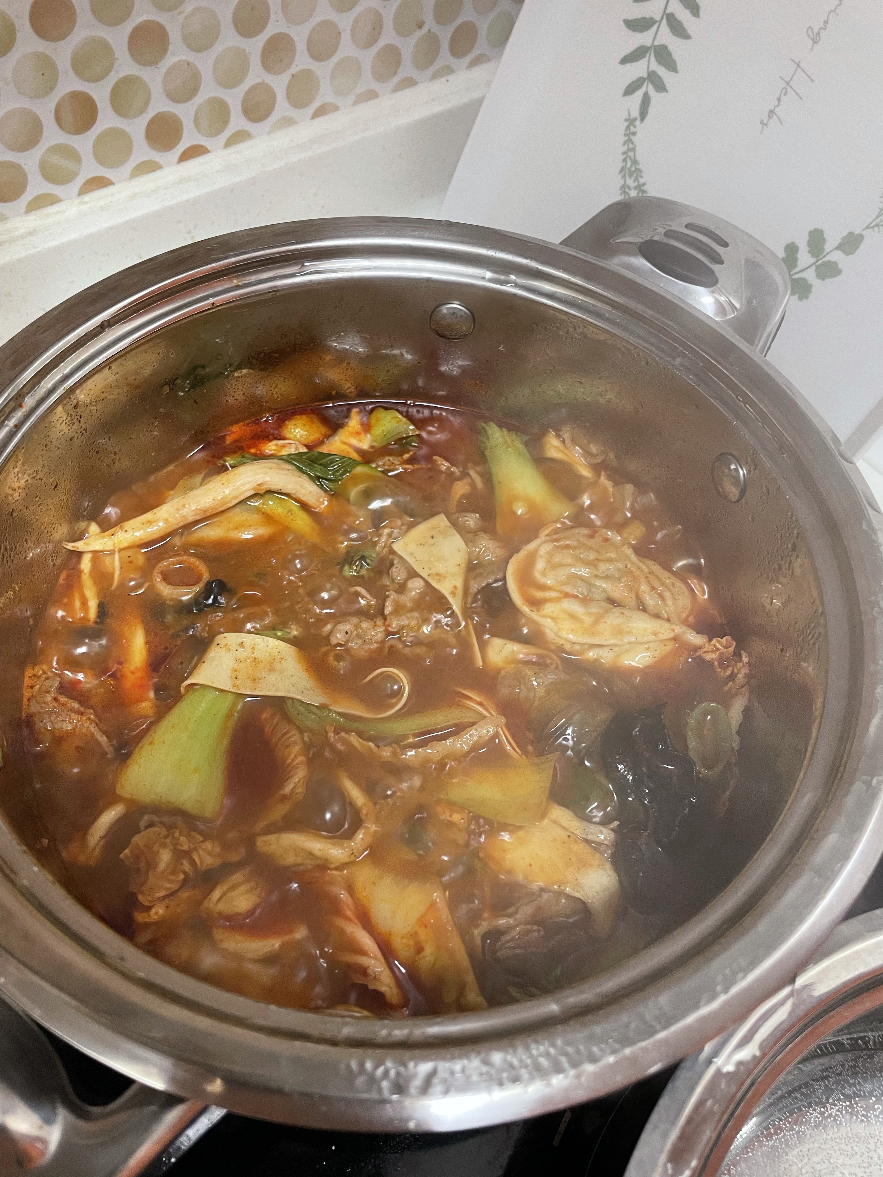 소고기, 느타리/새송이/흑목이버섯, 청경채, 배추, 대파, 포두부, 당면, 고추기름, 마라탕소스, 지마장소스가 들어있습니다.
