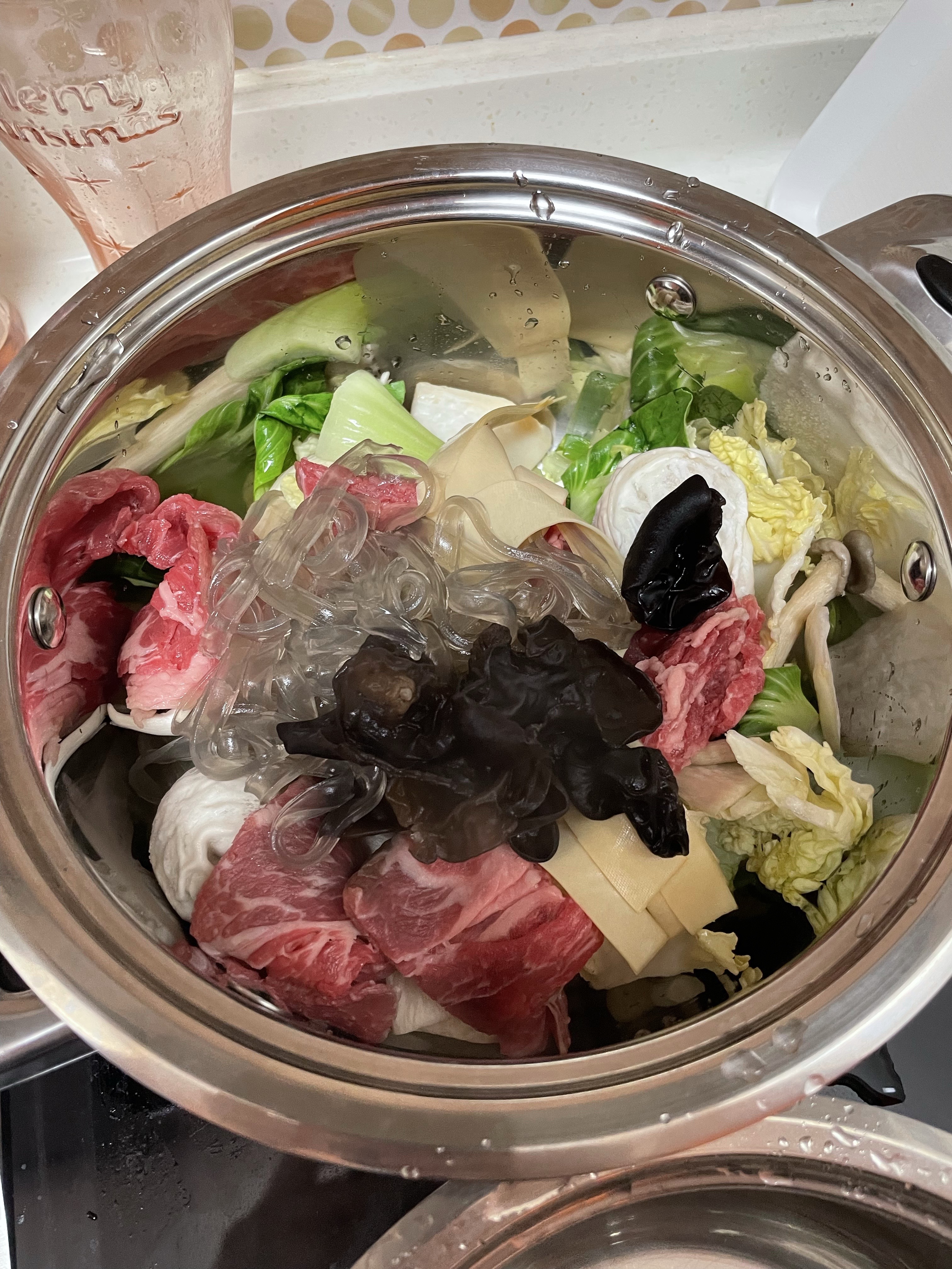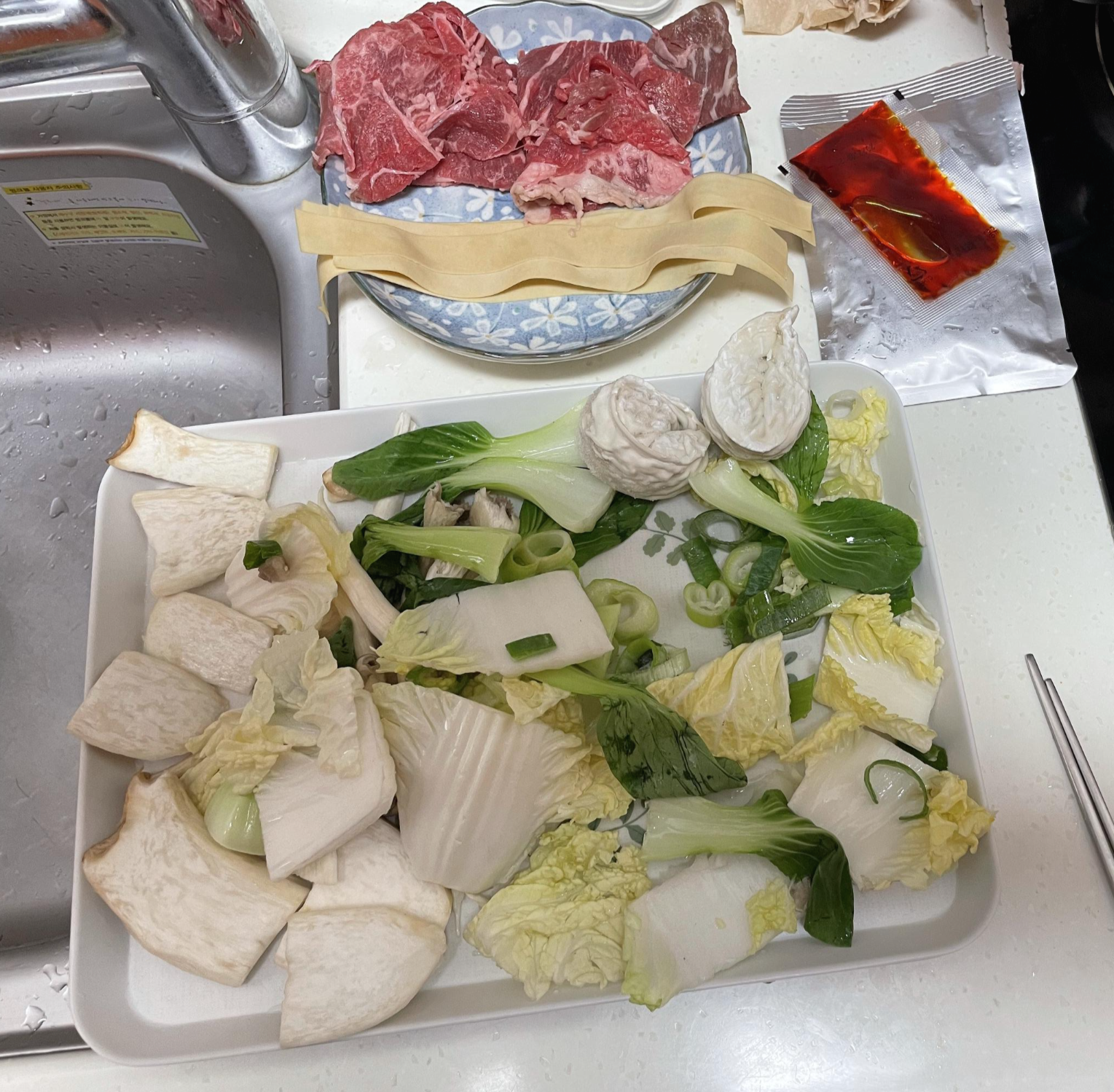 재료를 모두 준비해둡니다. 만두를 넣어 먹으면 맛있다고 해서, 집에 있는 냉동만두도 준비해둡니다.