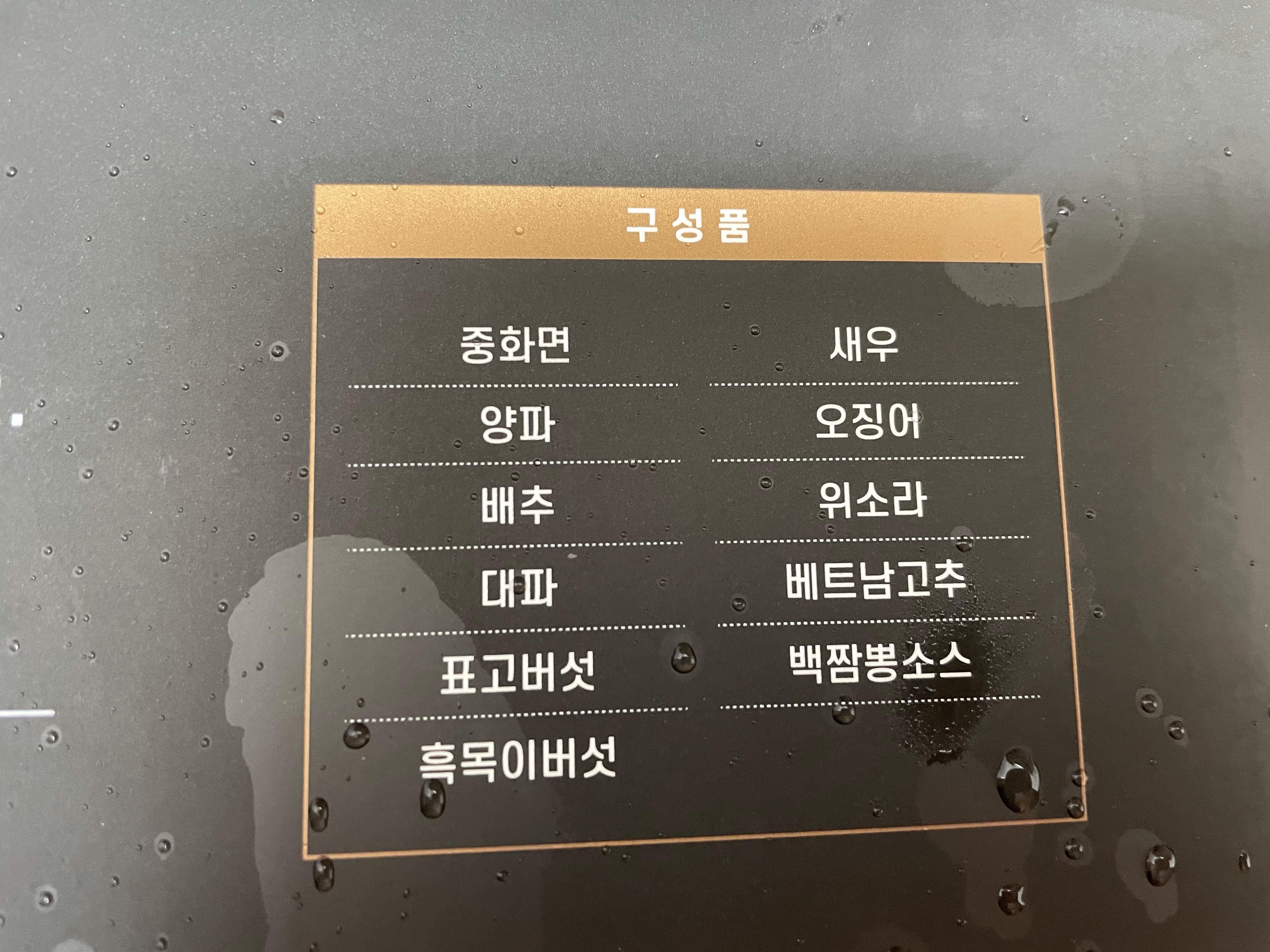 구성품입니다. 중화면, 양파, 배추, 대파, 표고버섯, 흑목이버섯, 새우, 오징어, 위소라, 베트남 고추, 백짬뽕 소스가 들어있네요.