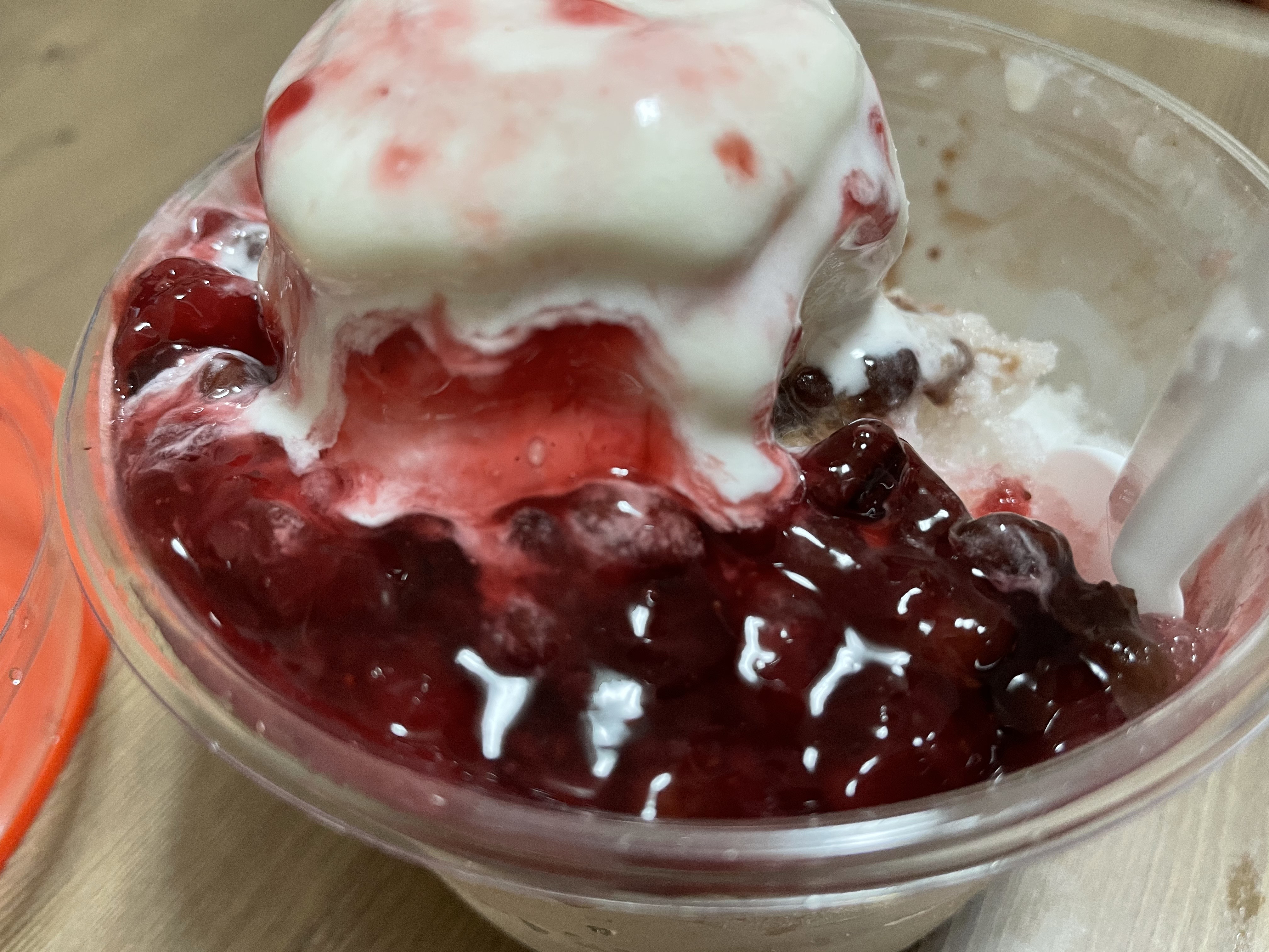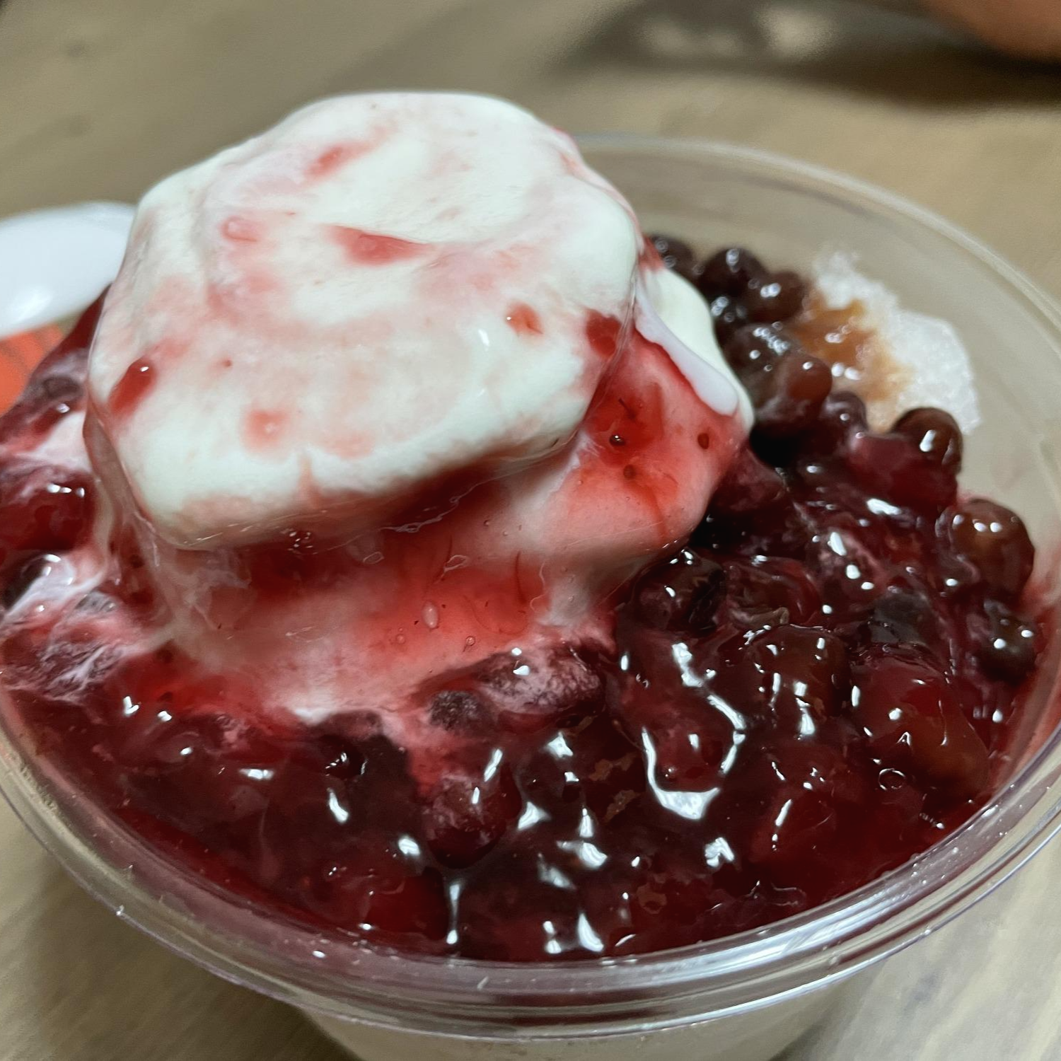 옛날 팥빙수를 재현한 만큼, 우유얼음이 아닌 그냥 얼음에 아이스크림, 통팥과 딸기잼이 들어가 있습니다. 그리고 여기서는 안 보이지만, 밑에 큼직한 떡이 몇 개 들어가 있어요.