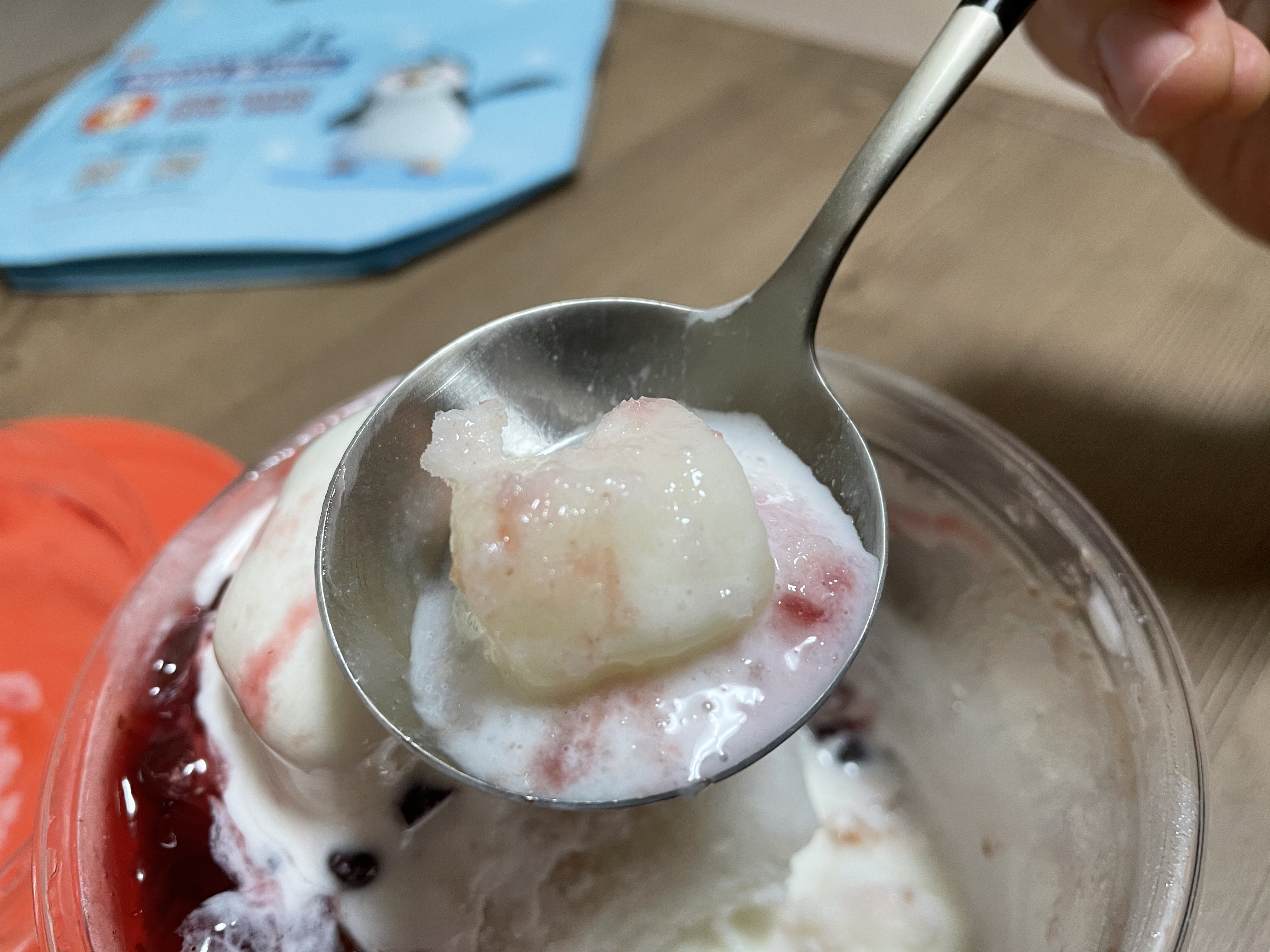 그런데 그런 생각을 철회해야 하나, 라는 생각이 들게끔한게 이 떡이에요. ㅠㅠ 옛날 팥빙수에 들어가던 떡보다는 훨씬 컸는데, 너무 딱딱 끊어지는 식감이었어요. 차라리 예전처럼 손톱만 한 떡을 여러 개 넣어주는 게 훨씬 낫지 않나..? 하는 생각이 들더라구요. 이 떡은 옥에 티였습니다.