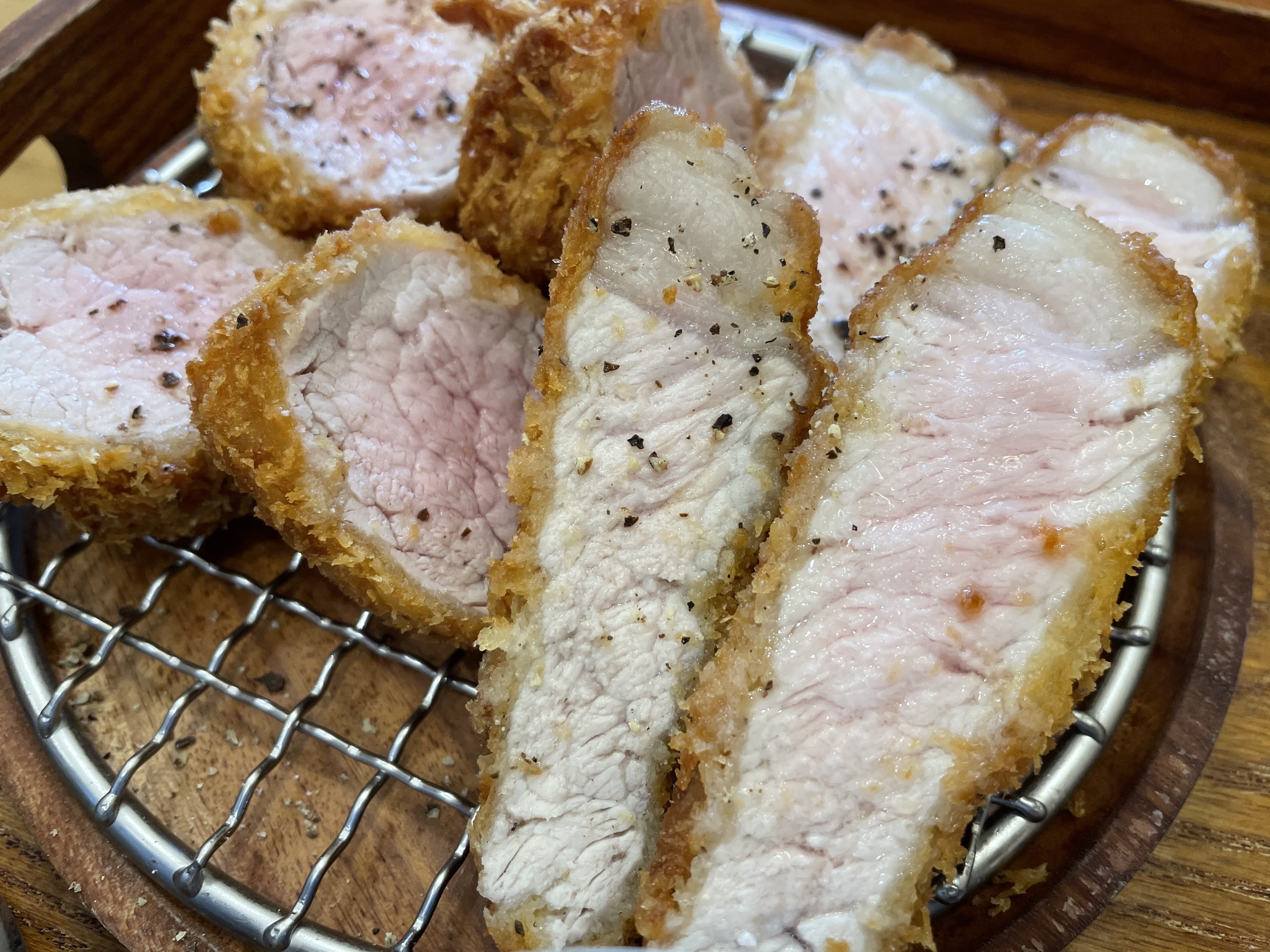 동그란 것이 안심, 길쭉한 것이 등심이에요. 안심은 부드럽고 육즙이 많아 풍미가 좋은 부위고, 등심은 카츠 중에서 가장 많이 사용되는 부위이며, 담백한 맛이 특징이라고 하네요.