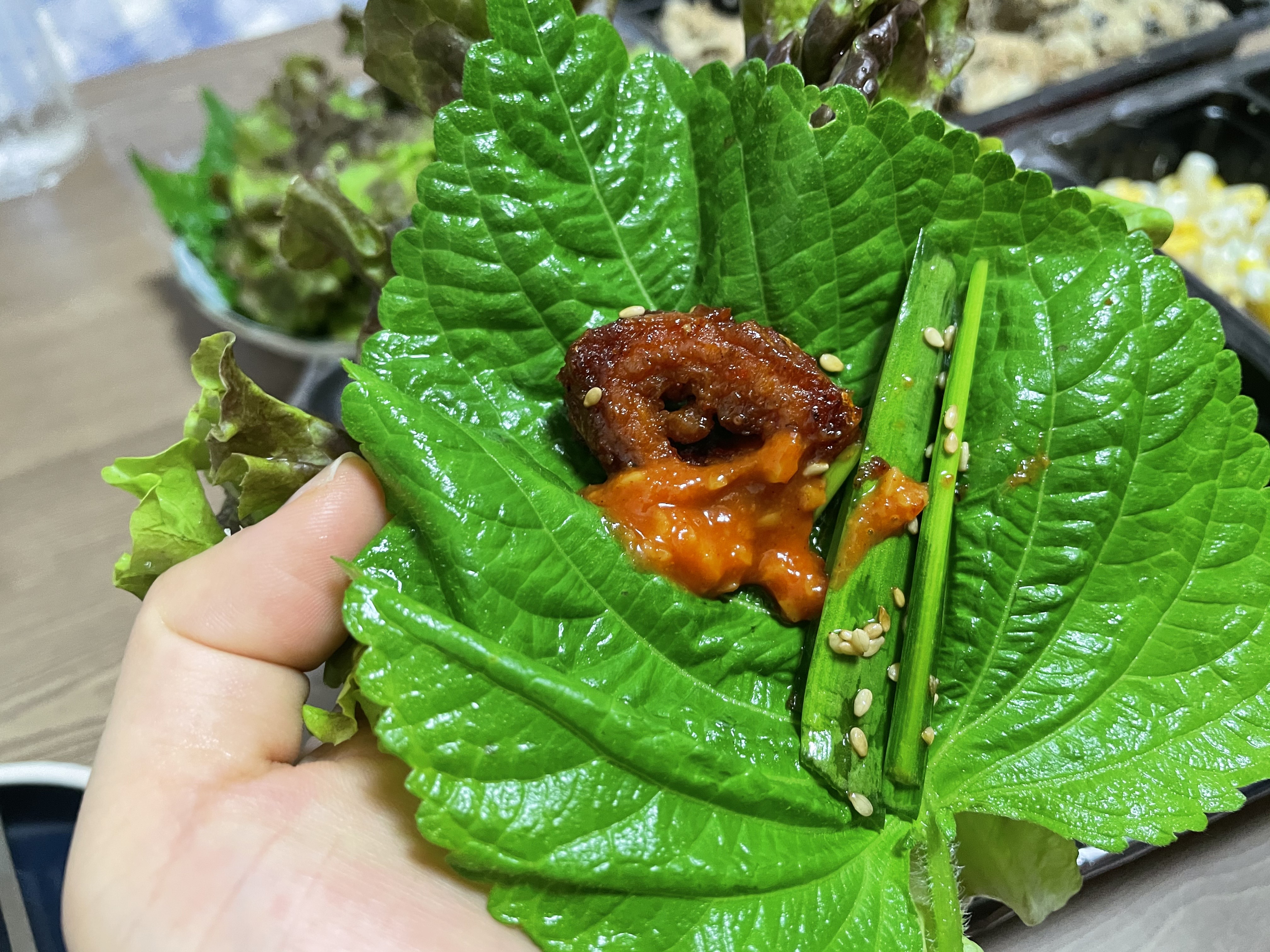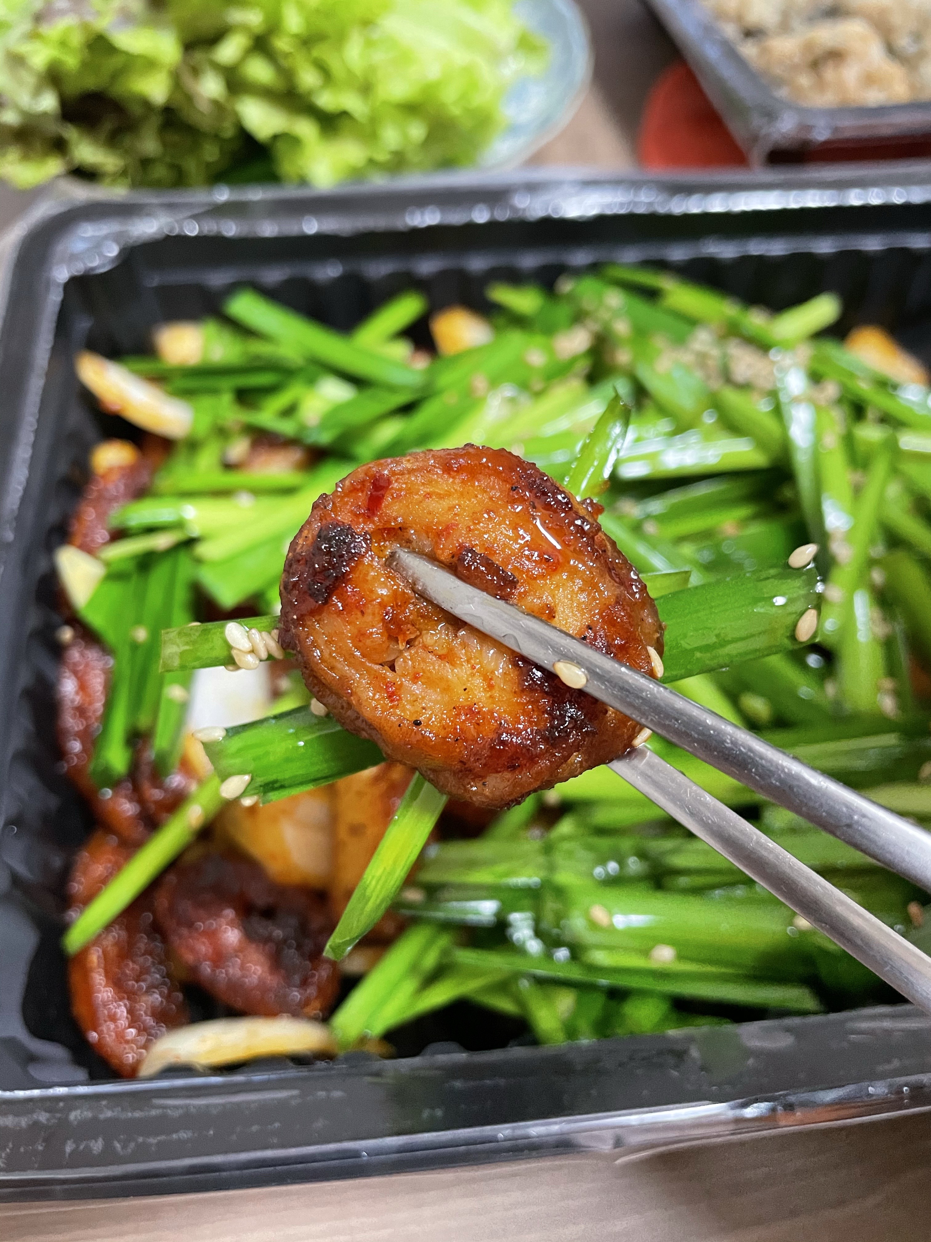 막창은 부추랑 같이 먹는 게 맛있거든요. 상추랑 깻잎도 넉넉히 넣어주셨어요.