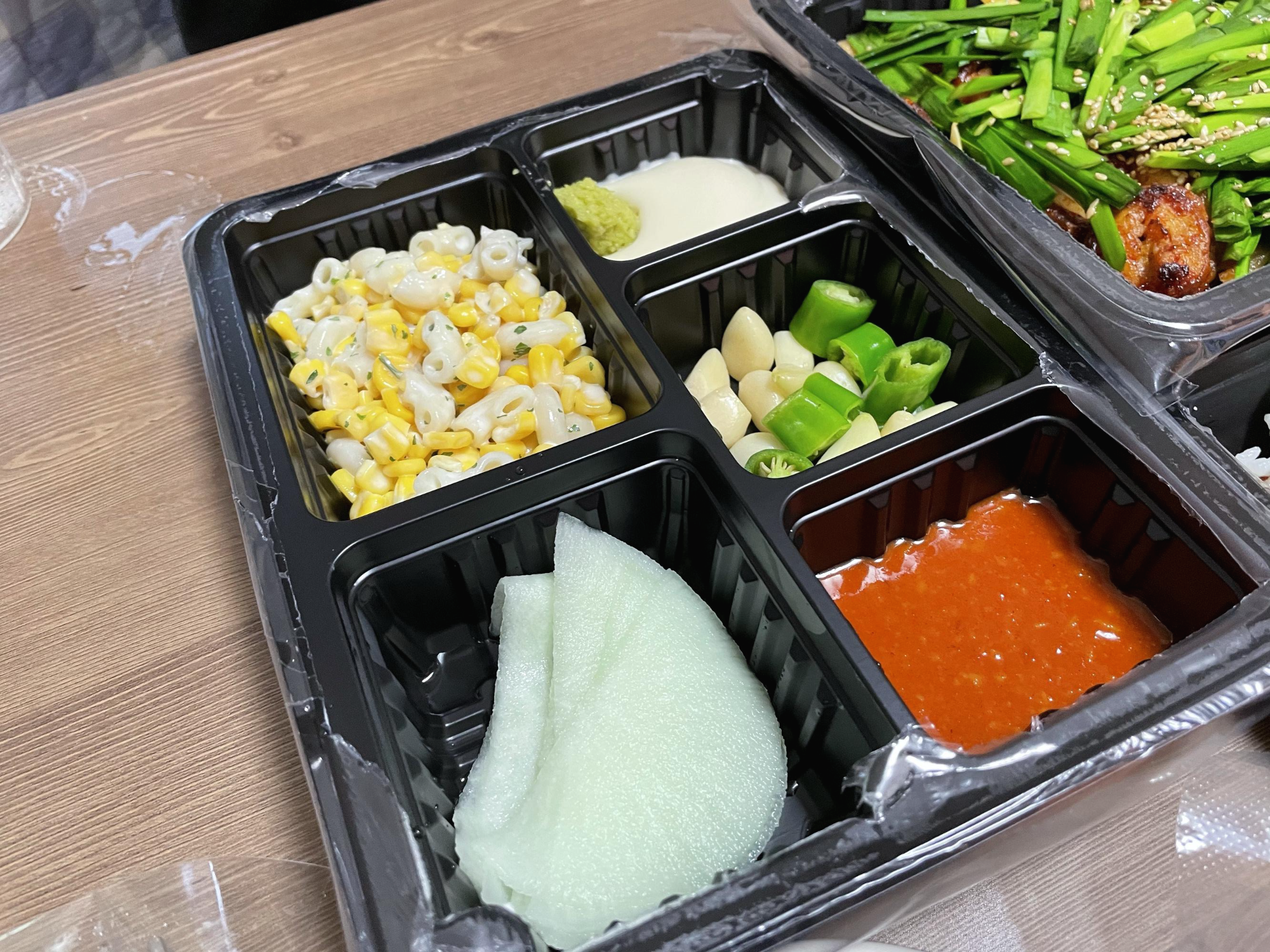 밑반찬은 콘샐러드와 쌈무, 마늘과 고추, 쌈장, 크림소스가 같이 와요. 일행이 콘샐러드 킬러라서 혼자 다 먹는 편이에요.