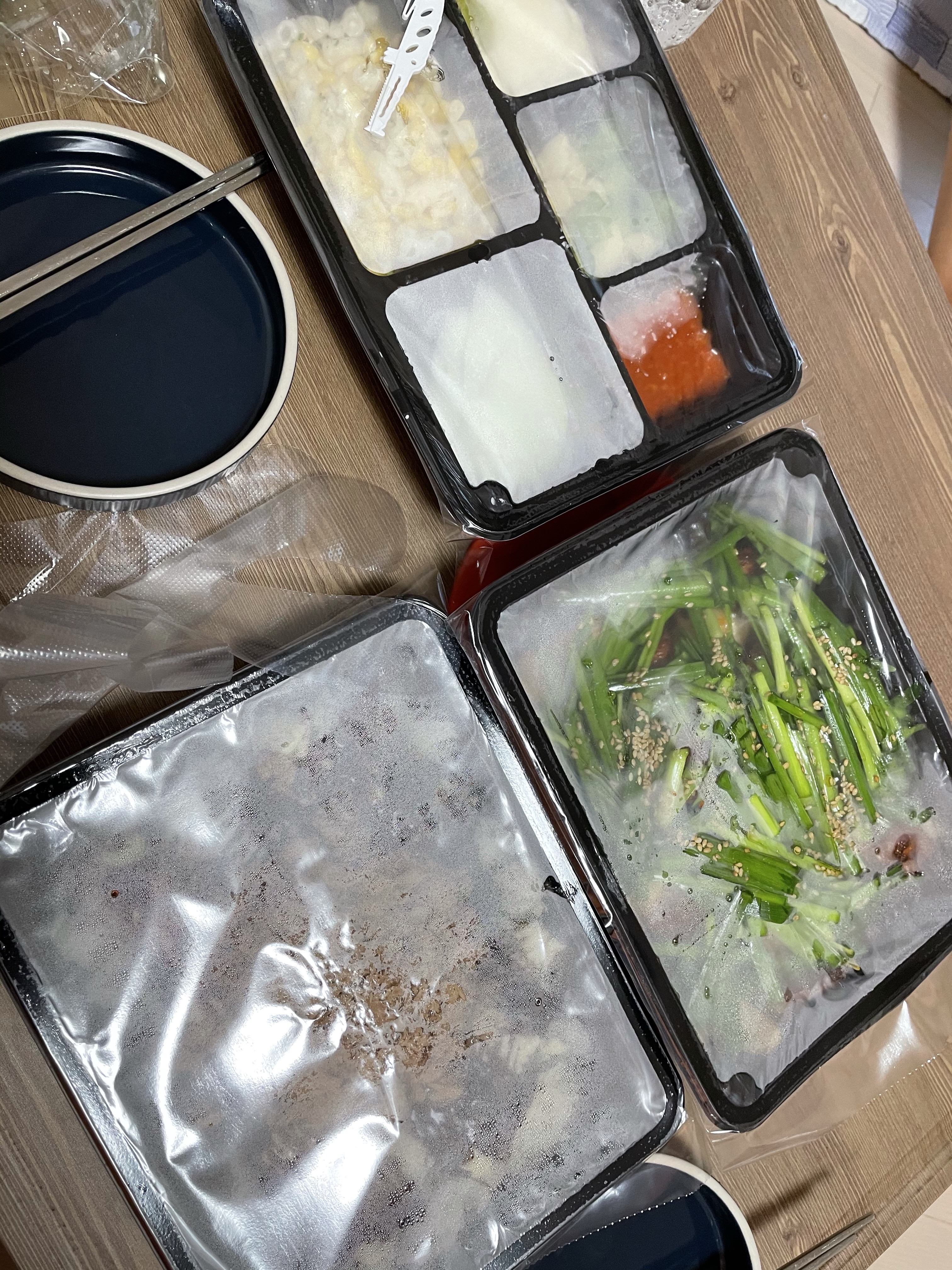 보자기를 풀면 이렇게 층층이 쌓인 도시락들을 볼 수 있어요. 하나는 막창, 하나는 주먹밥, 하나는 반찬들이에요.