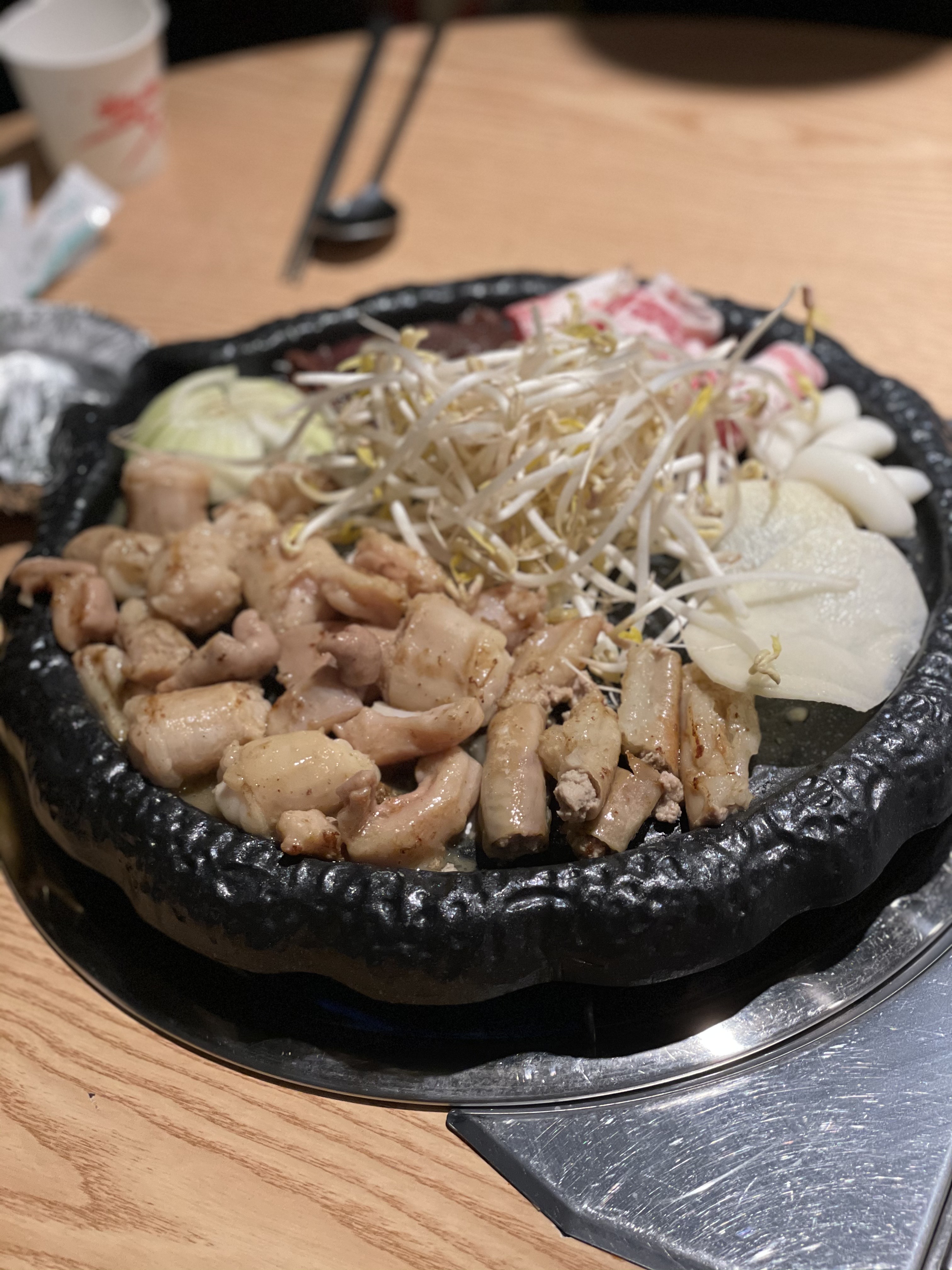 오늘은 곱창전골이 너무 먹고 싶어서 일행네 집 근처에 있는 소곱창집에서 곱창전골을 포장해왔어요.
