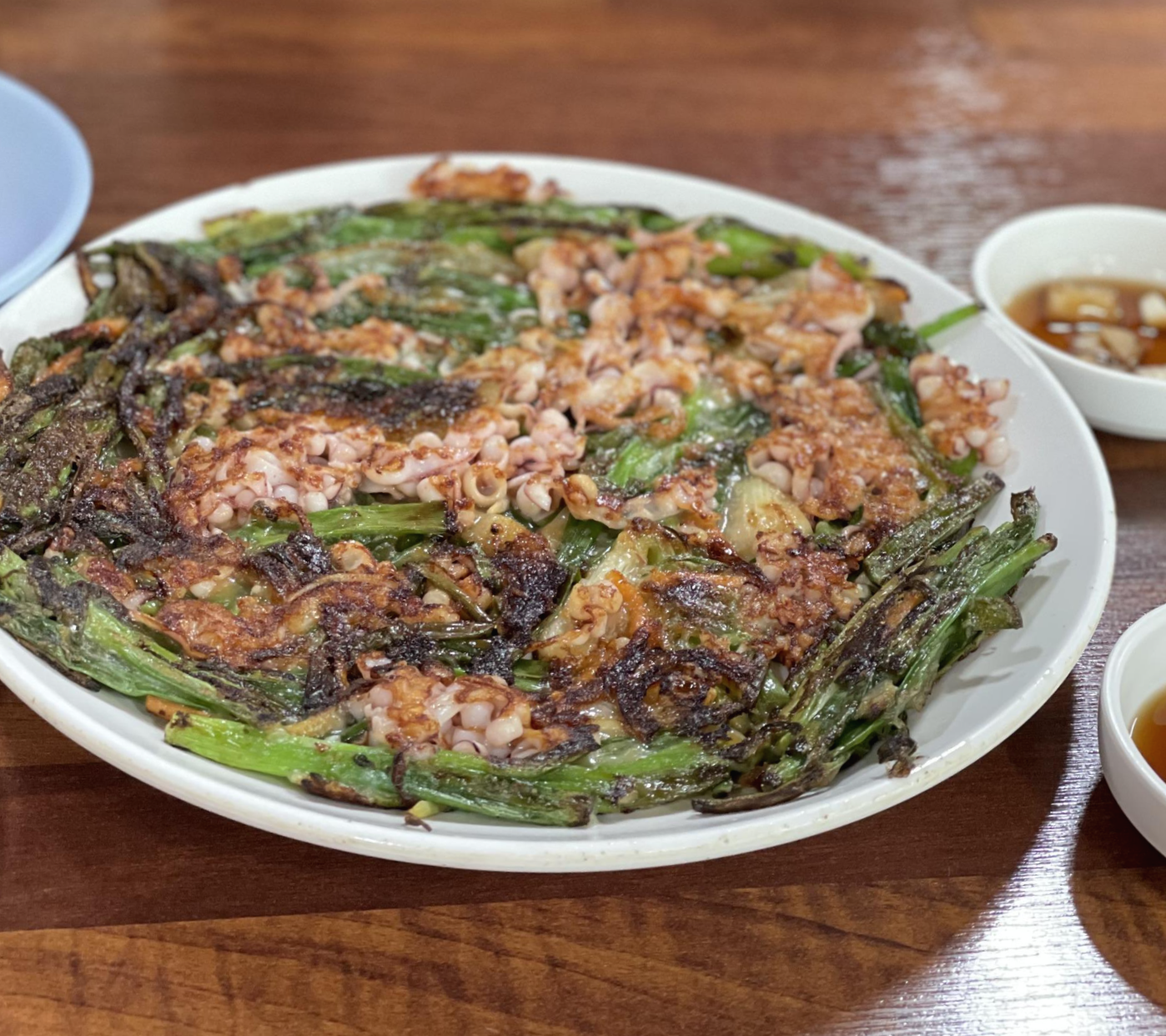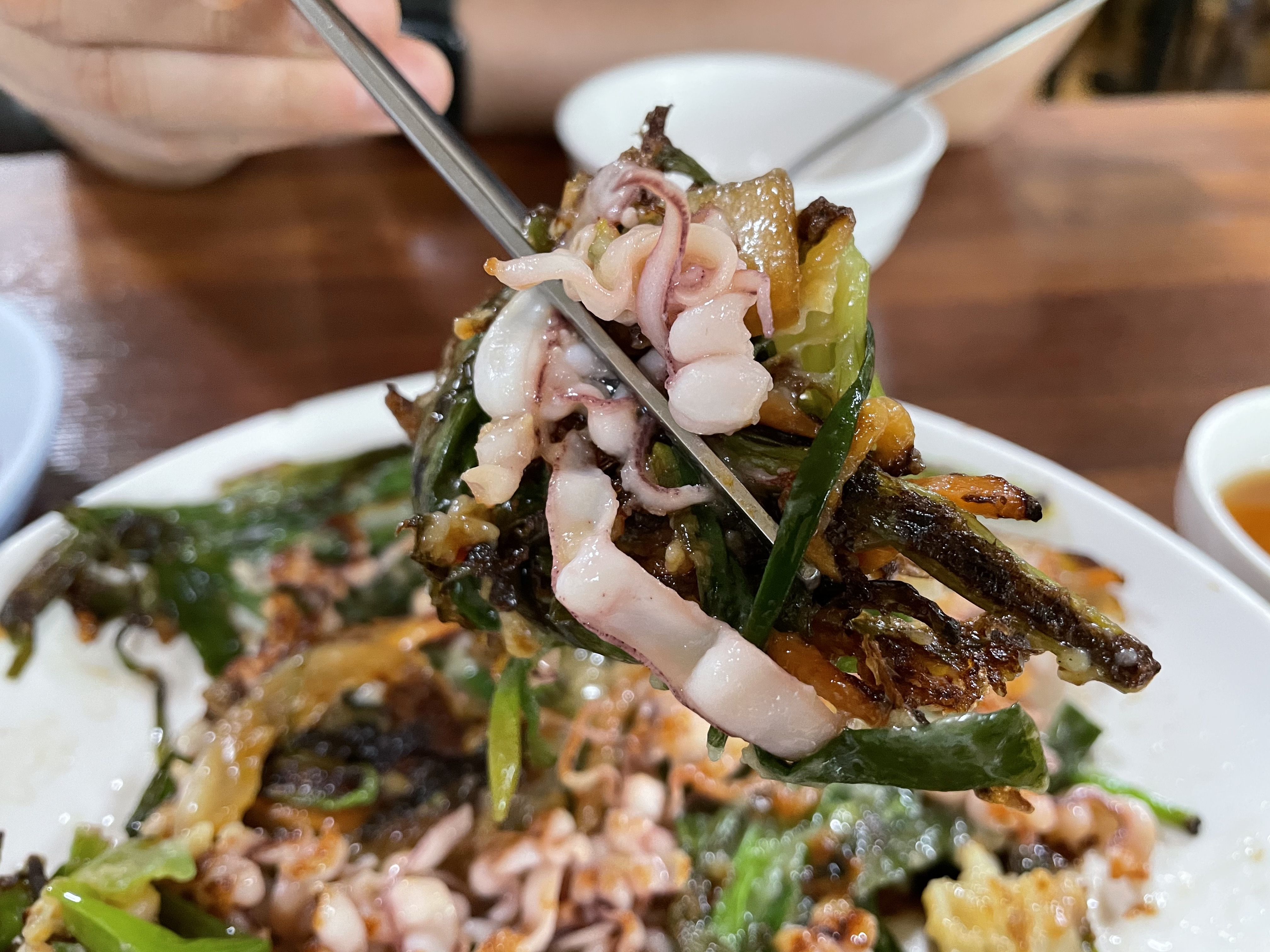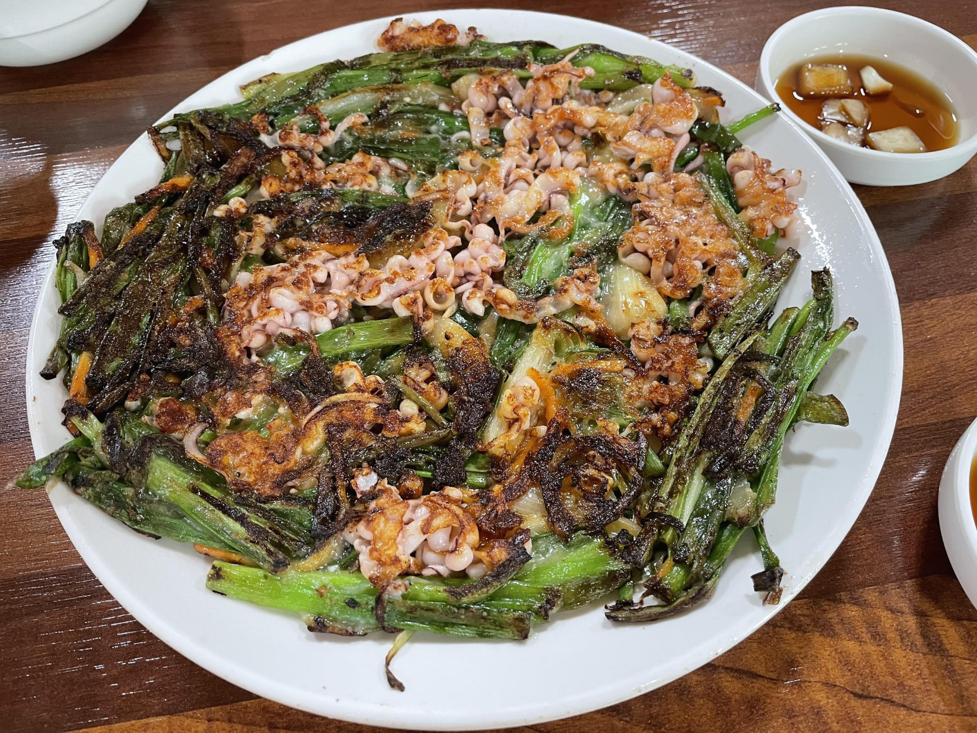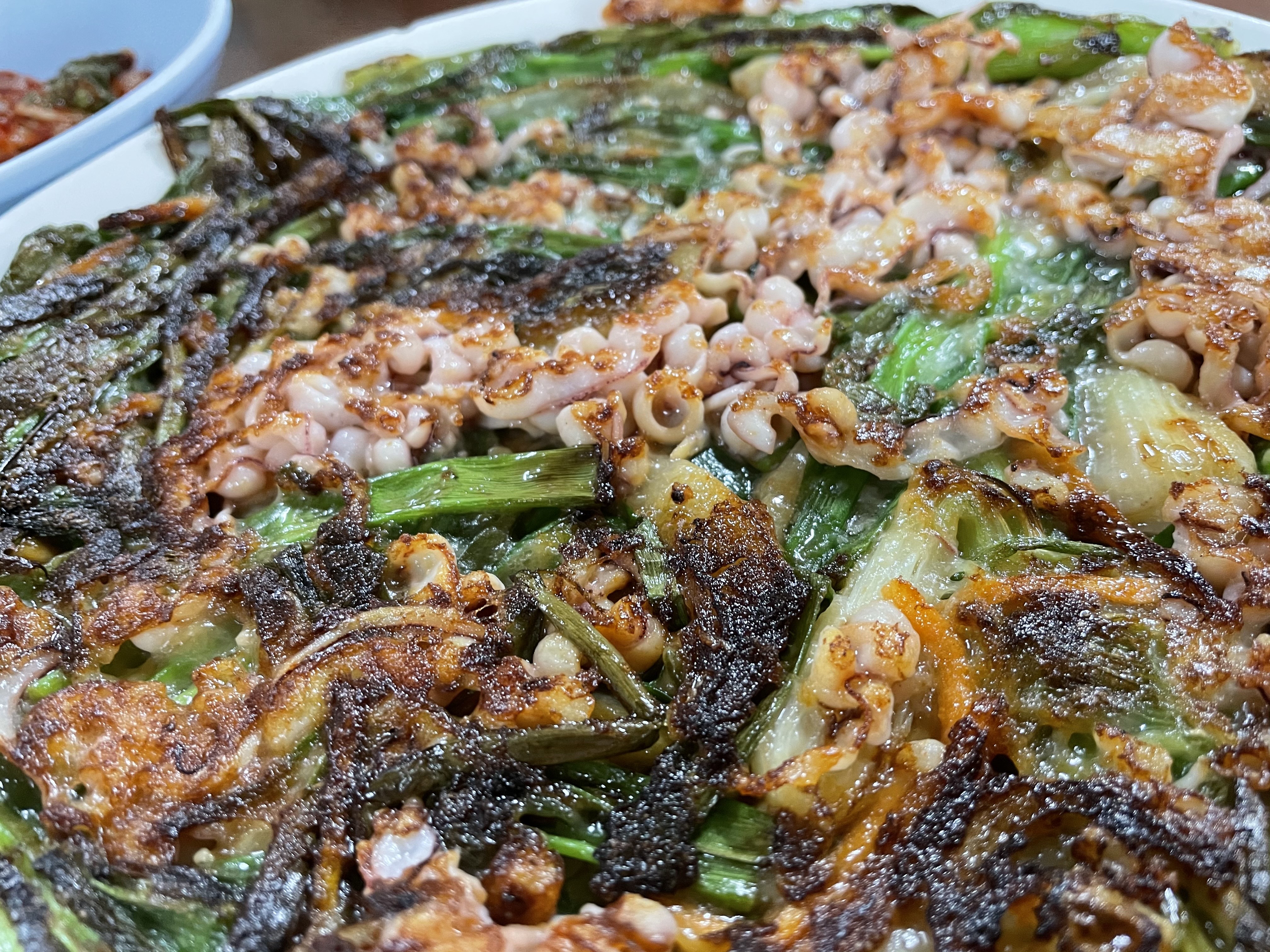 컬링이 된 오징어인지 쭈꾸미인지가 들어있는 파전이었어요. 맛은 그냥 그랬어요. 막 맛있지도 않고 너무 맛없지도 않은?