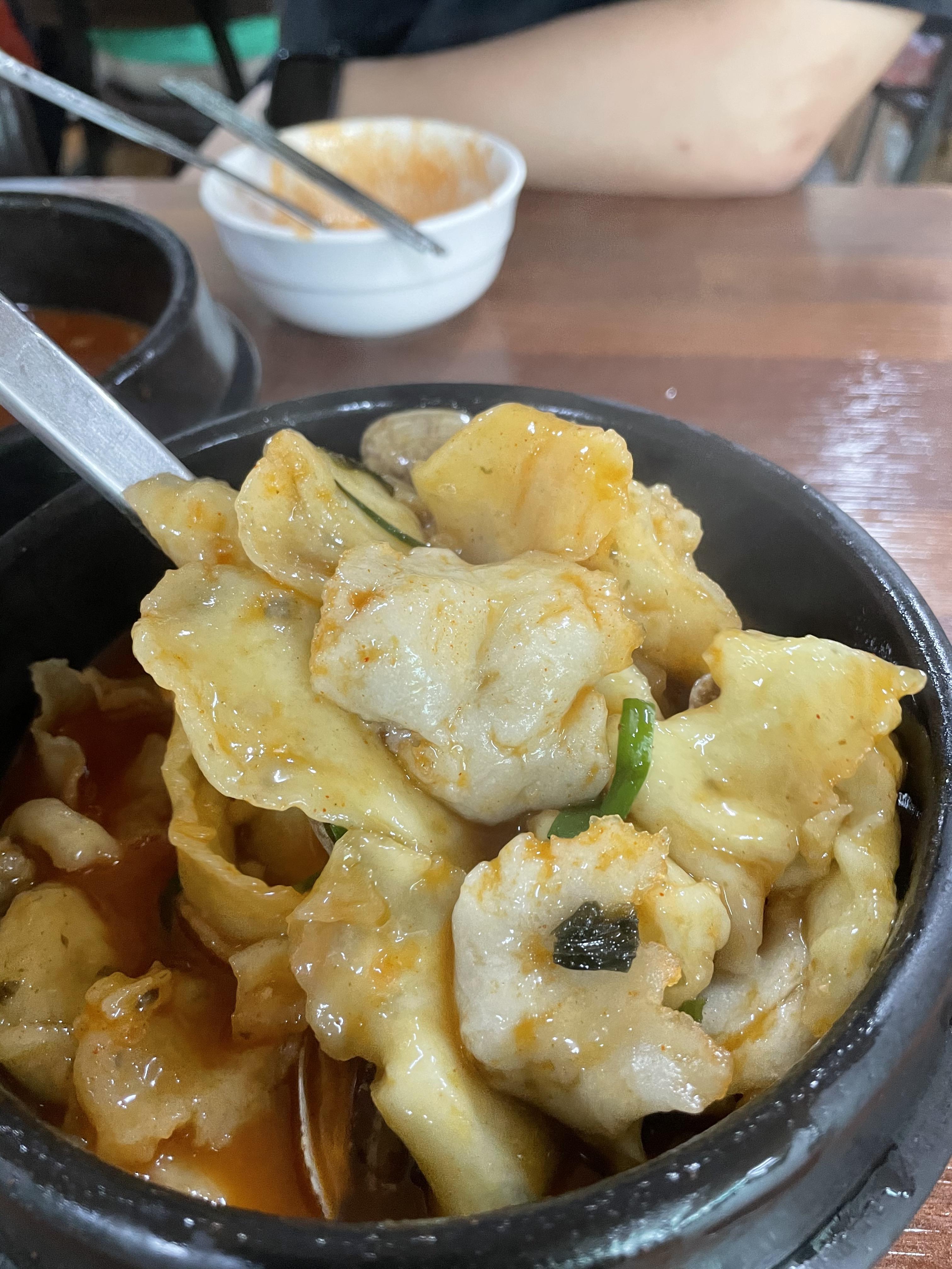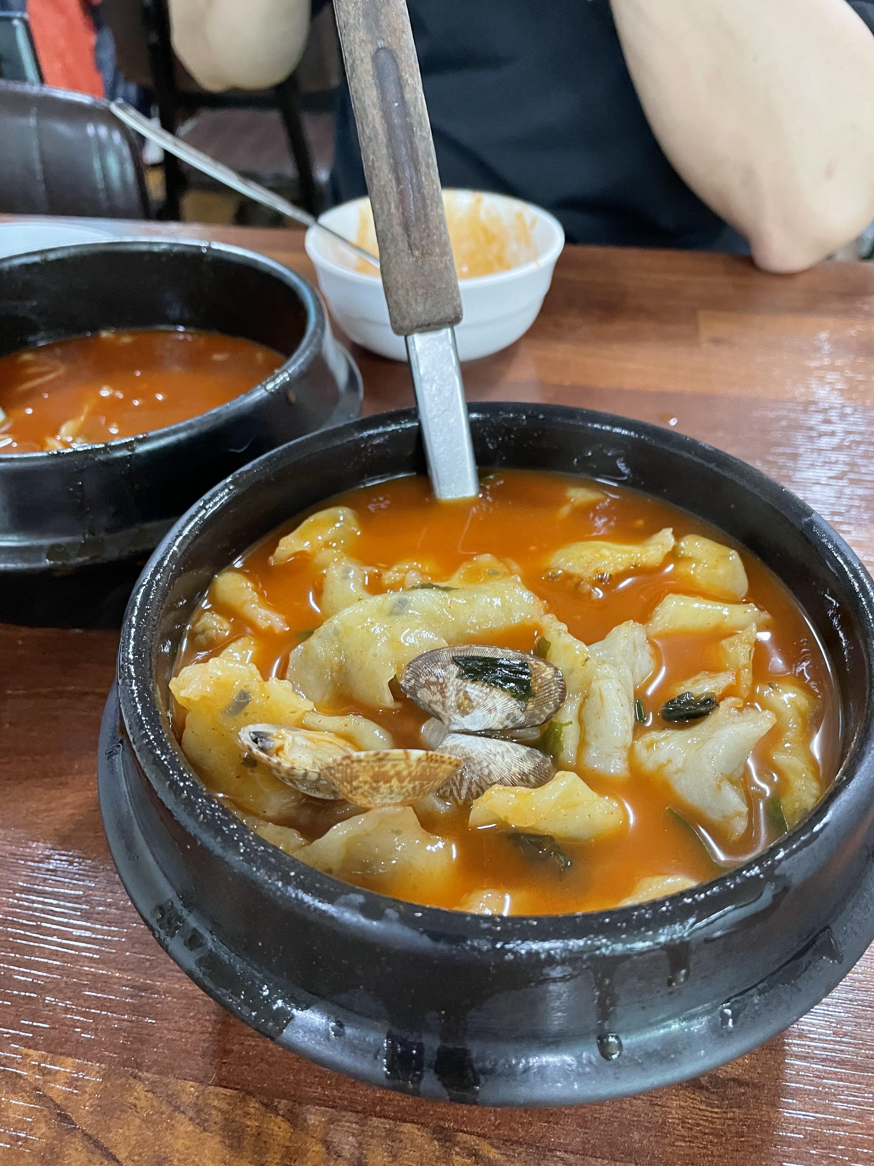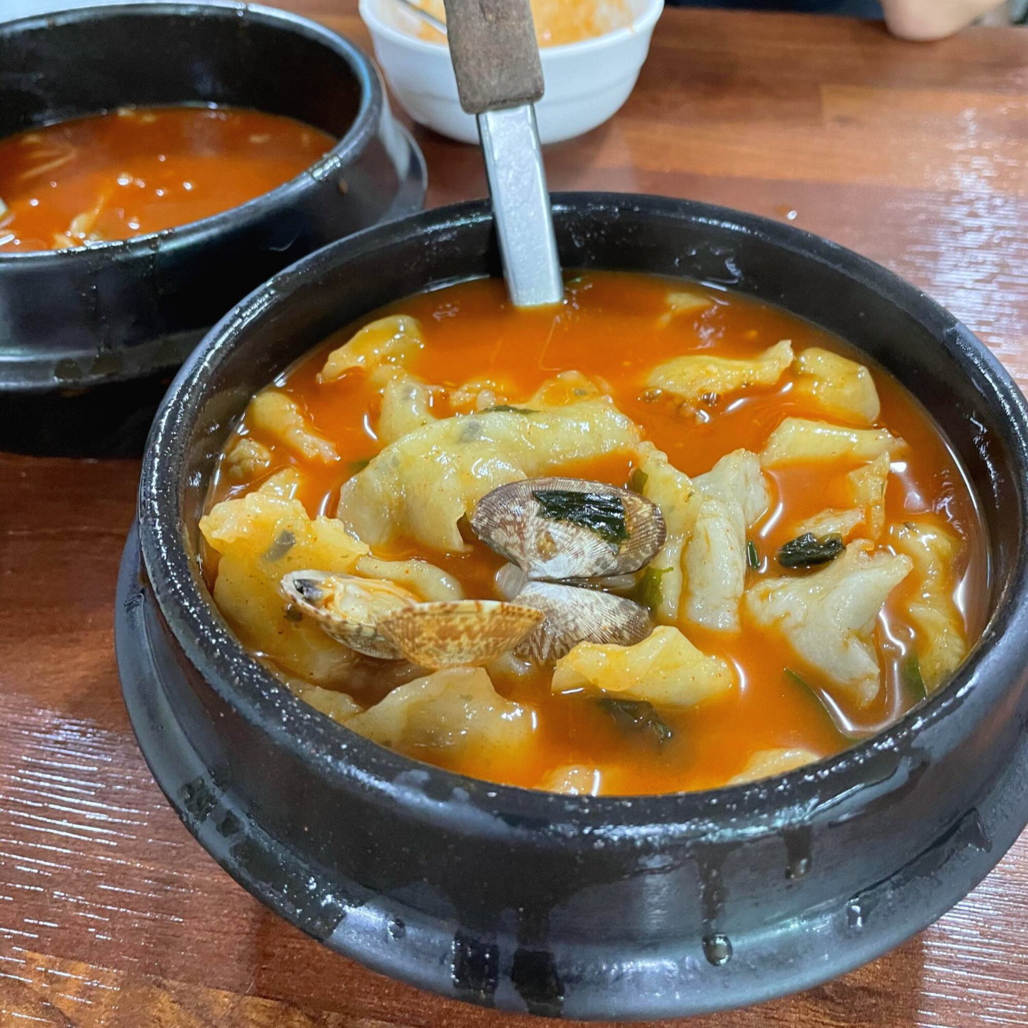 수제비 반죽에 야채 같은 게 콕콕 박혀있었어요. 특이한 점은 밀가루반죽의 수제비와 감자전분으로 만들어져 쫄깃함을 더한 수제비가 섞여있다는 점이에요. 감자떡 같은 느낌 생각하시면 될 것 같아요.