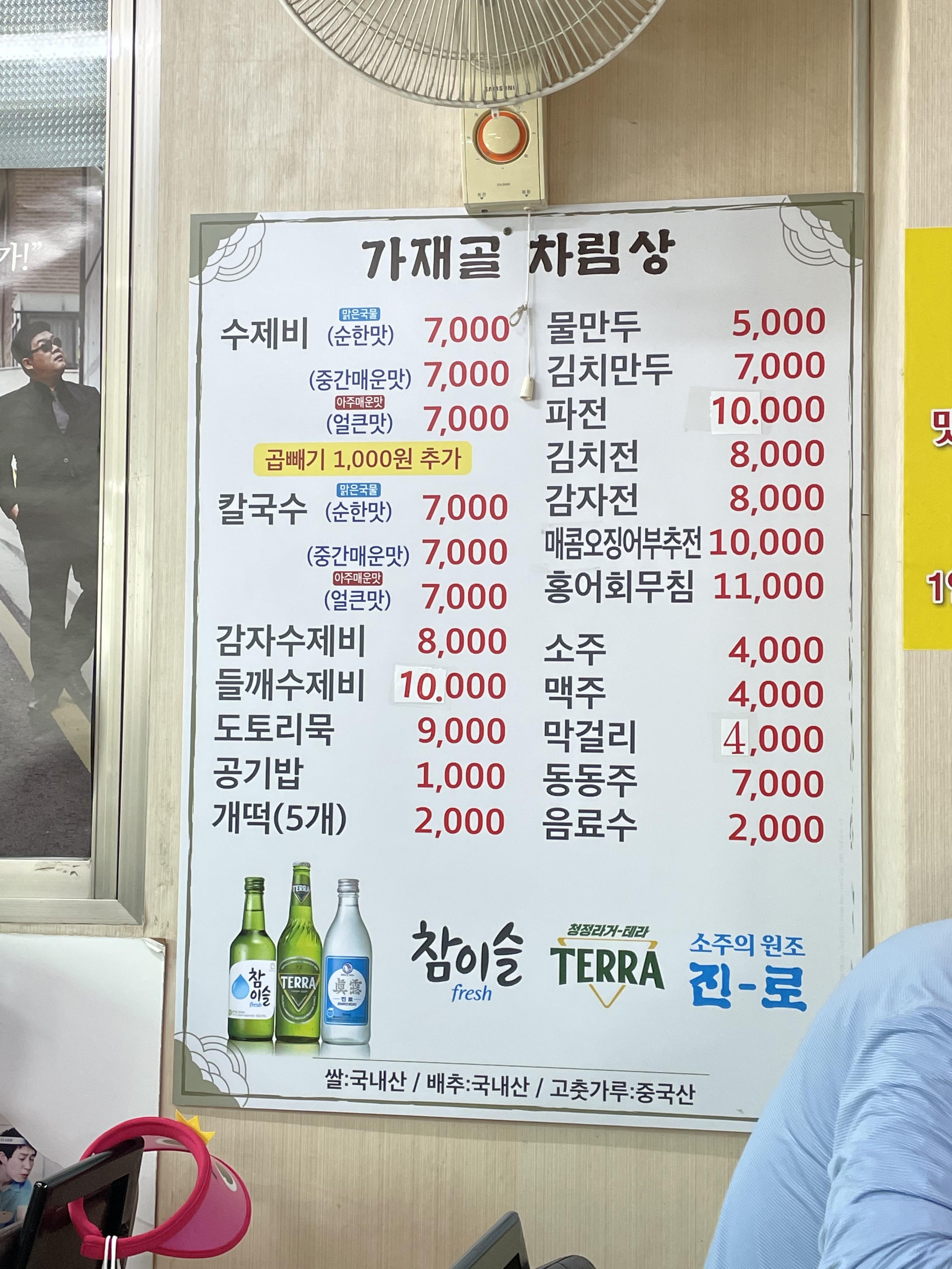 메뉴판입니다. 저희는 수제비와 칼국수를 각각 중간 매운맛으로 주문하고, 파전도 추가로 주문했어요.