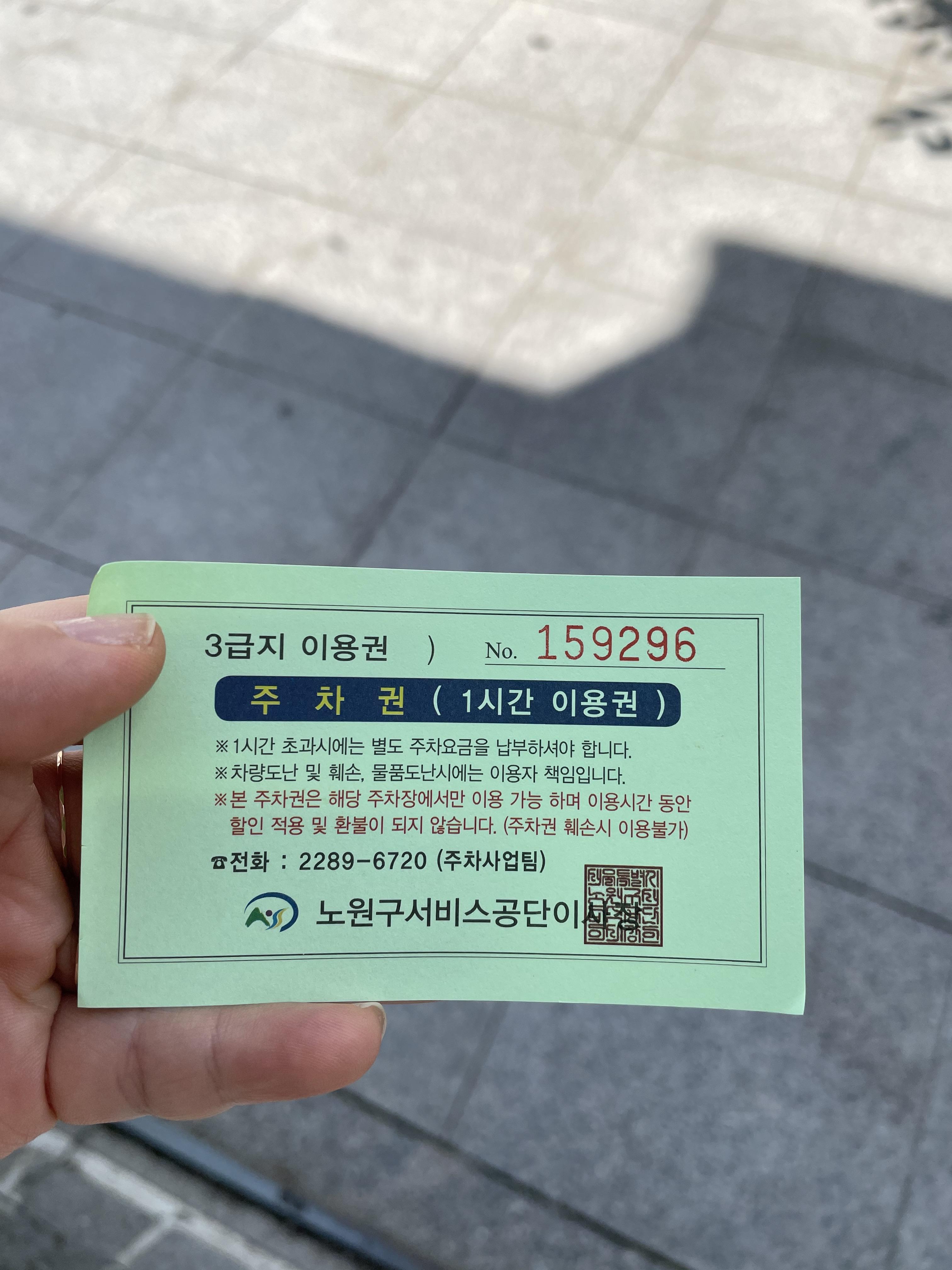 카운터에 가져다드리면 이렇게 주차권을 주십니다. 1시간 이용권이에요.