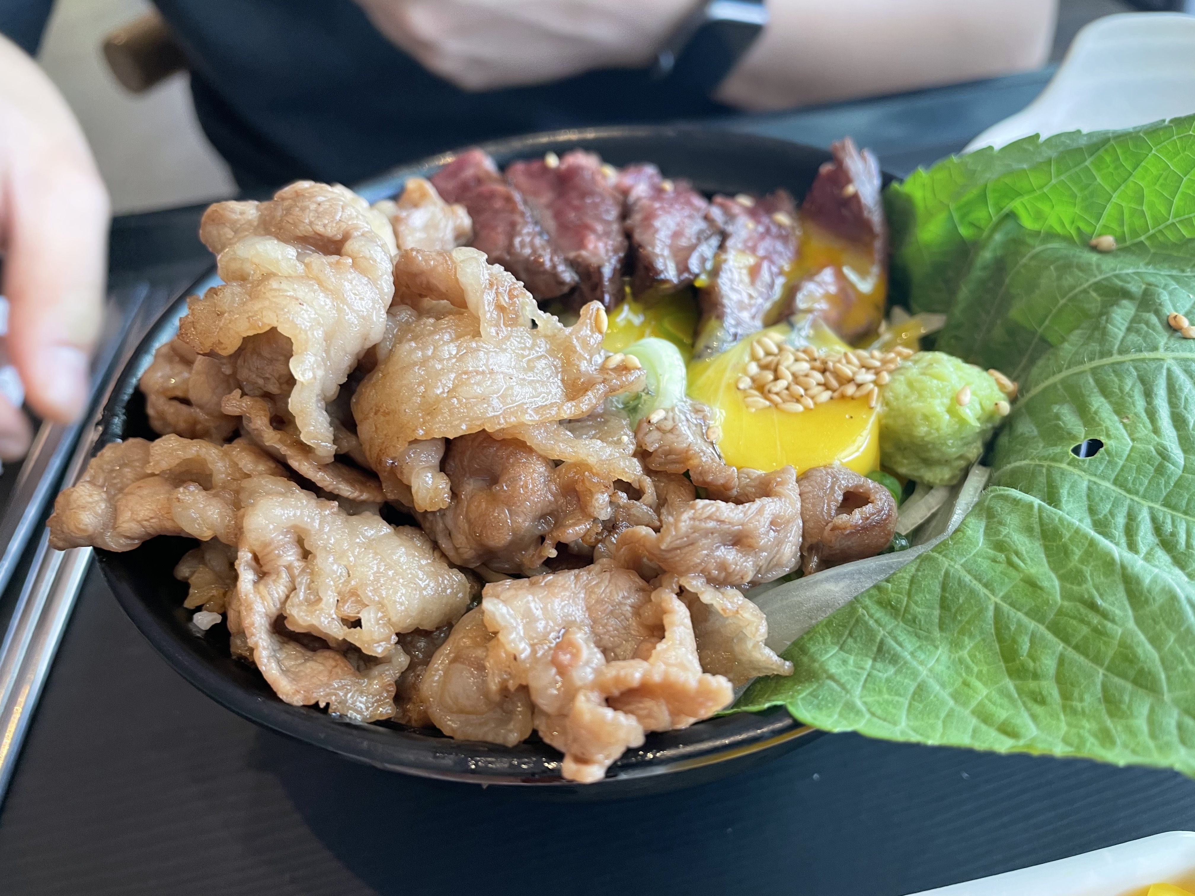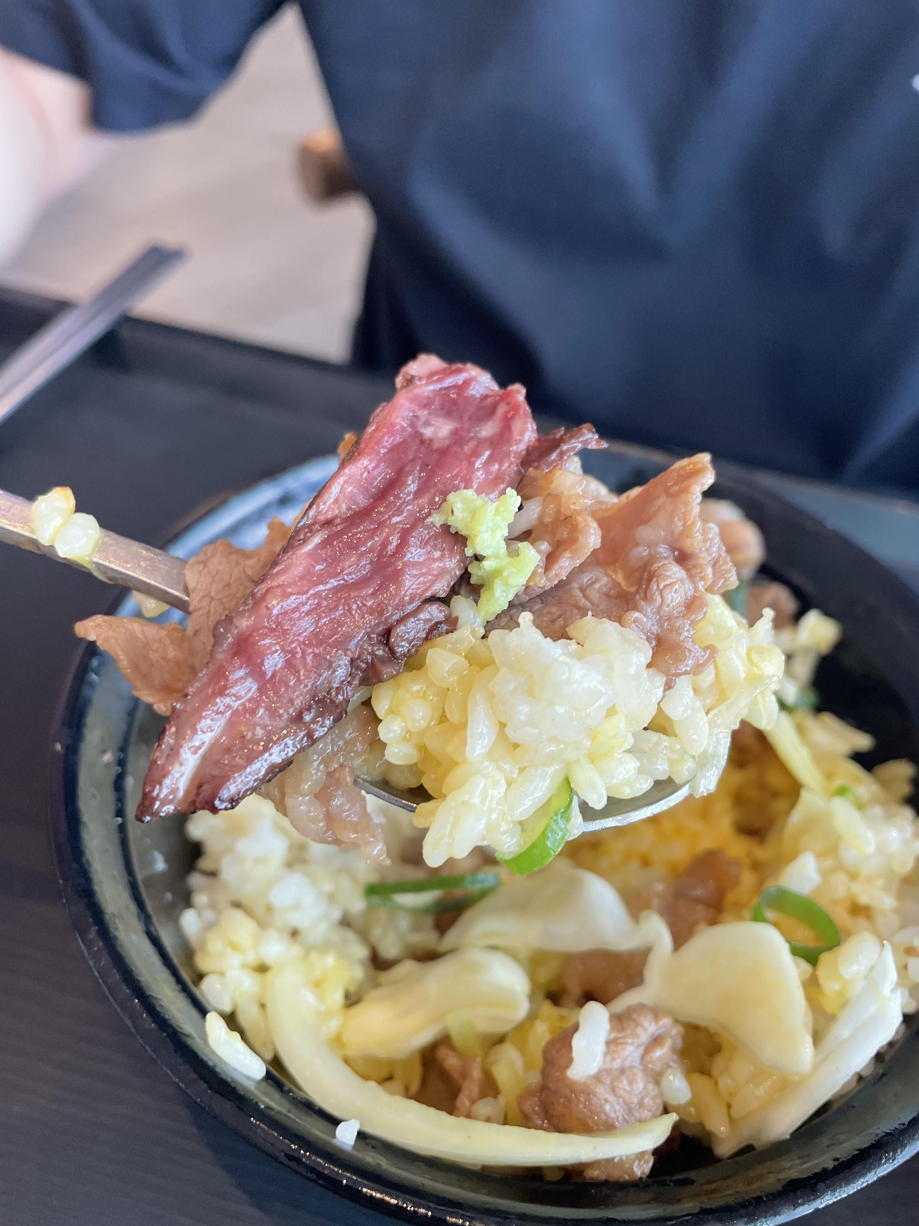 이렇게 노른자와 잘 비벼서 밥과 스테이크, 우삼겹에 와사비를 얹어 먹으면 고소하고 괜찮은 맛입니다. 다 좋았는데 양이 아쉬웠어요. 손바닥만한 그릇에 나오더라구요. 재구매 의사는 딱히 없다고 합니다!