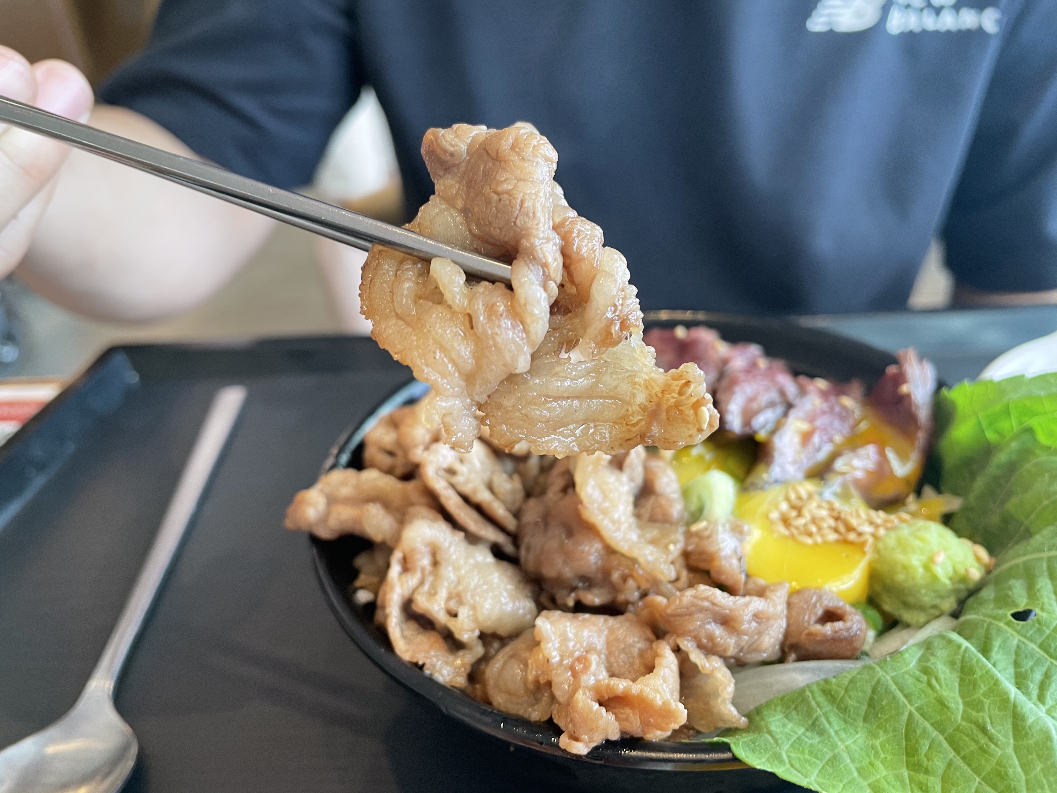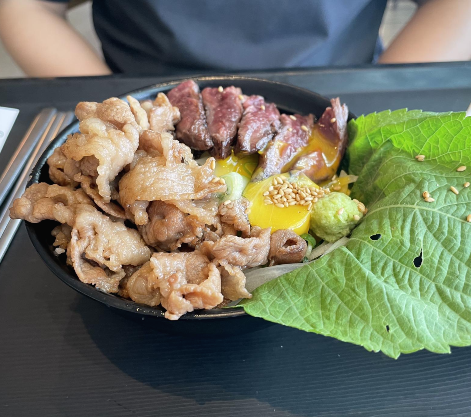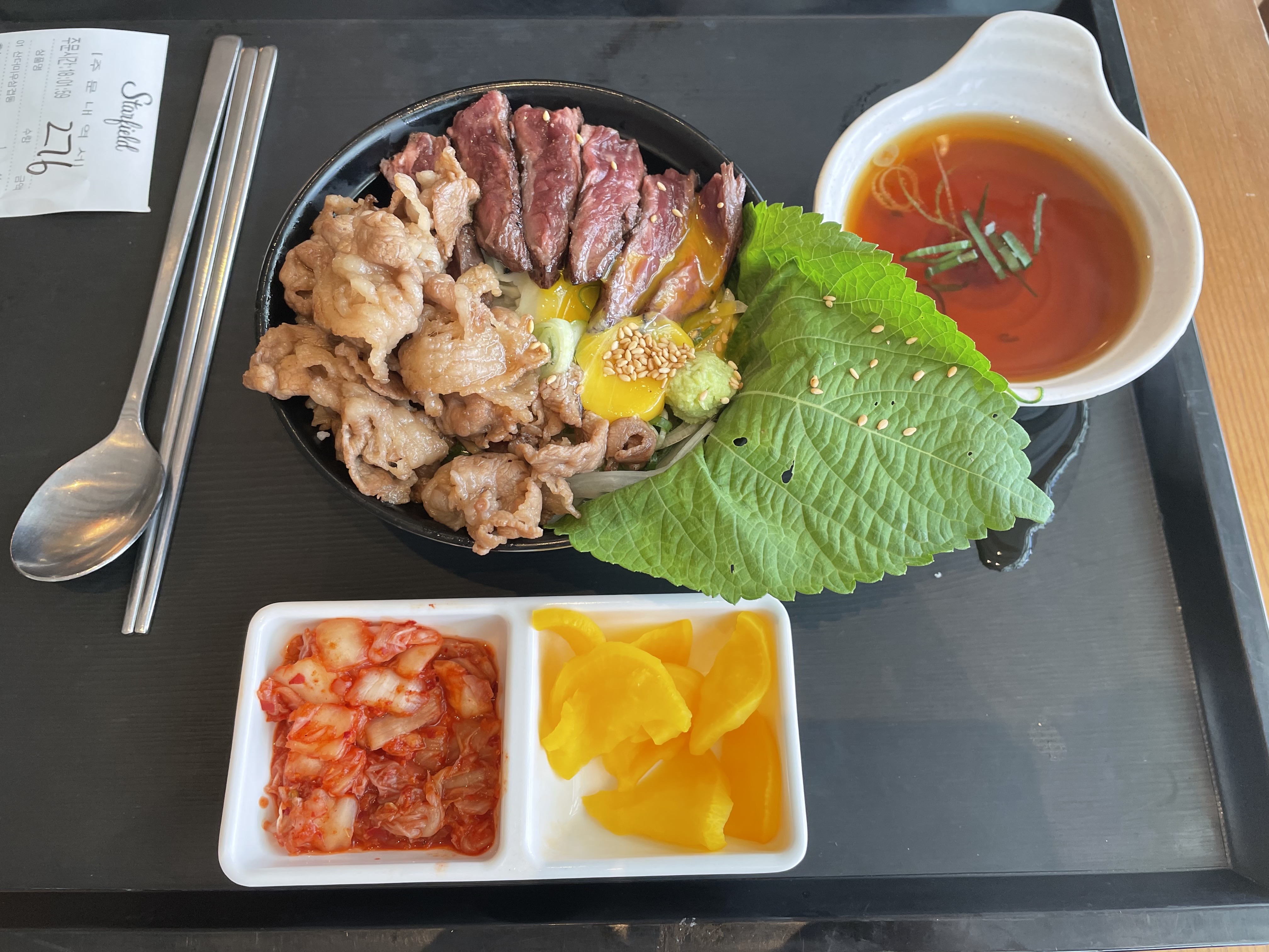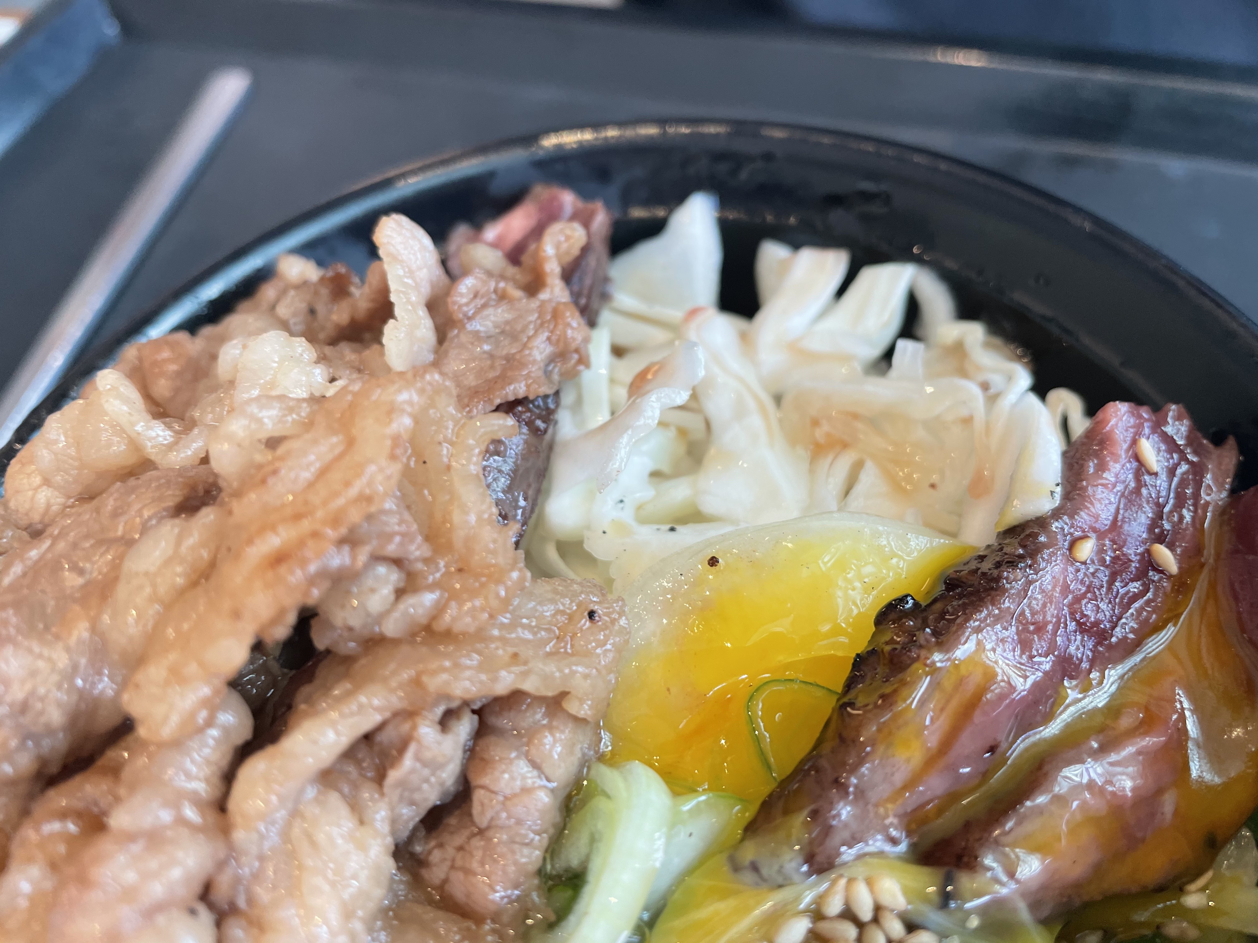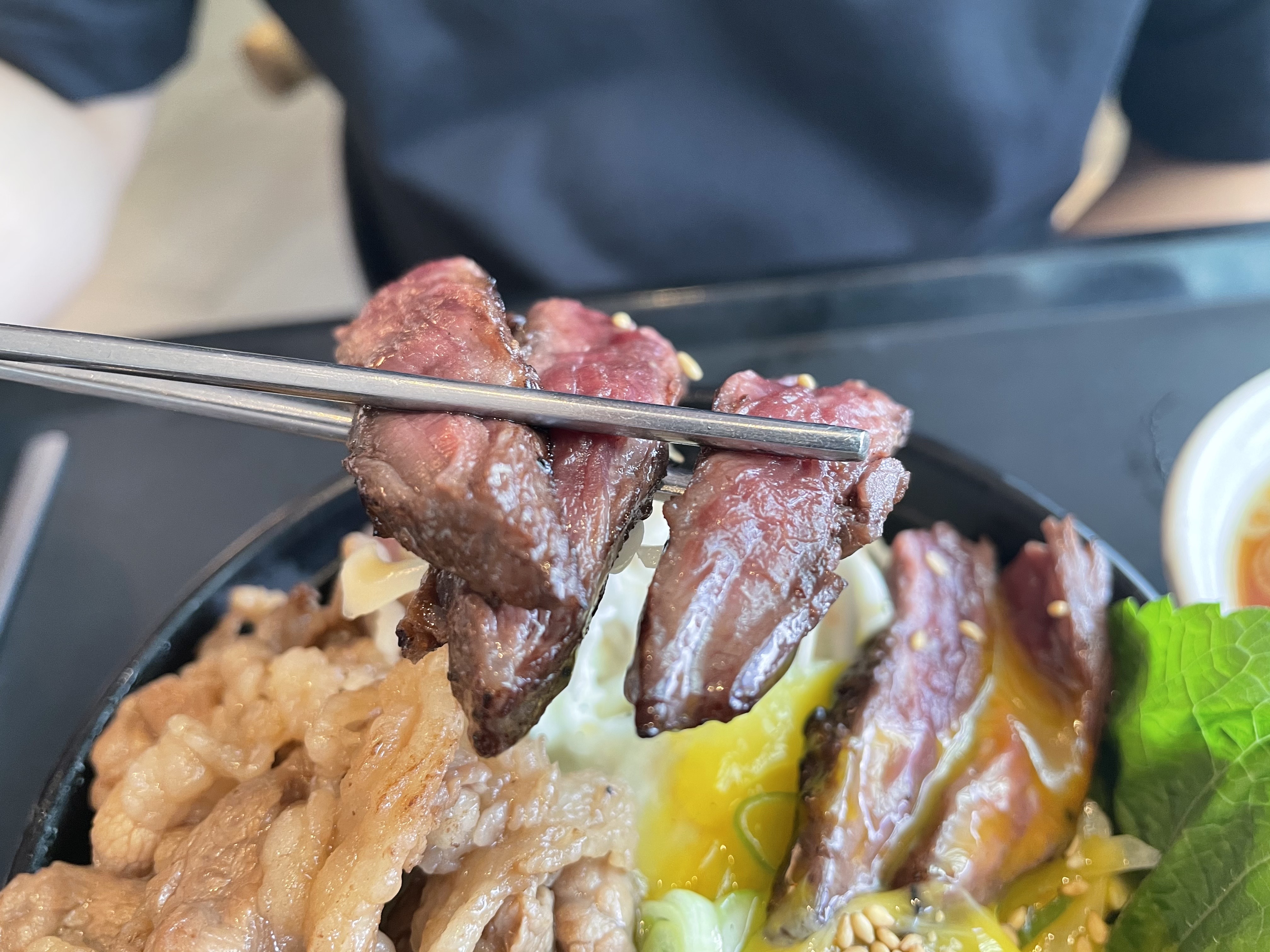 일단 구성은 우삼겹, 스테이크가 계란 노른자와 함께 그릇 위를 가득 덮고 있구요.