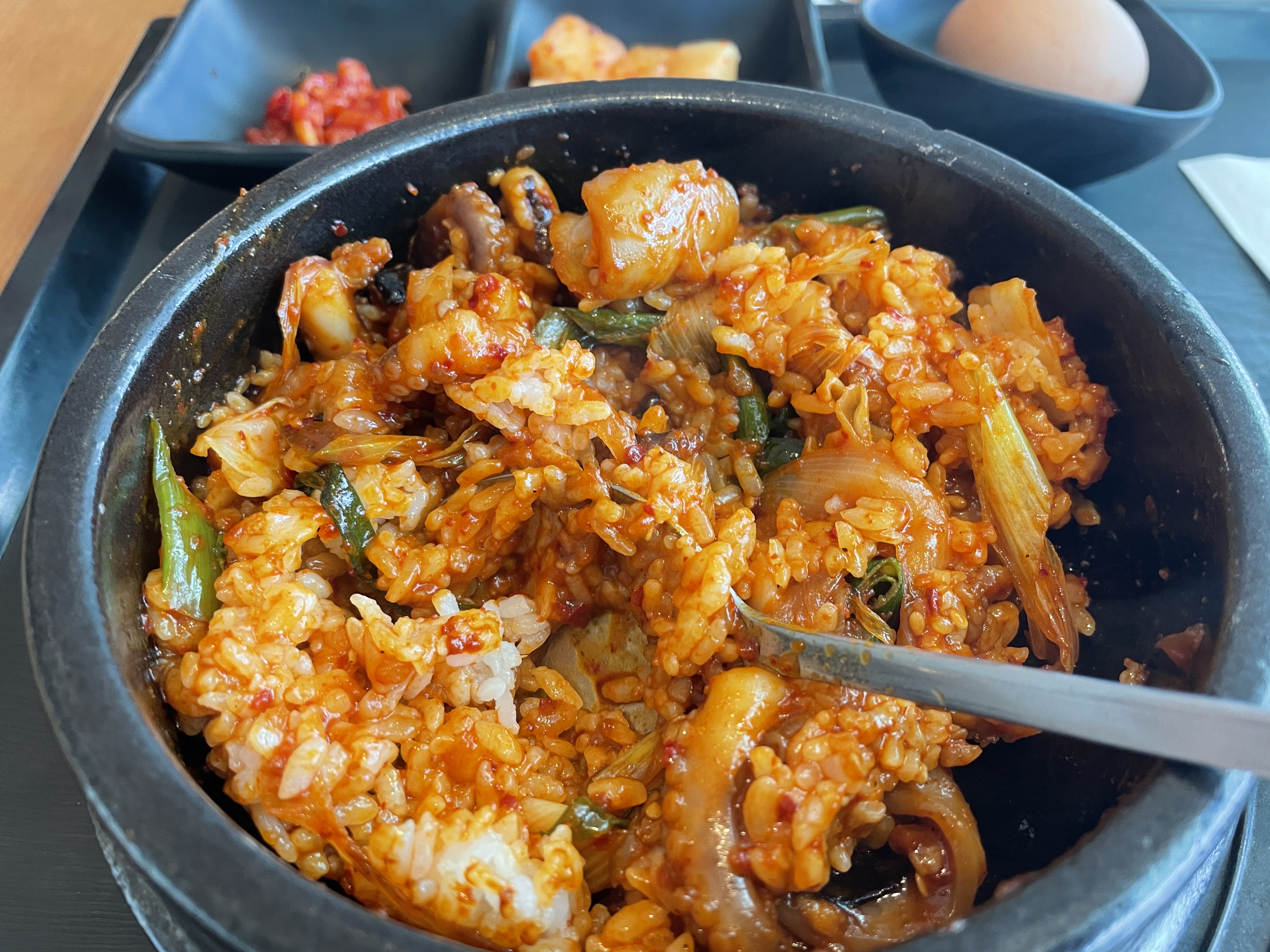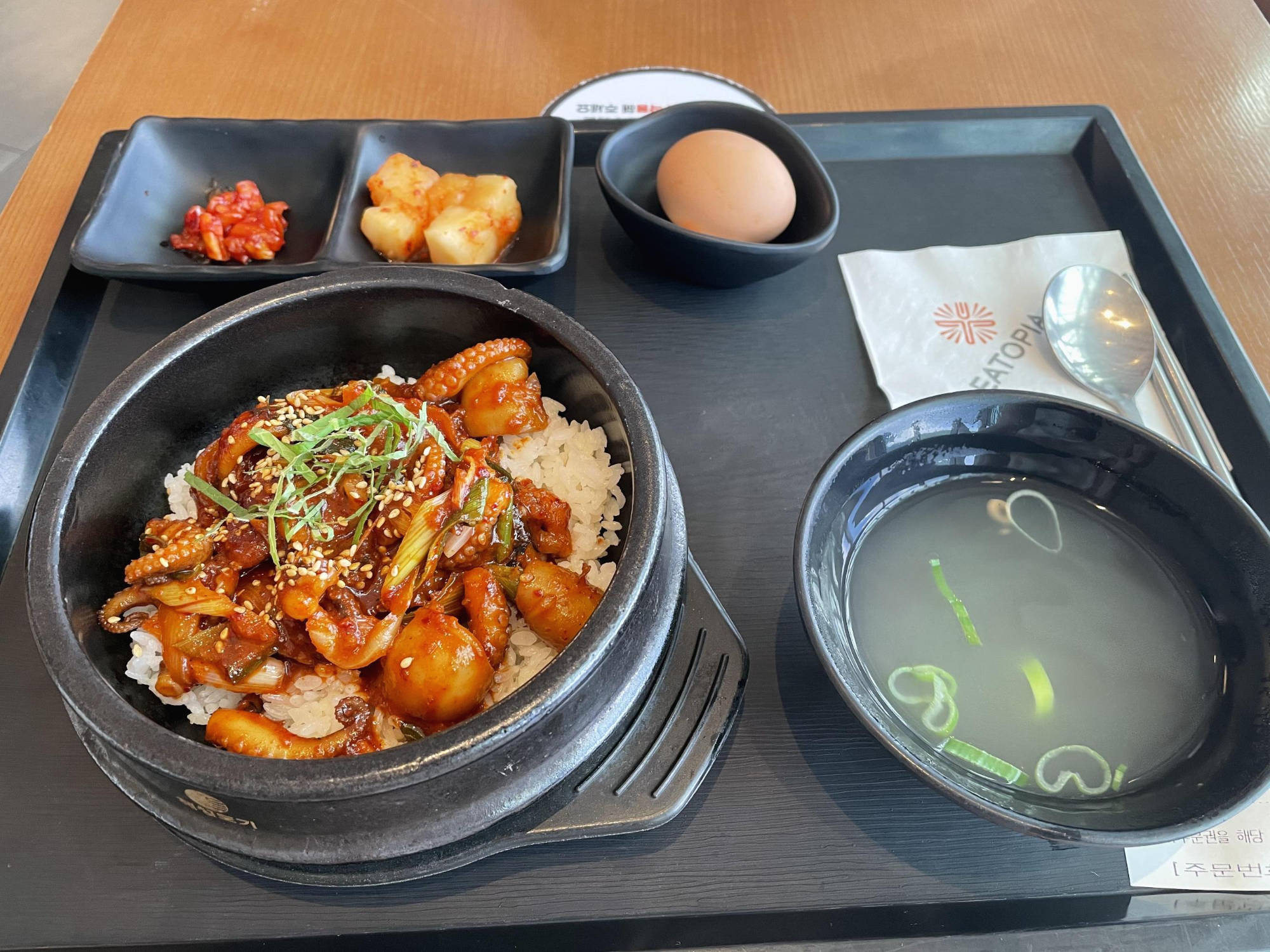 밑반찬은 잘 익은 깍두기, 젓갈, 삶은 계란, 맑은 국이 나왔습니다. 삶은 계란은 왜 나왔는지 잘 모르겠어요.. 처음엔 날계란인줄 알고 아 풀어서 먹으라는 건가?? 라고 생각했는데 소금이 같이 나온걸로 보아 아니었습니다.