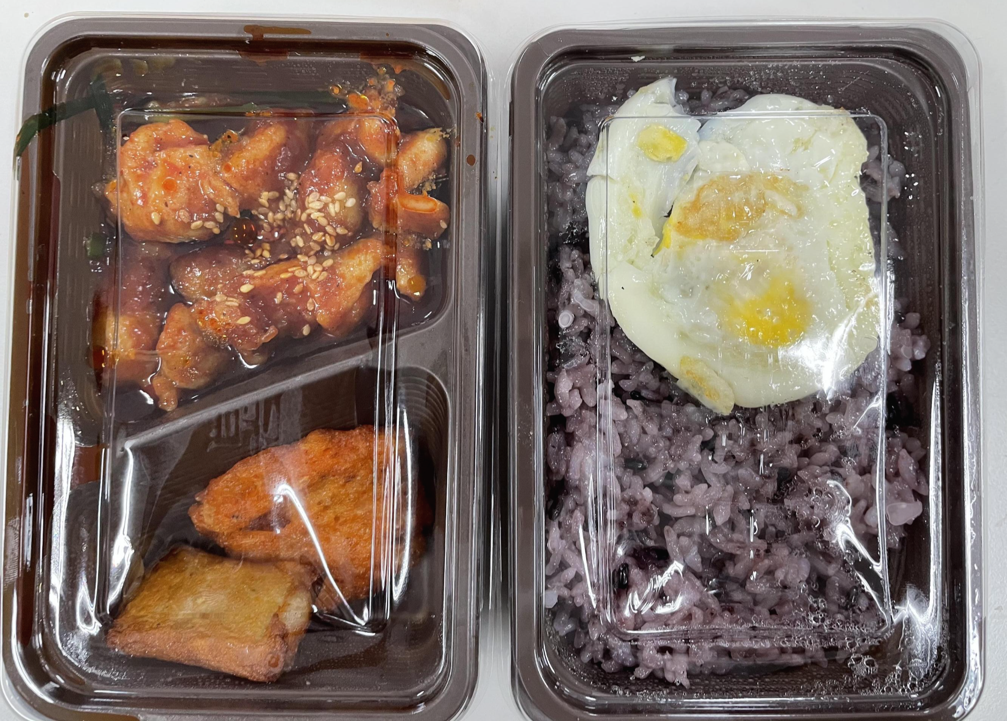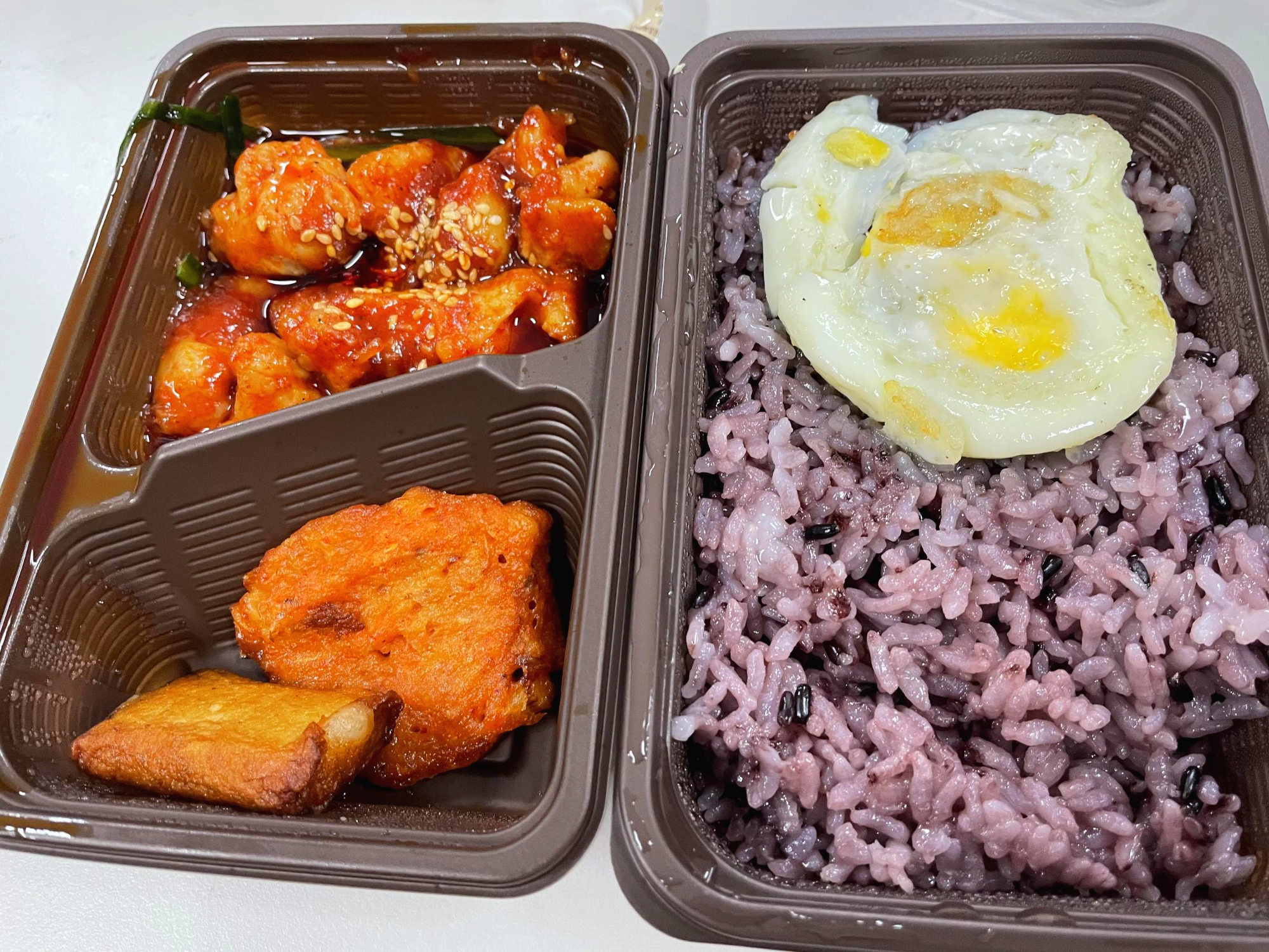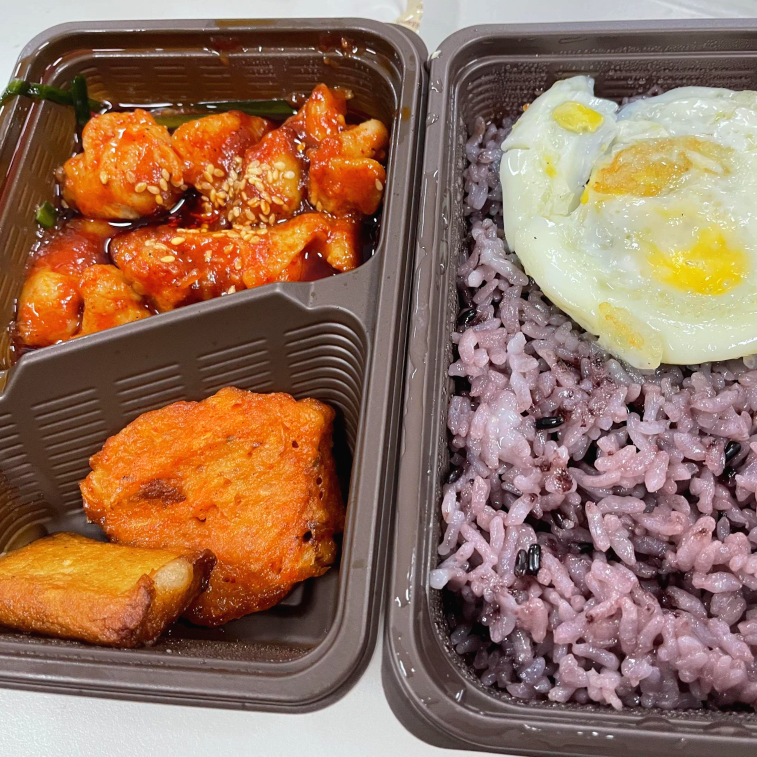 구성은 계란후라이가 올라간 흑미밥에, 춘천식 닭구이, 반찬 2개입니다.