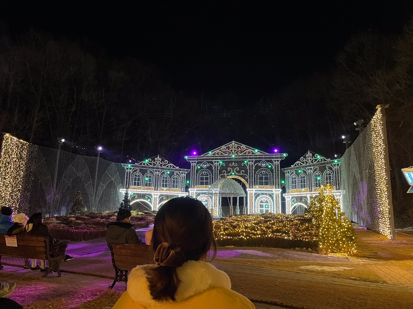 라이팅쇼는 겨울 노래 4-5곡 정도를 편집해서 노래에 맞게 빛이 변하는 쇼예요! 시간이 짧아서 보기 좋더라고요.