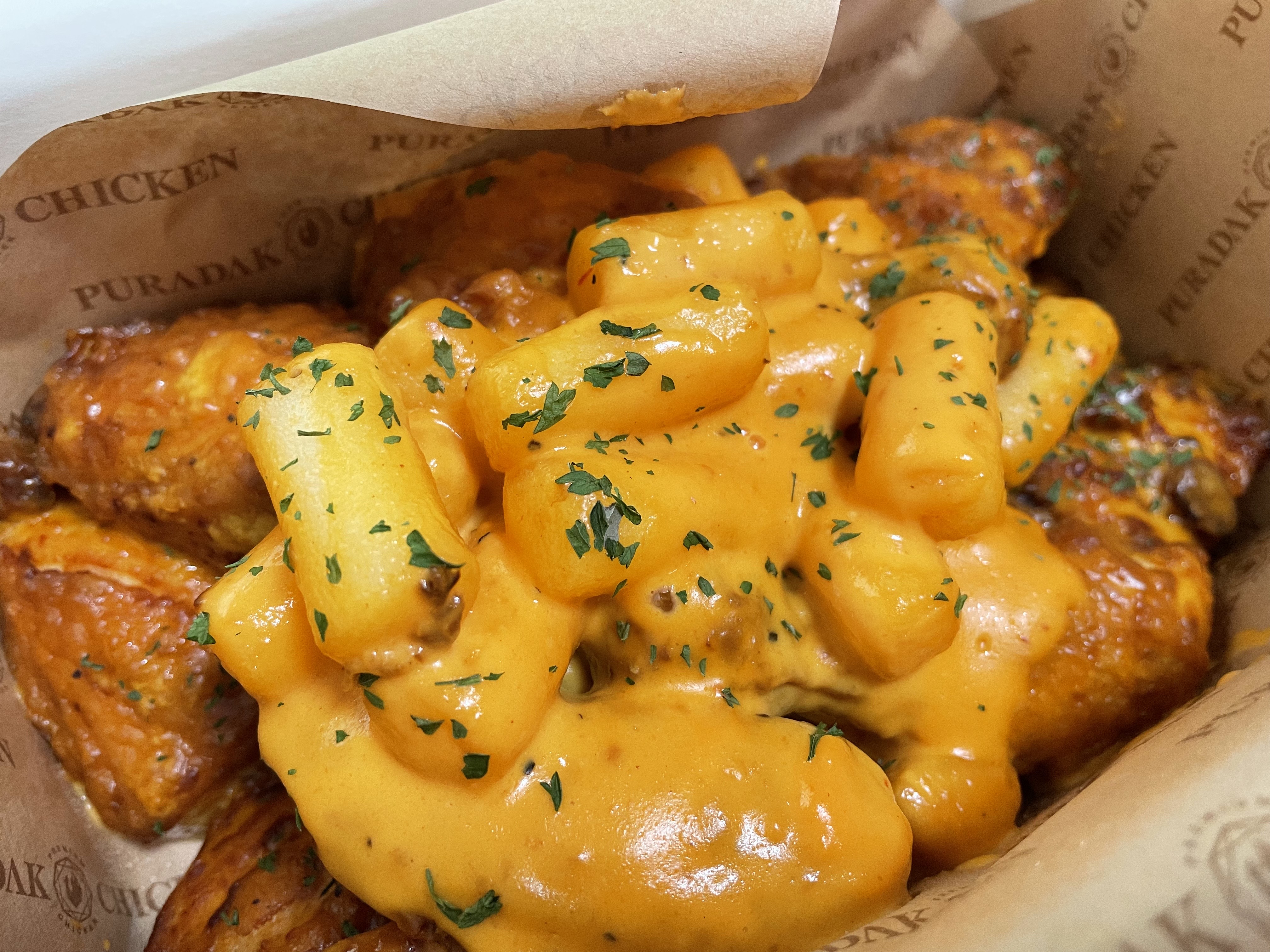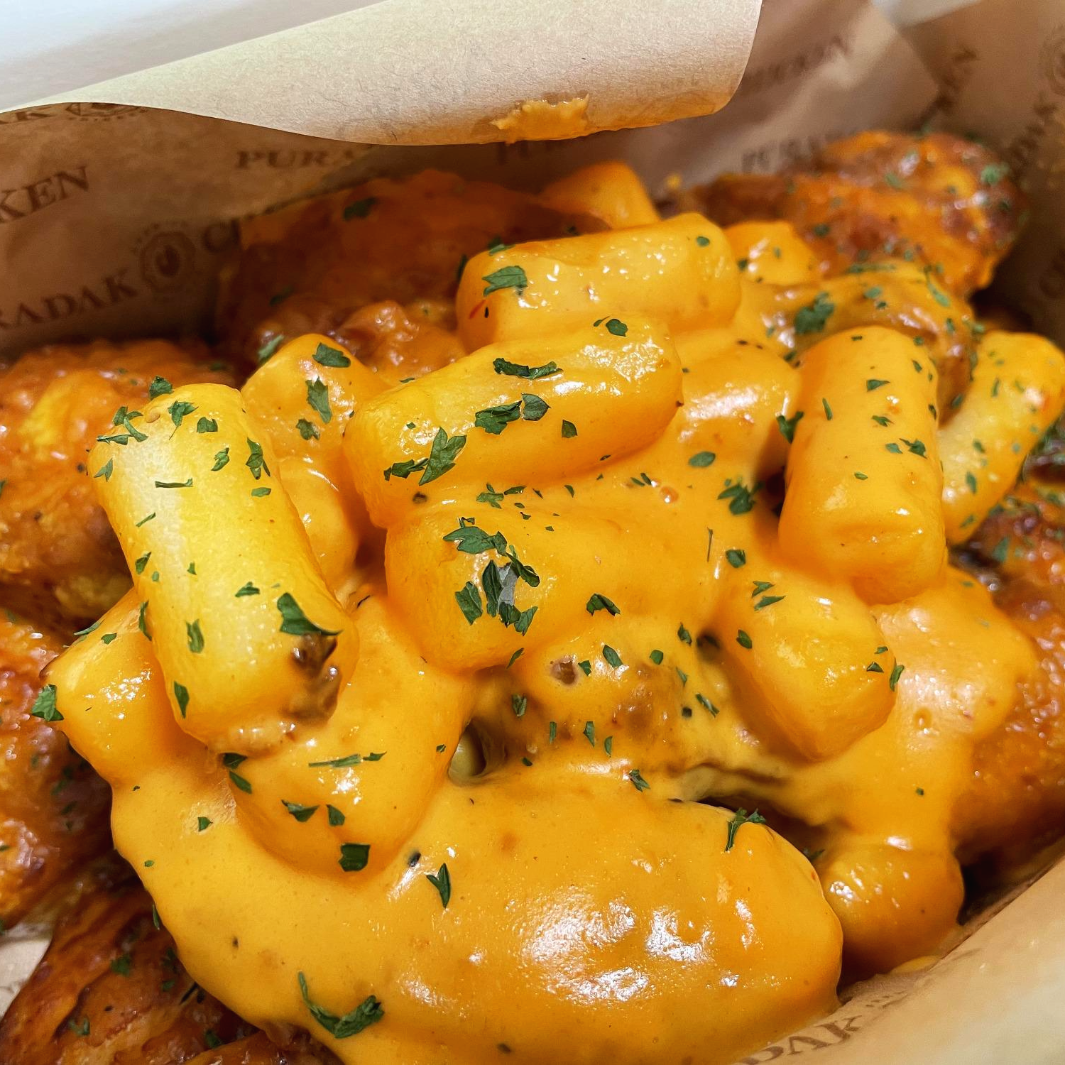 푸라닭 투움바치킨은 아웃백 투움바파스타를 연상시키는 꾸덕하면서도 매콤한 크림소스가 특징이에요.