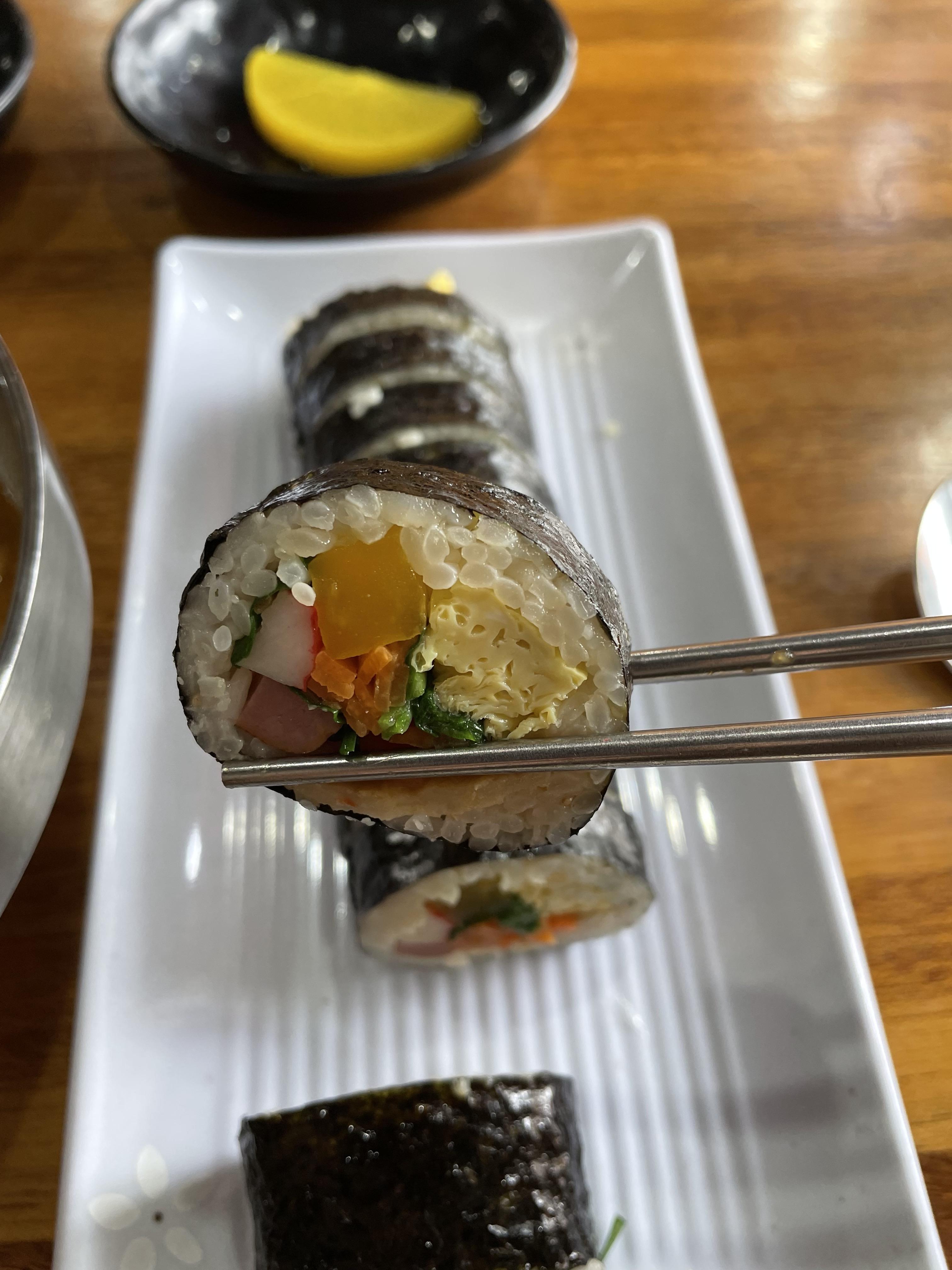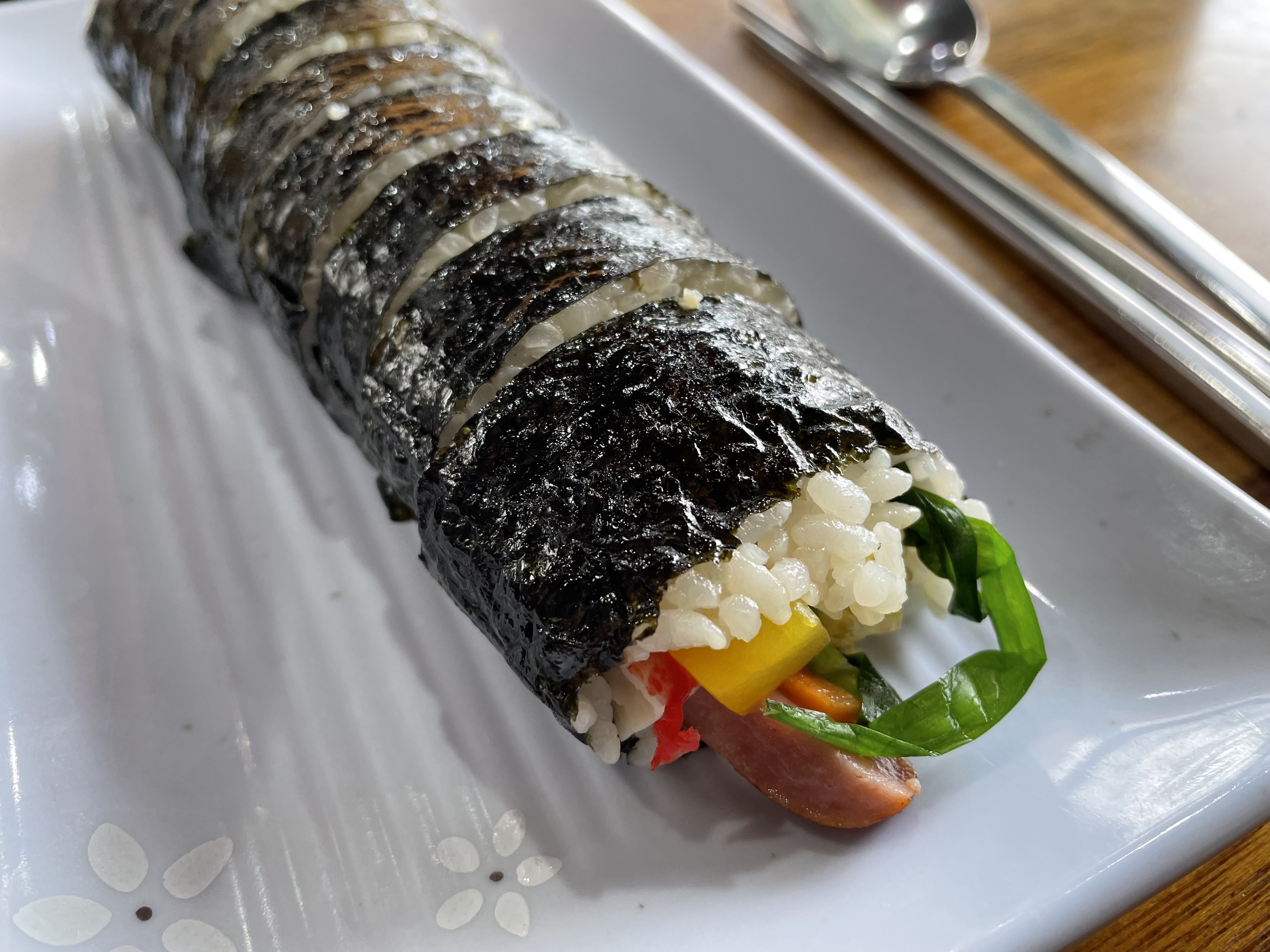 계란과 단무지, 게맛살, 시금치, 당근, 햄, 우엉이 들어간 정직한 김밥입니다. 맛은 괜찮았어요! 제가 요즘 프랜차이즈 김밥이 아닌, 집에서 만든 김밥 스타일을 좋아해서, 제 입맛에는 딱 맞았습니다.