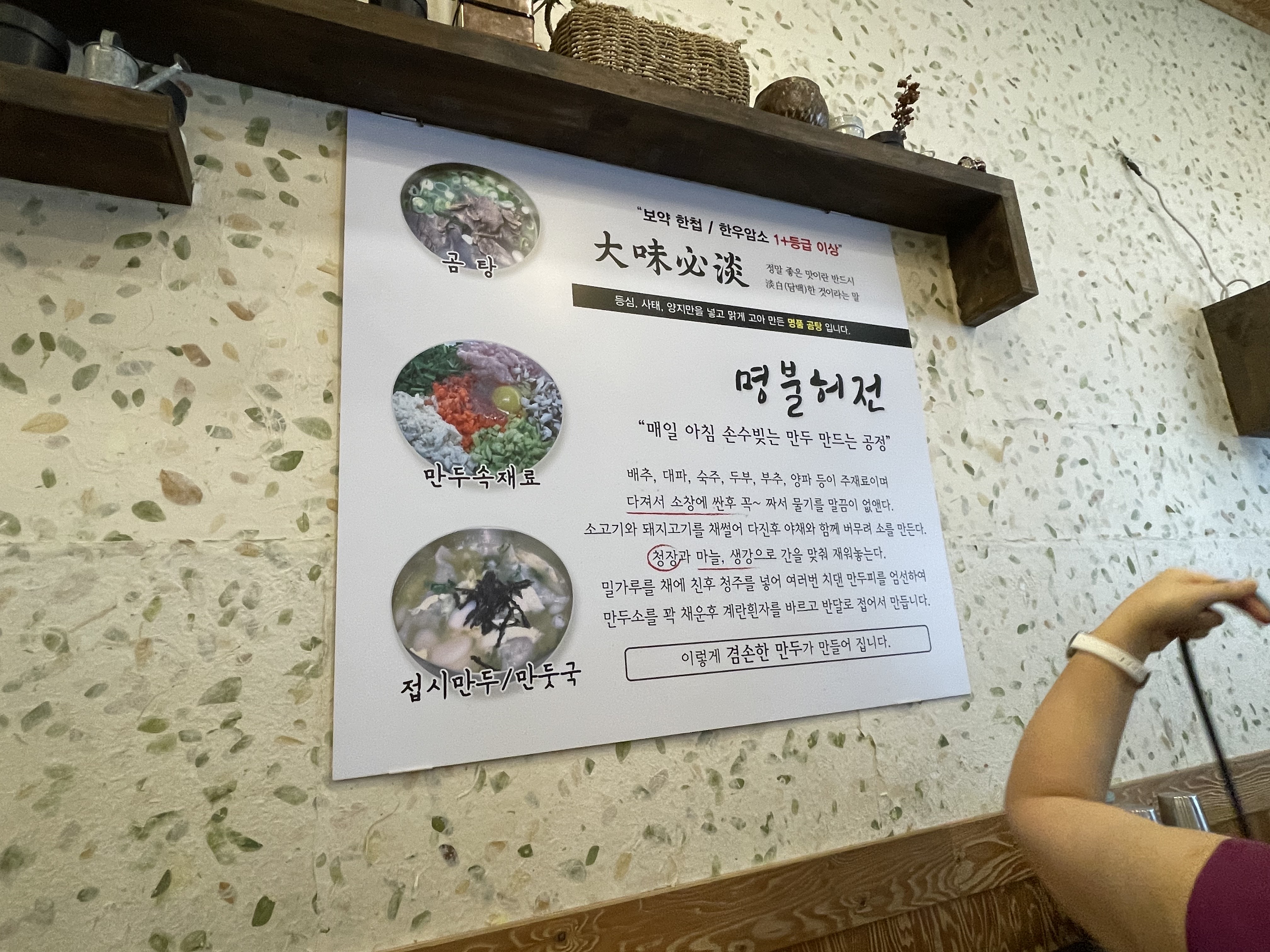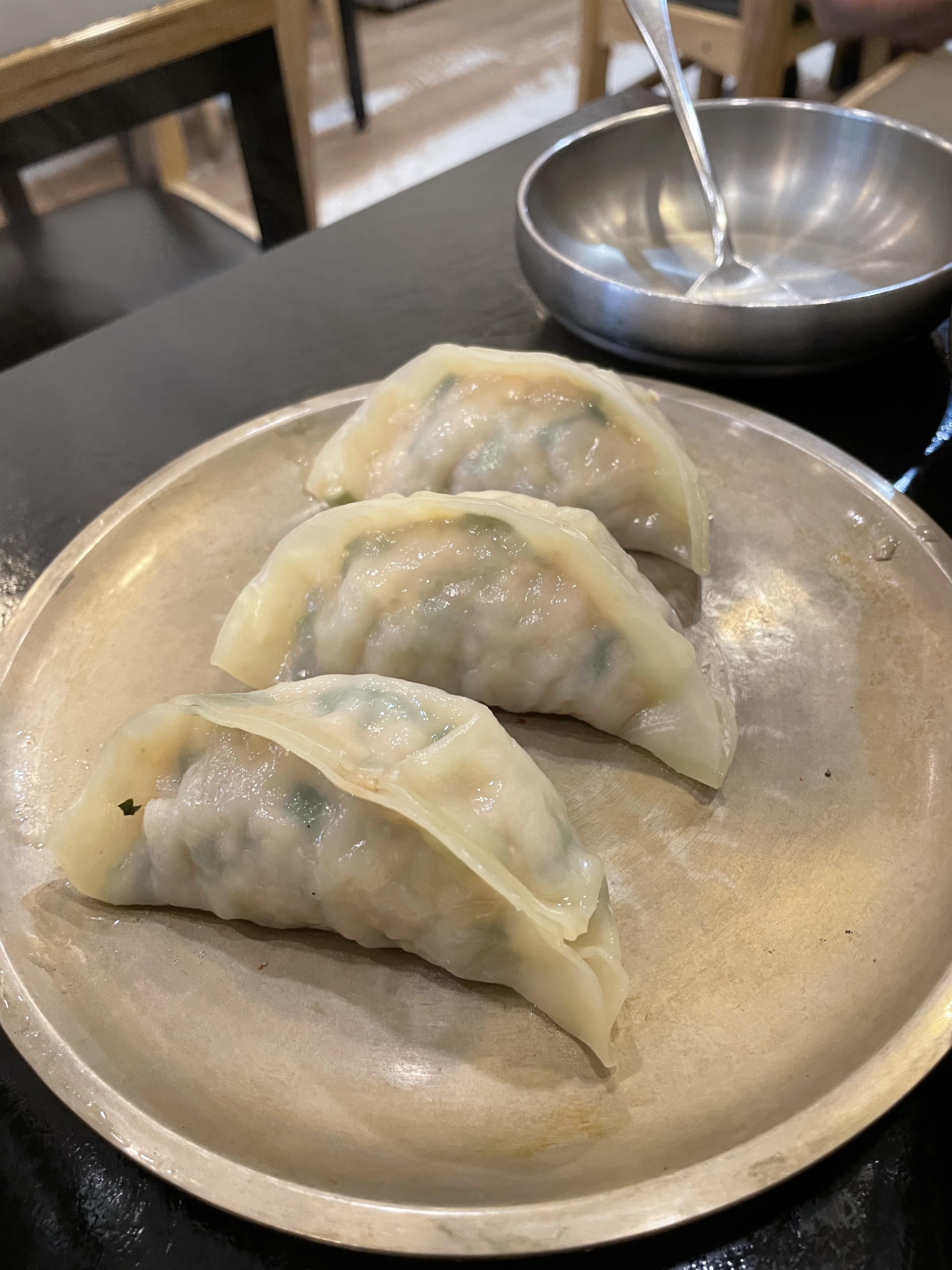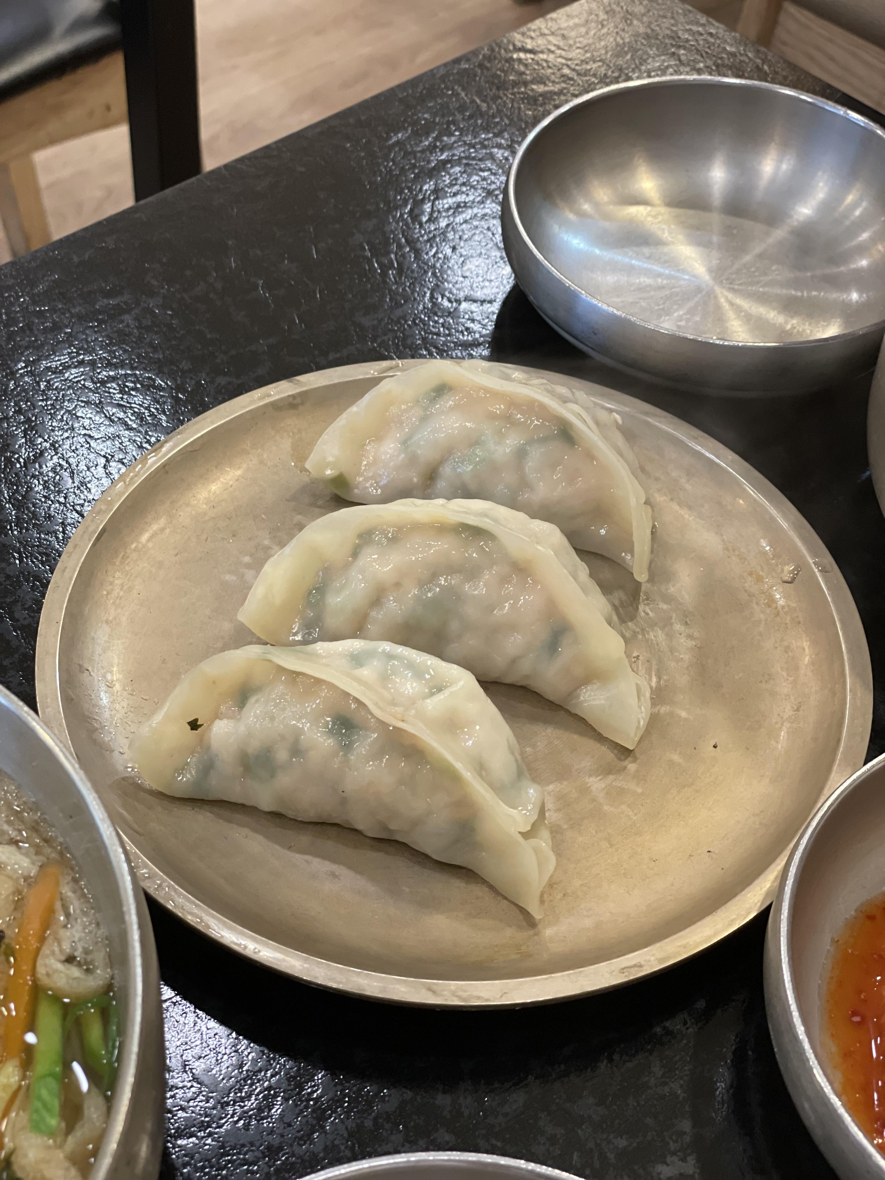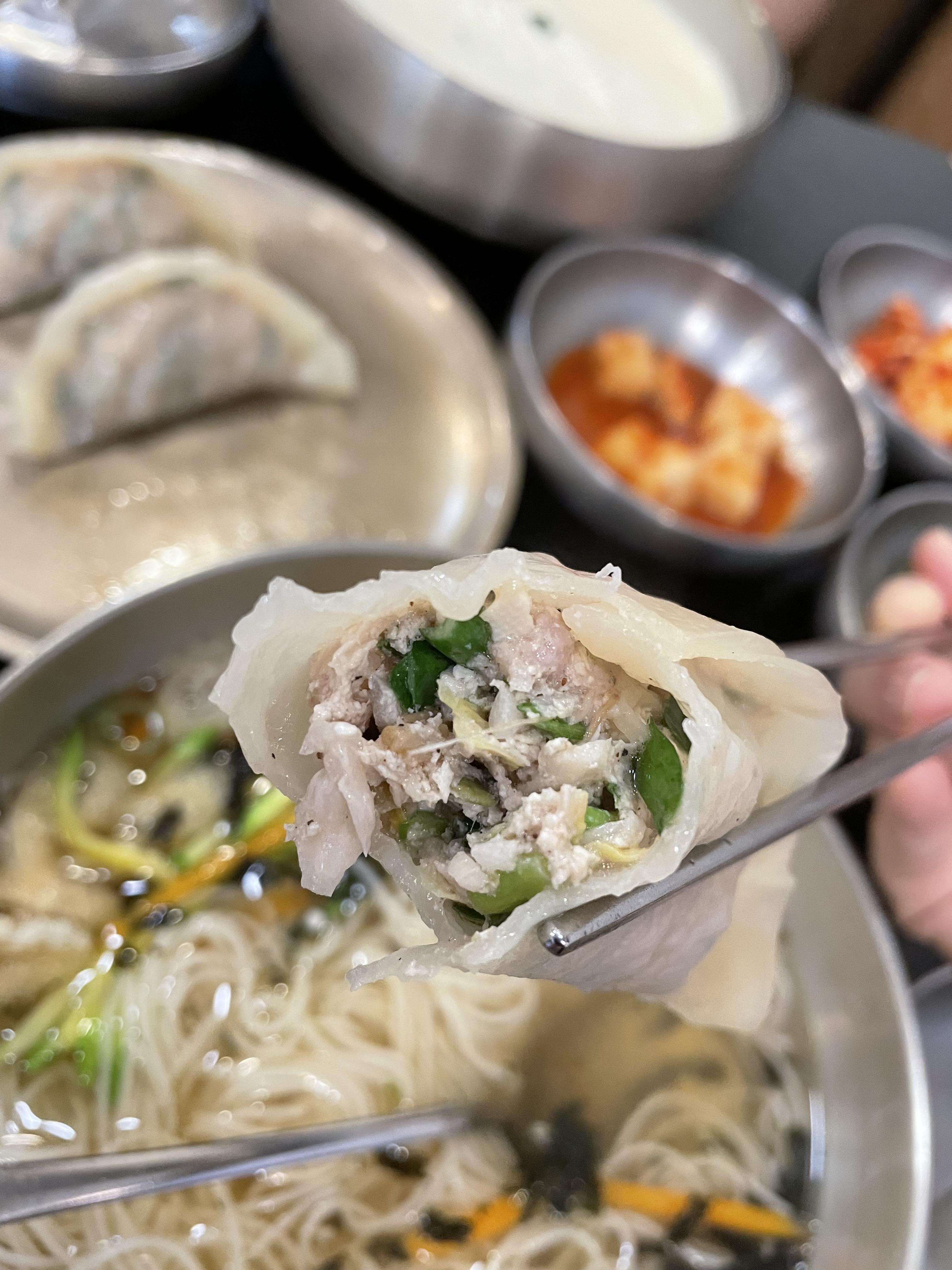 만두소로 배추, 대파, 숙주, 두부, 부추, 양파 그리고 소고기와 돼지고기가 들어가 있어요. 짜거나 자극적이지 않고 맛있는 편이었습니다. 다음번엔 떡만둣국이 먹어보고 싶네요.