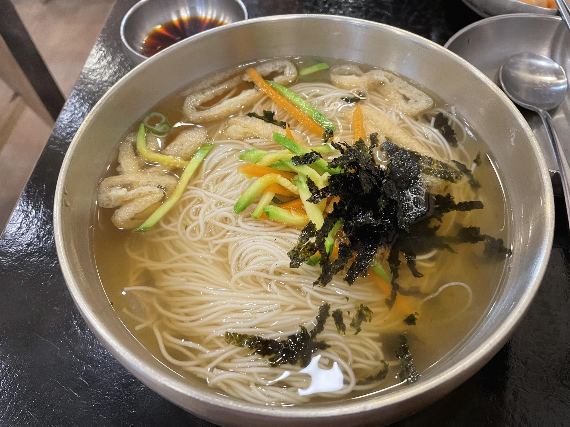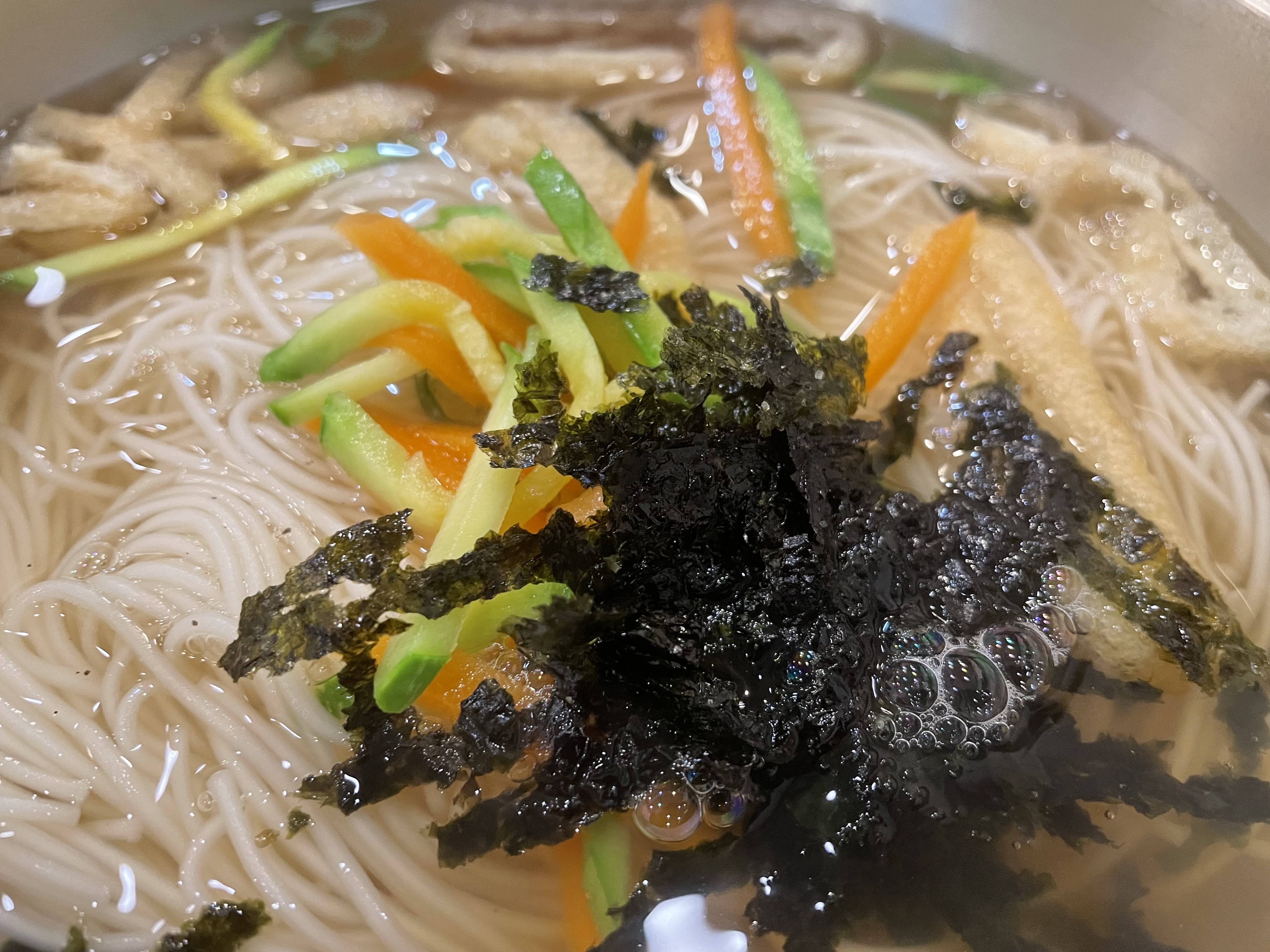 애호박과 당근, 유부와 김이 고명으로 올라가 있습니다. 국물 맛은 깔끔한 멸치국물입니다.