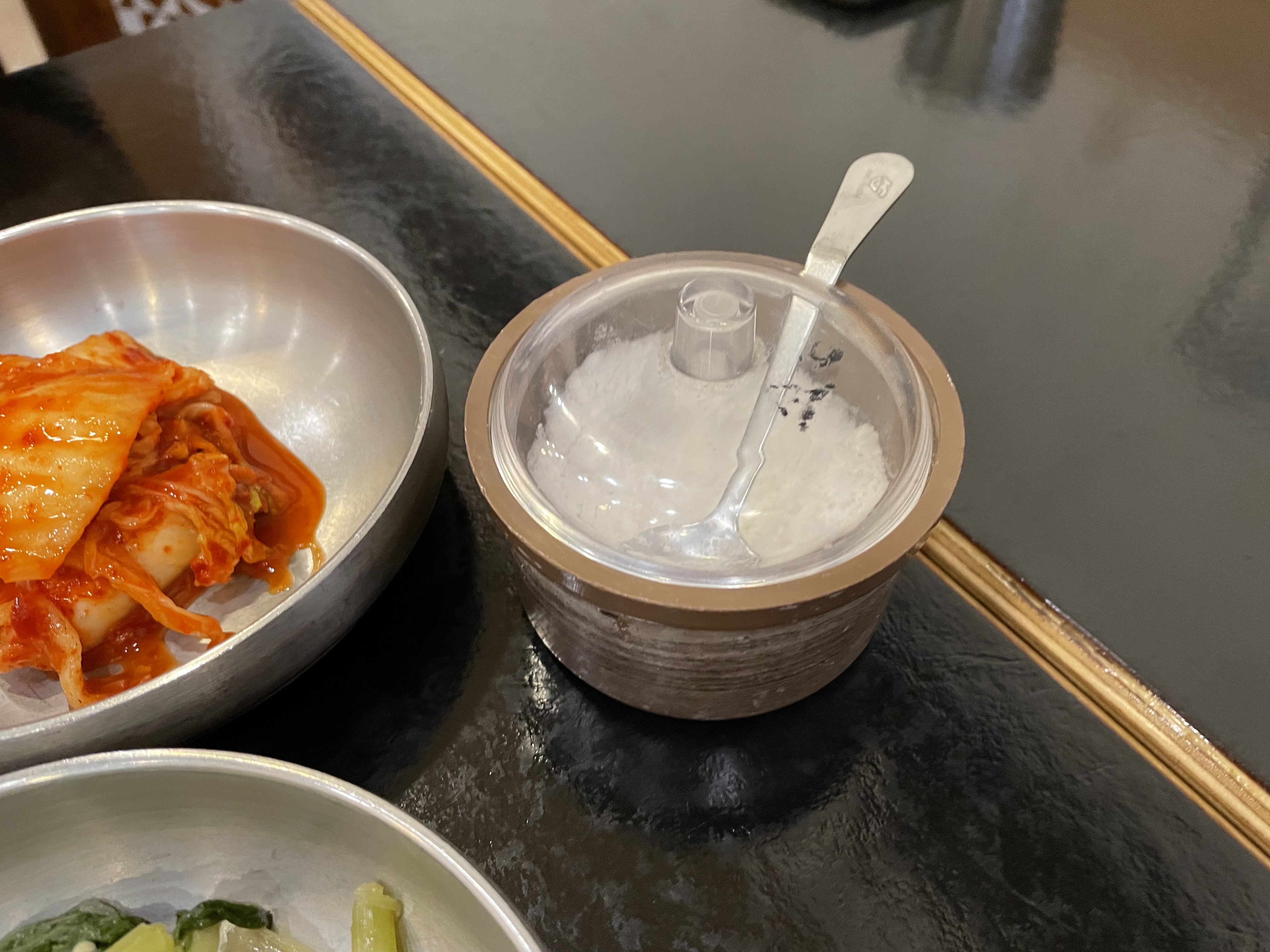 기본반찬이 나왔습니다. 깍두기와 김치, 열무김치입니다. 콩국수를 주문했기에 소금도 주셨어요. 김치와 깍두기 모두 잘 익었습니다.