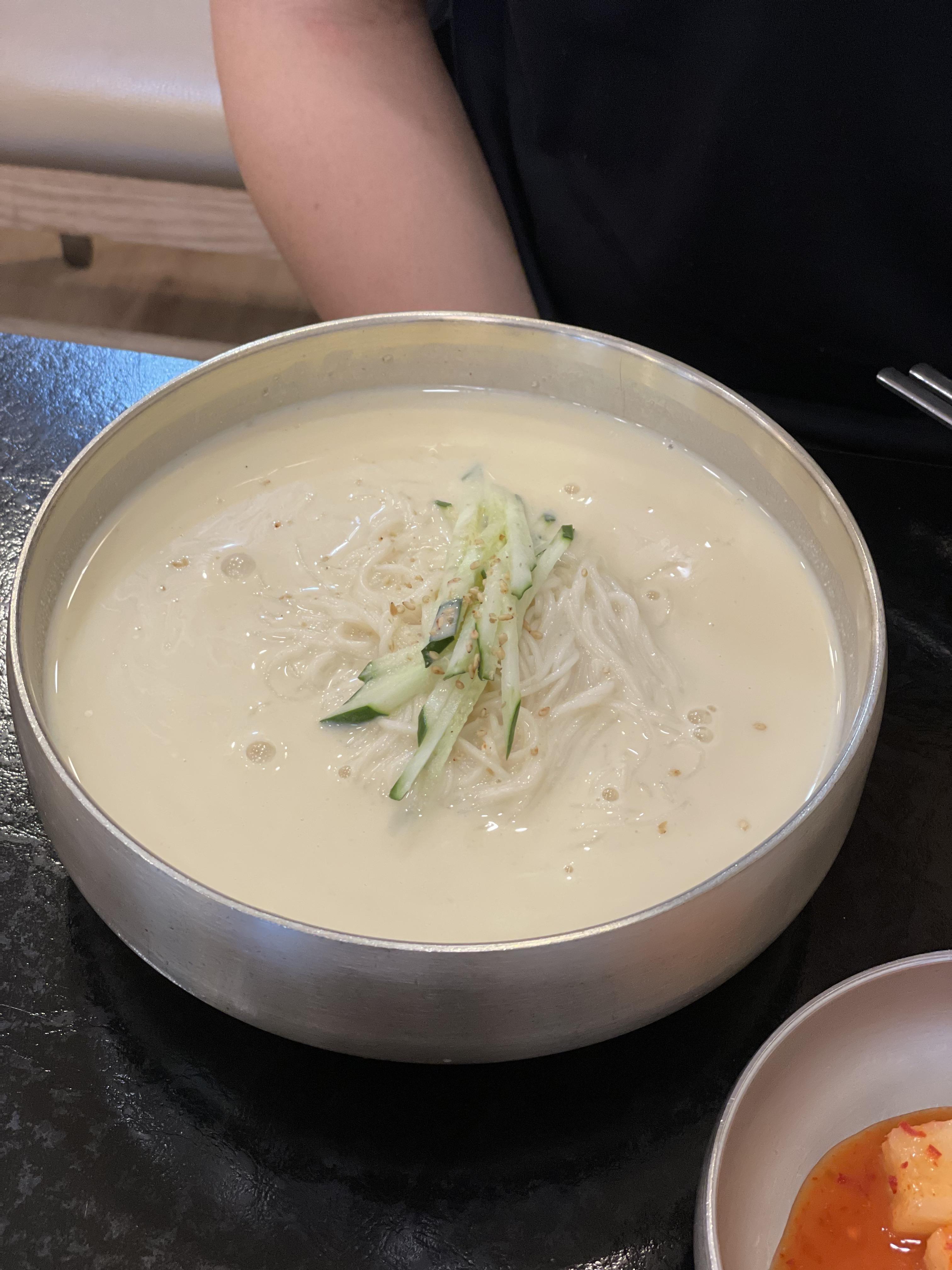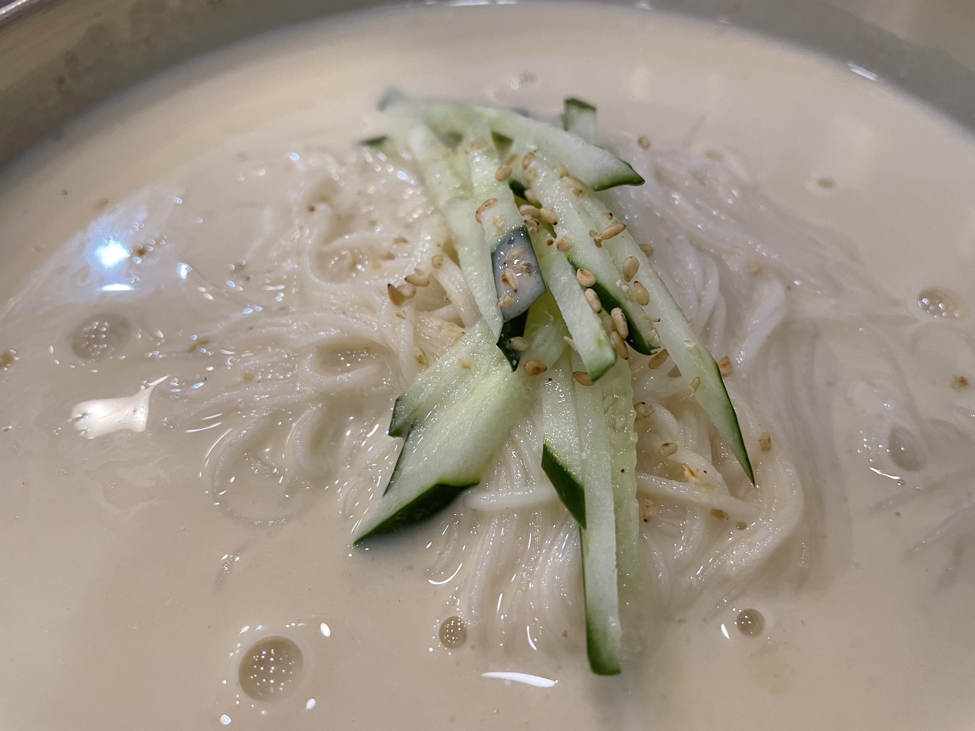 콩국수입니다. 뽀얀 국물에 오이가 고명으로 올라간 기본적인 콩국수입니다. 기본적으로 콩국물에 간이 되어 있으니, 드셔 보시고 소금을 넣으셔야 합니다.