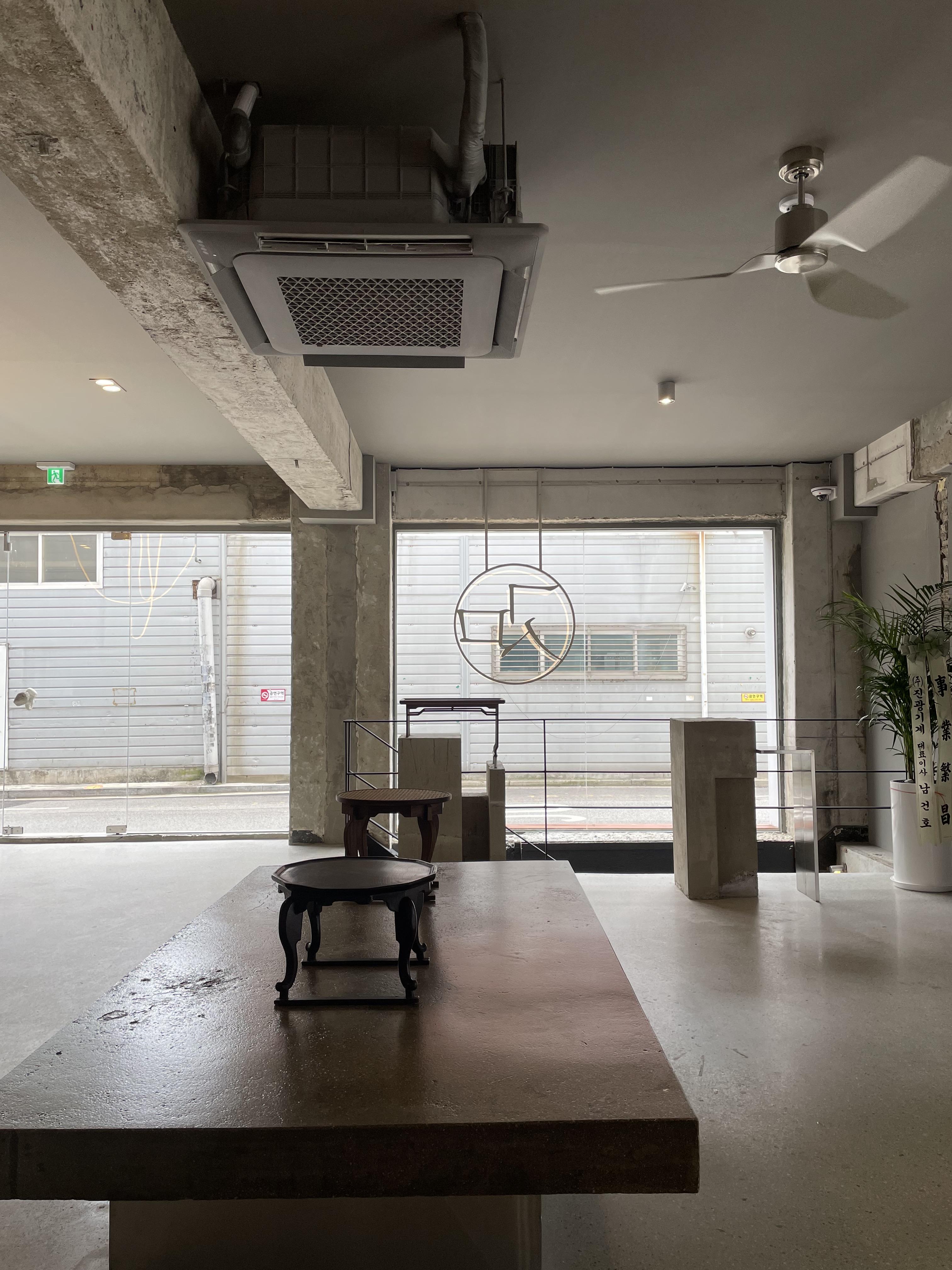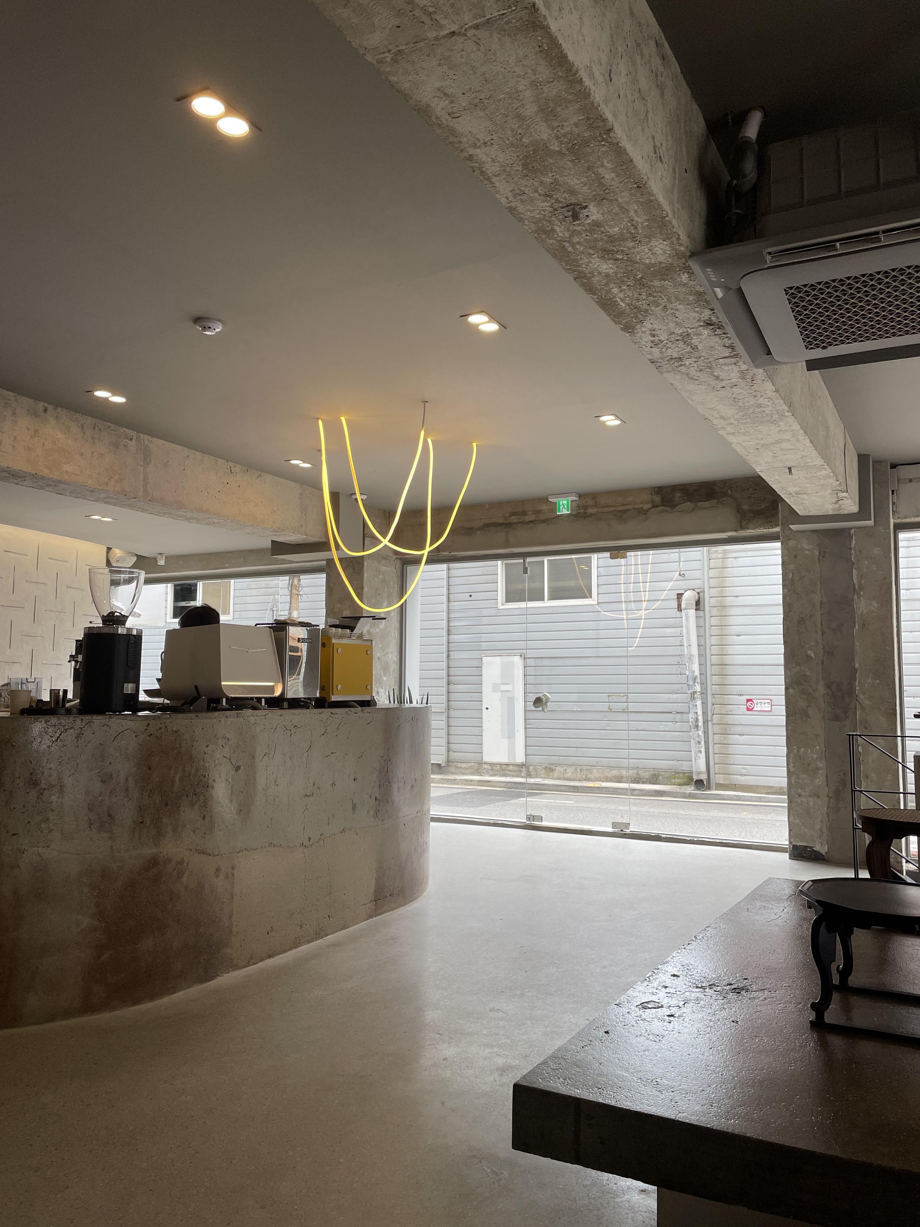 크게 꾸밈없는 외관으로, 거친 콘크리트 등의 날 것 그대로의 재질을 드러냈어요. 기억에 남는 부분은 입구의 손잡이인데요. 진짜 돌 그대로를 문 손잡이로 만들어서, 카페에 들어설 때의 그 촉감에 대한 기억이 오래 남을 것 같아요.