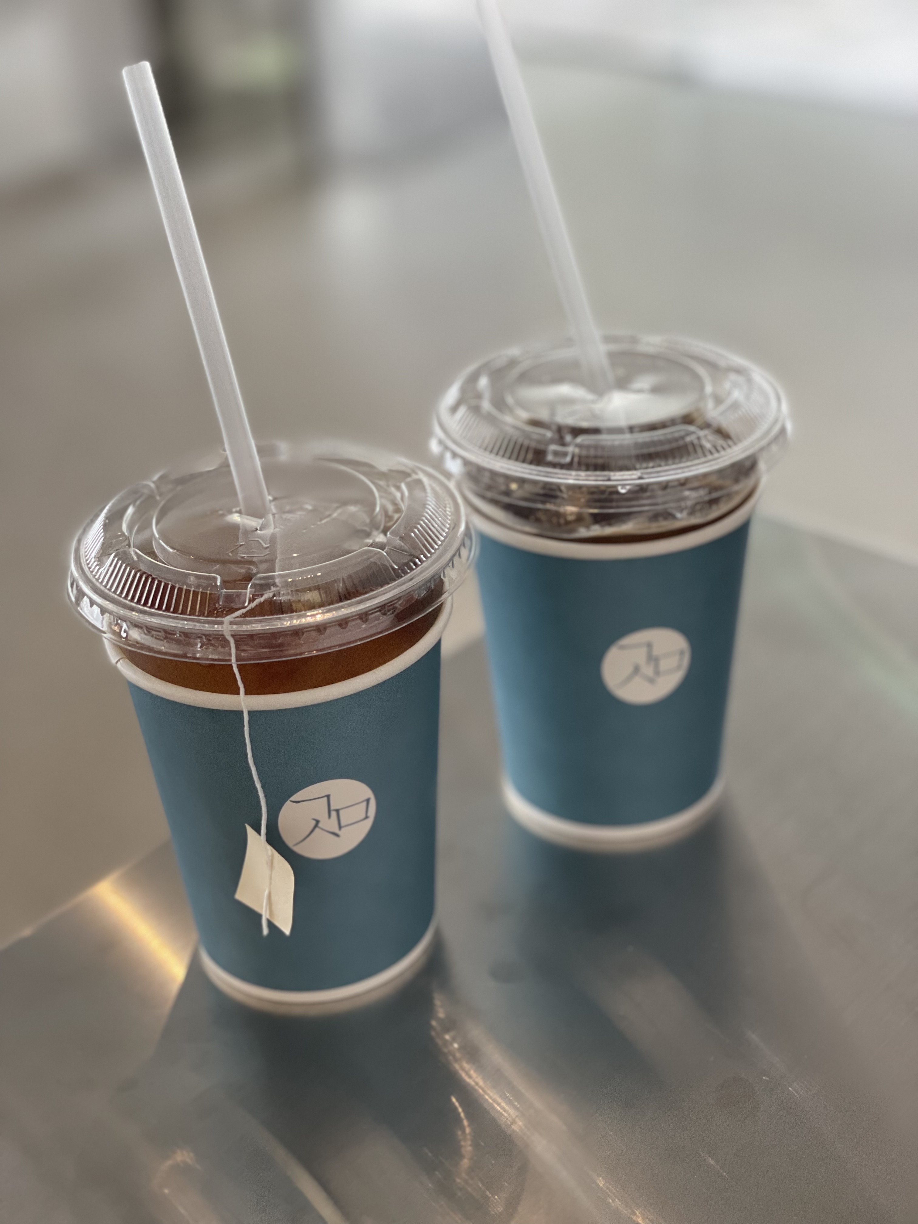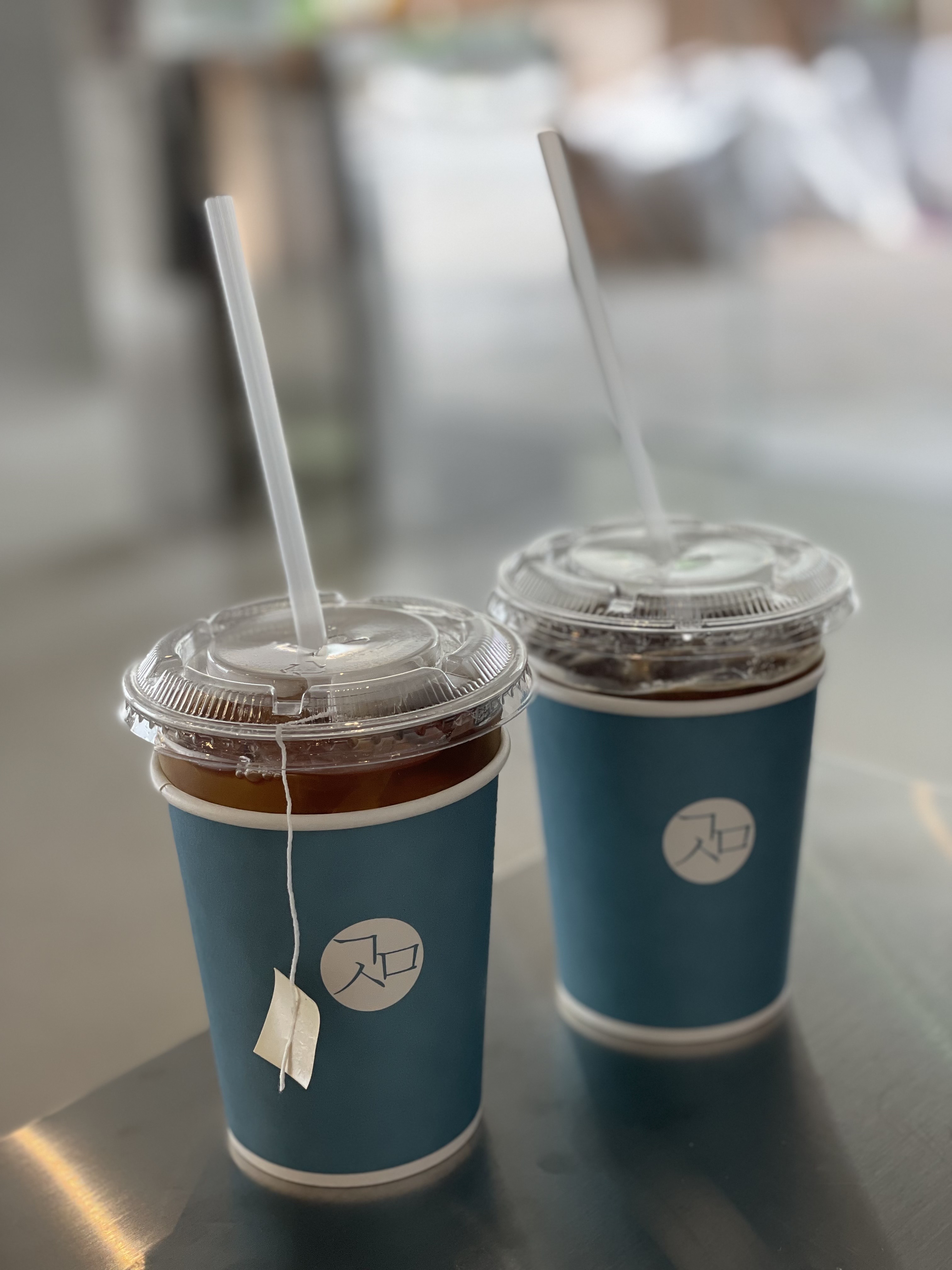 저희가 주문한 음료는 아이스 아메리카노와 머스캣 블랙티입니다. 아메리카노는 살짝 쓴 편이고, 머스캣 블랙티는 생각보다 정말 맛있었어요! 추천합니다. 깔끔한데 뒷맛이 상큼 달달한 청포도맛이에요. 과하지 않아서 좋았네요.
