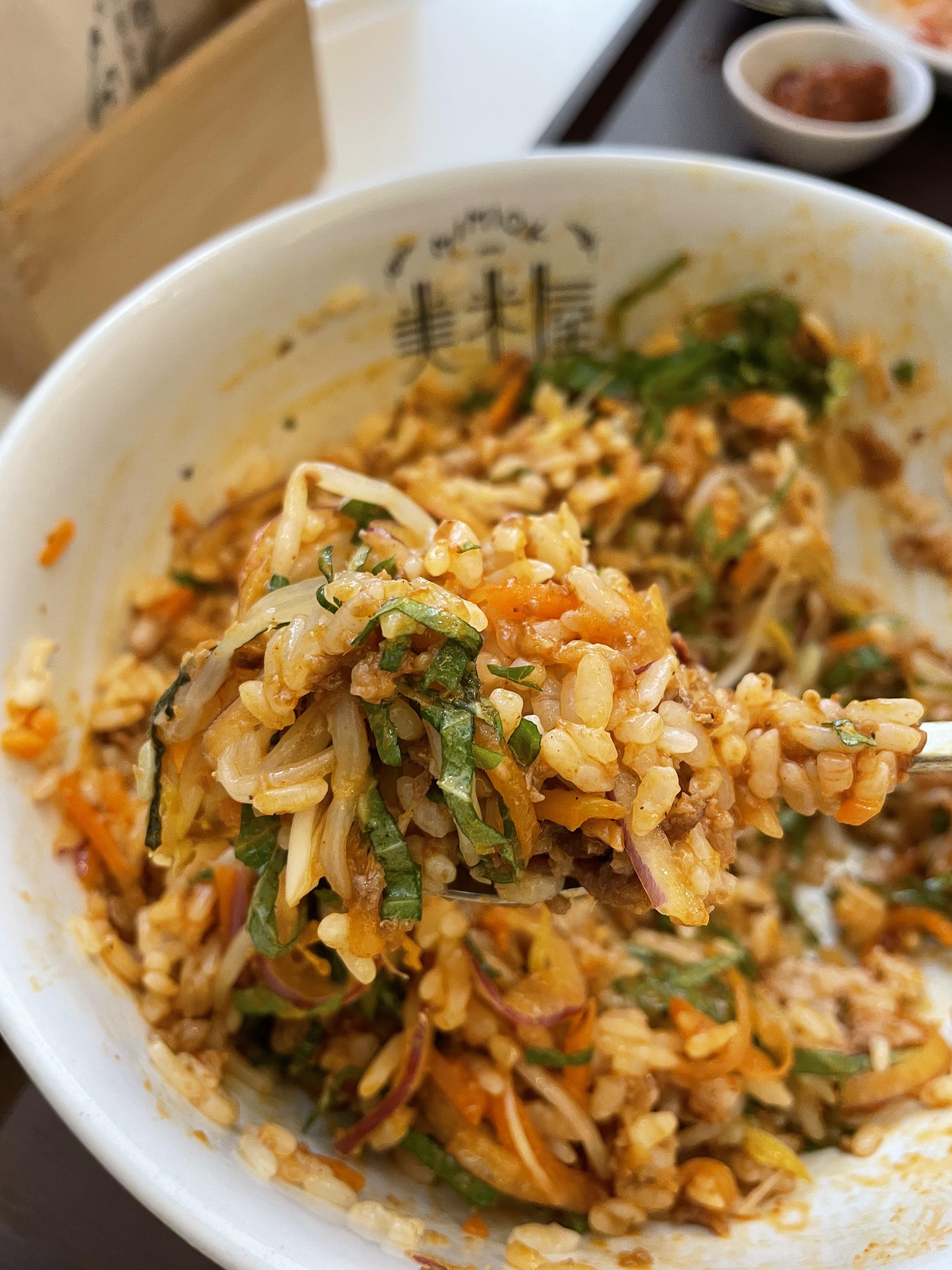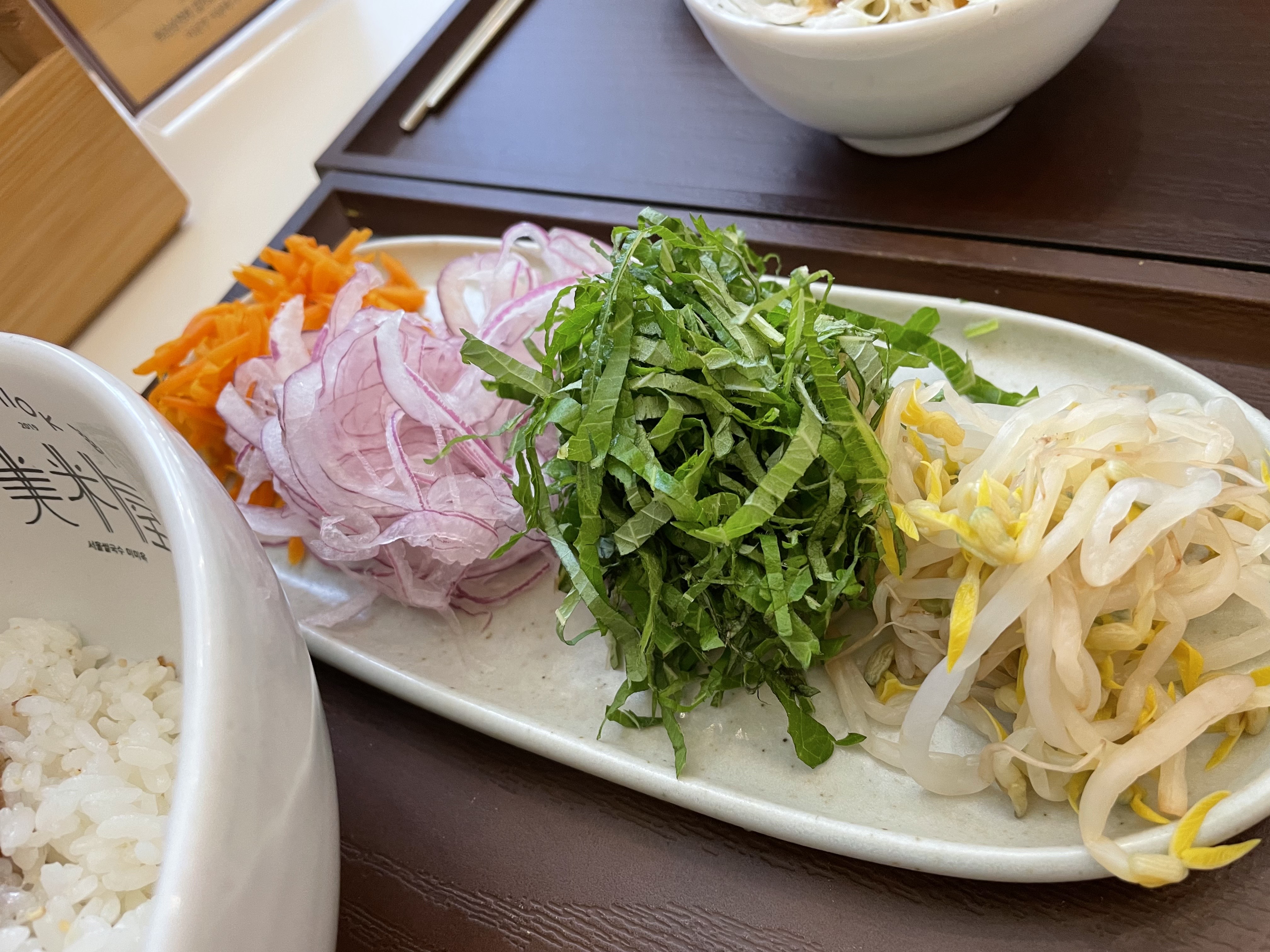 이렇게 예쁘게 담아서 비벼 봤어요. 당근, 적양파, 깻잎, 숙주가 나옵니다.