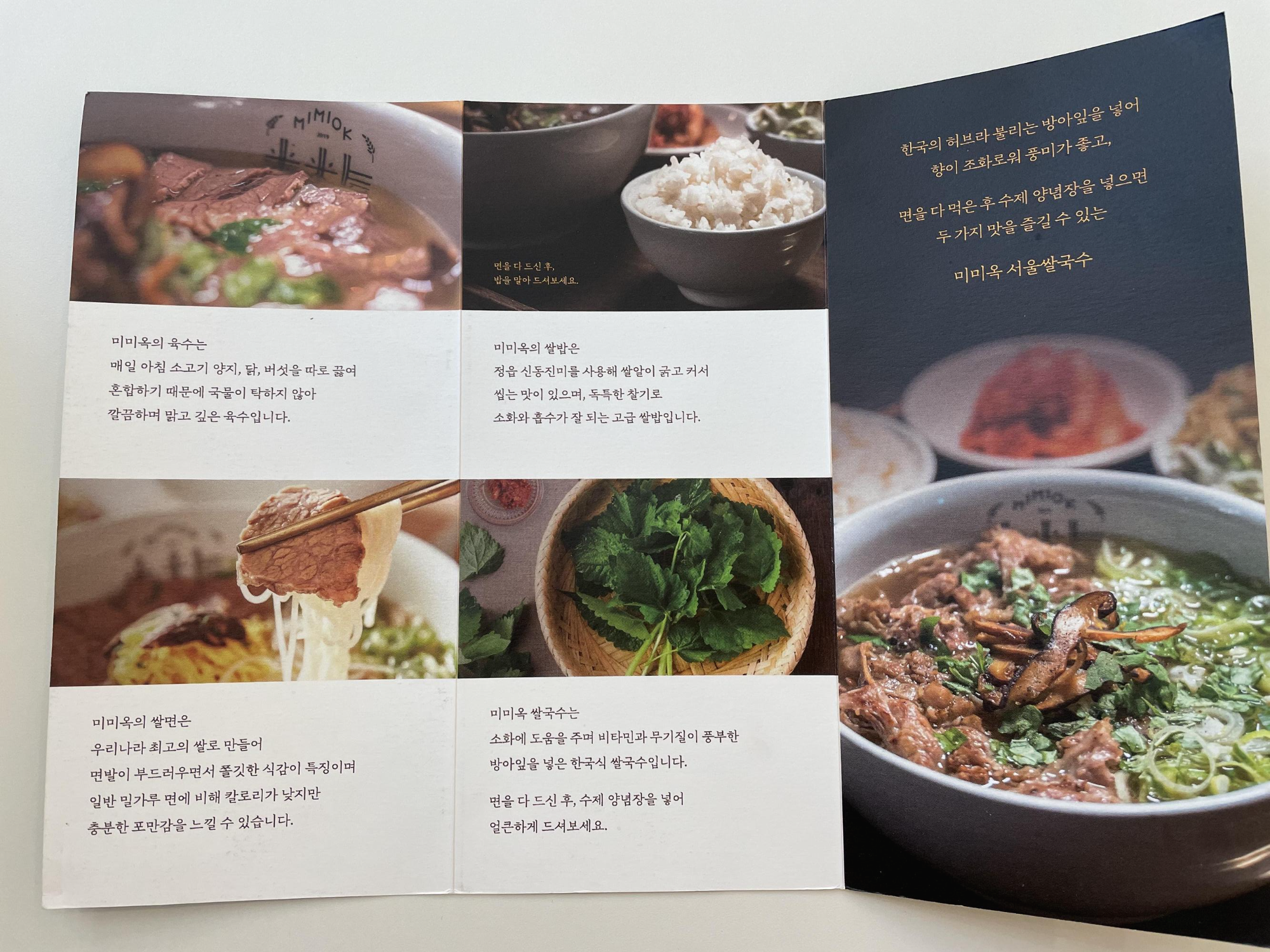 테이블에 함께 있던 팜플렛이에요. 미미옥에 대한 이야기가 있어요. 미미옥의 육수는 소고기 양지, 닭, 버섯을 따로 끓여 혼합하기 때문에 국물이 탁하지 않고 깔끔하다고 하네요. 특이한 점은 미미옥 쌀국수는 소화에 도움을 주고 비타민과 무기질이 풍부한 방아잎을 넣어 만든다고 합니다.