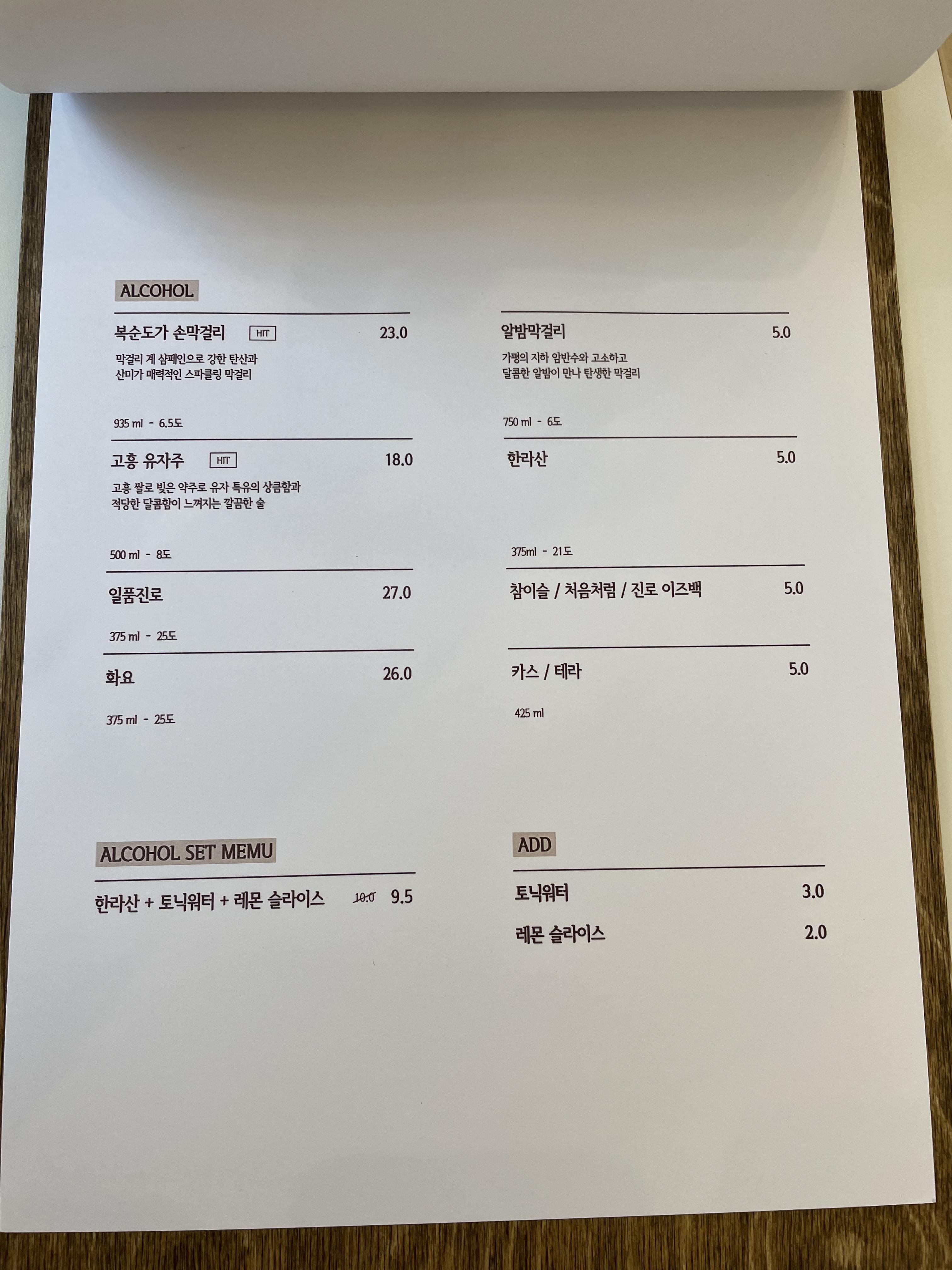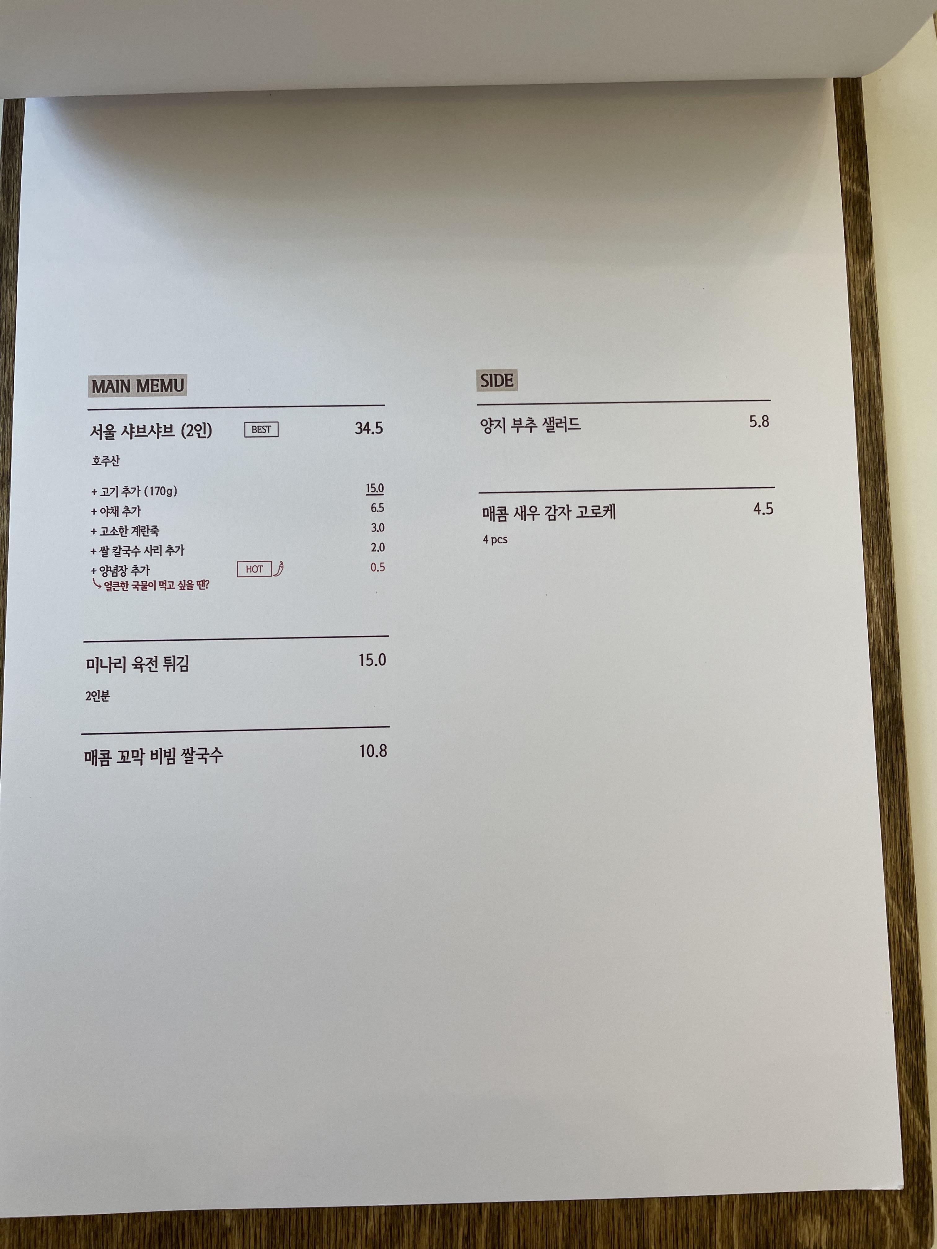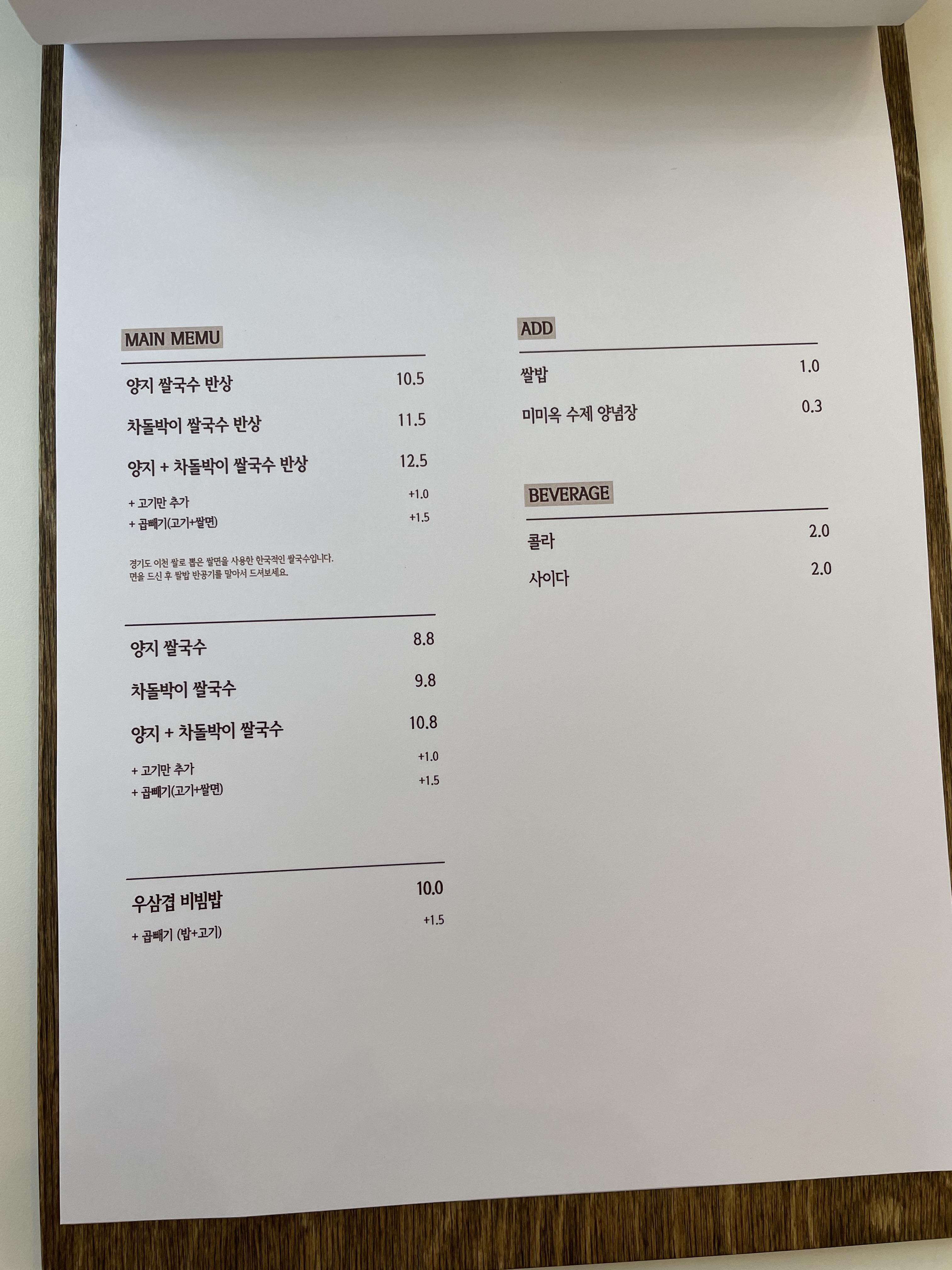 메뉴판입니다. 메인 메뉴는 샤브샤브와 쌀국수예요. 특별하게도 막걸리도 판매하네요. 저희는 차돌박이 쌀국수 반상과 우삼겹 비빔밥을 주문했어요. 가격은 총 21,500원입니다. 2명이서 먹는 것 치고는 나쁘지 않네요!