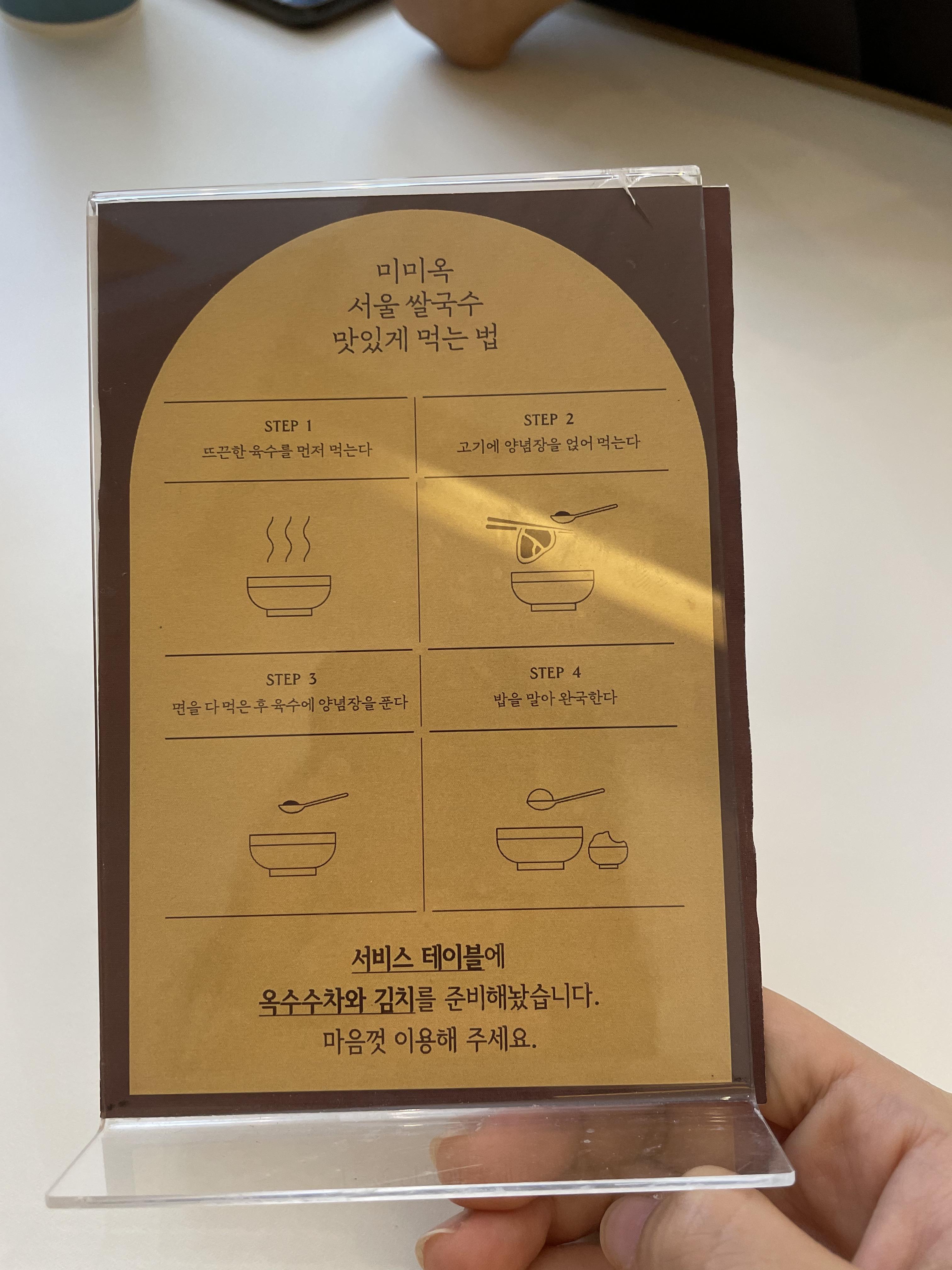 미미옥 서울 쌀국수 맛있게 먹는 법이 나와 있었는데, 고기에 양념장을 얹어 먹고, 면을 다 먹은 뒤에는 육수에 양념장을 풀어 밥을 말아먹으라고 적혀 있었어요.