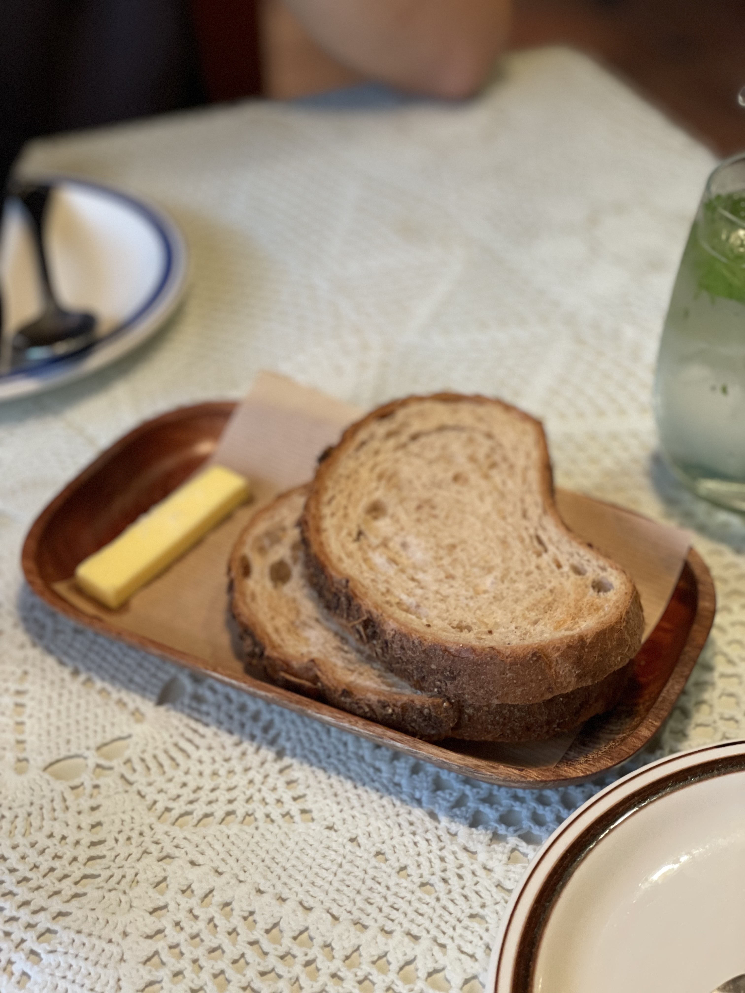식전빵이 나왔습니다. 겉은 바삭하고 속은 촉촉한 곡물빵이에요. 소금을 뿌린 버터가 같이 나와서 발라서 먹었습니다. 개인적으로 소금은 좀 짜서 털어내고 먹었어요.