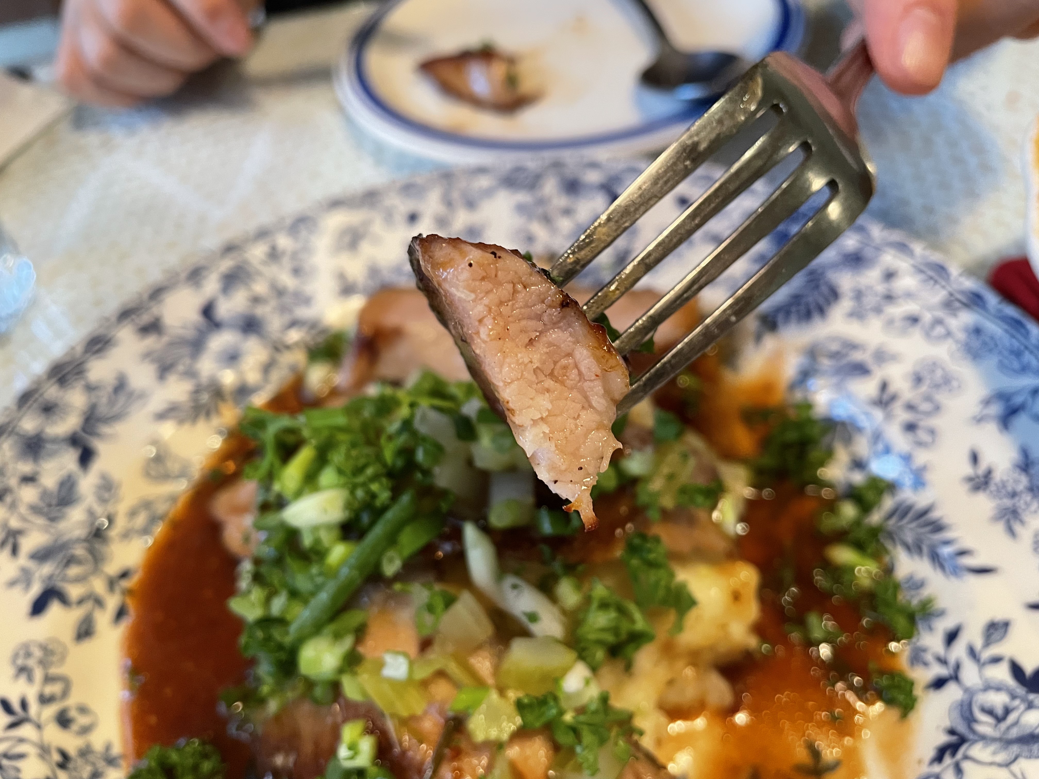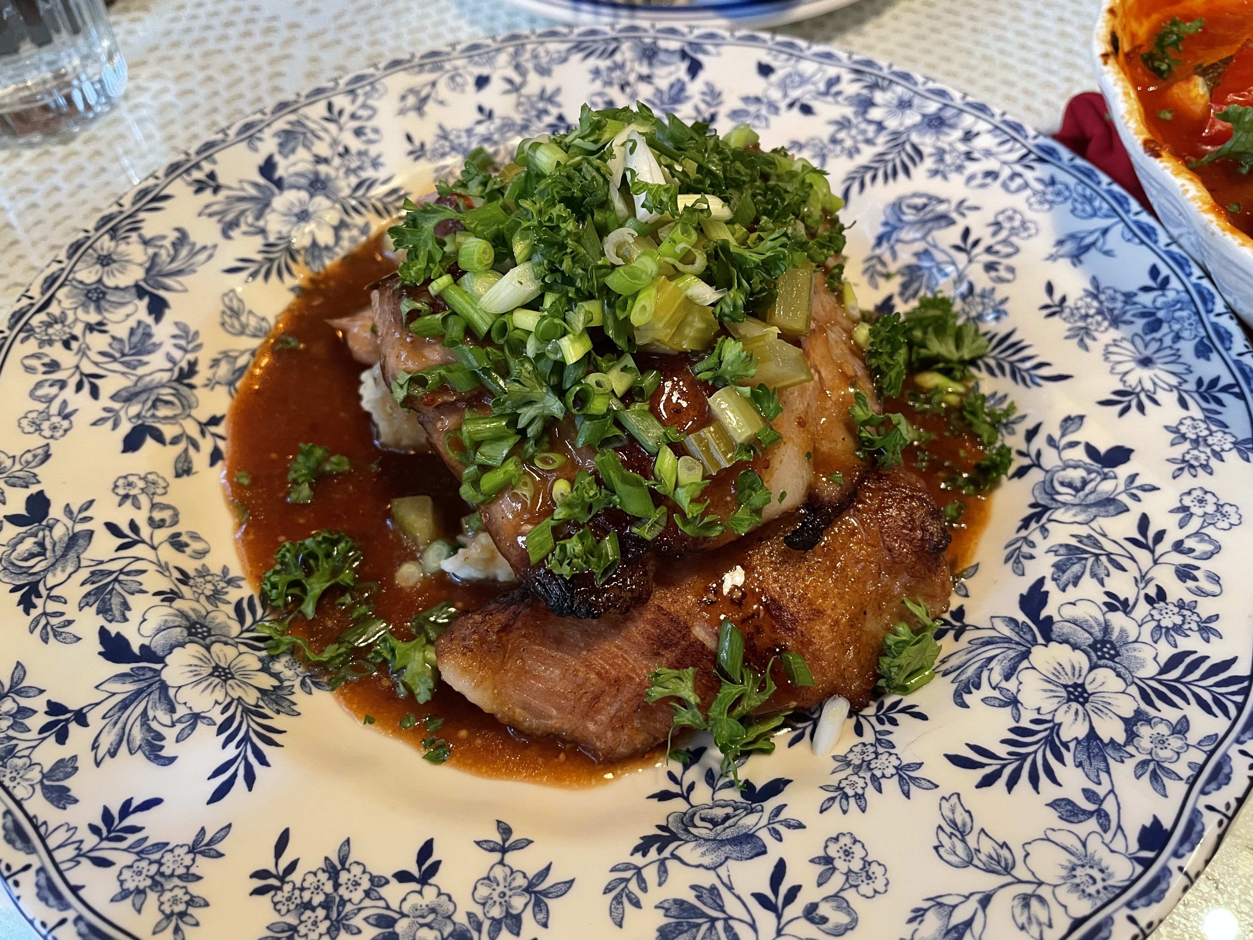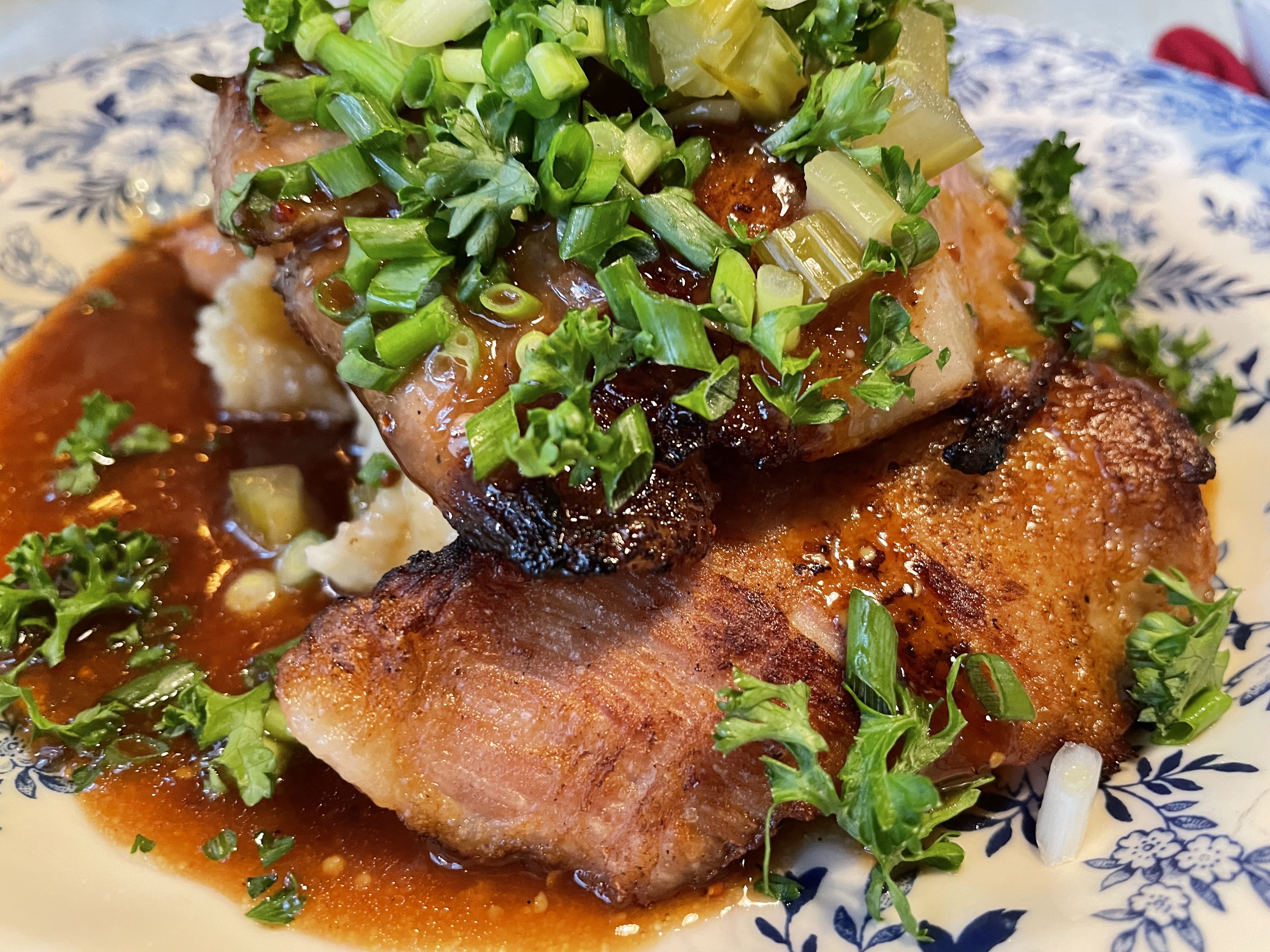 전체적으로 소스가 자작하게 깔려있고, 대파 크림 포테이토 위로 로즈마리, 타임을 넣어 화이트 와인에 부드럽게 조리한 항정살 스테이크가 올라가 있습니다.