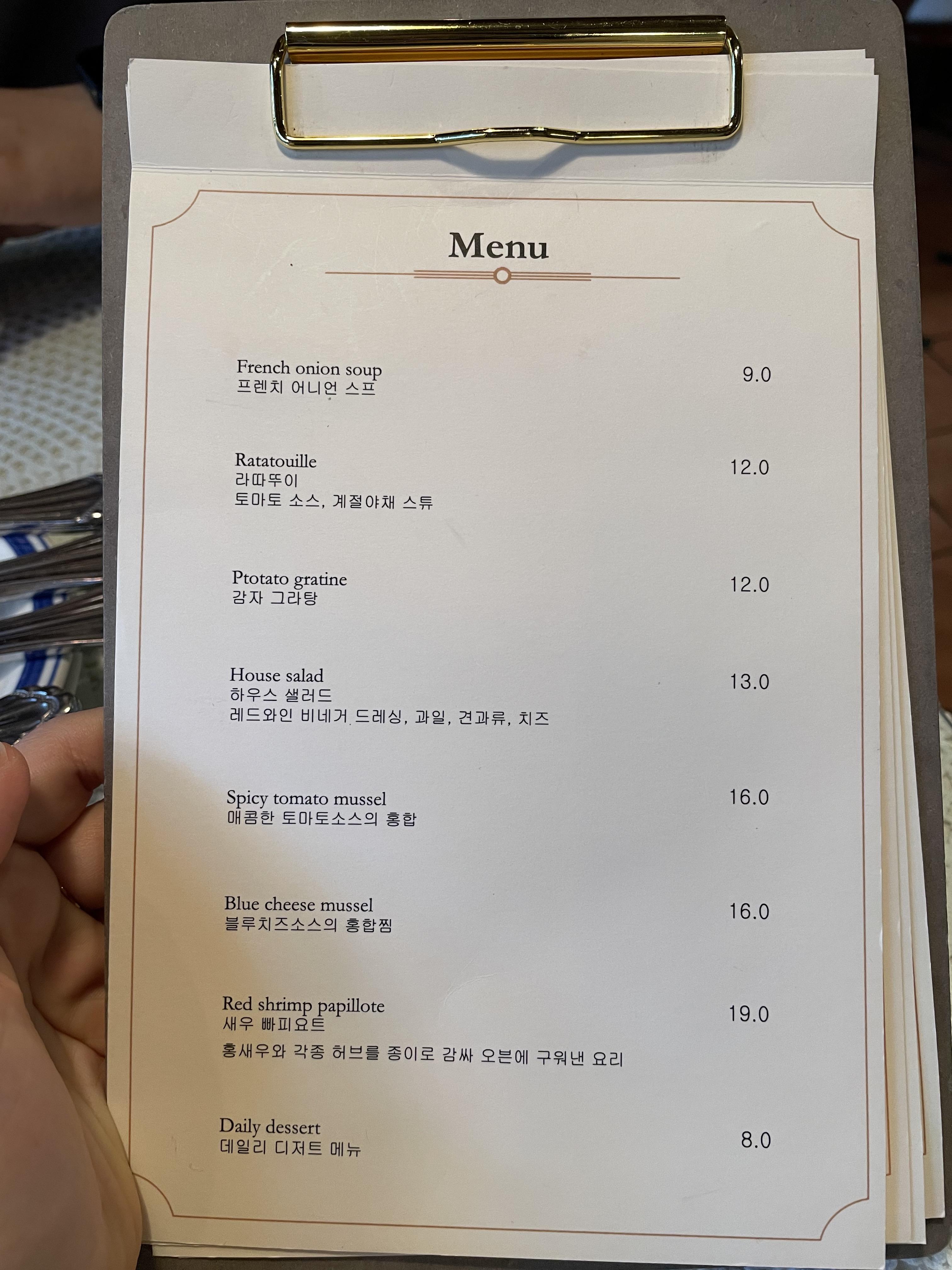 메뉴판입니다. 식사메뉴는 이 정도이고, 이 뒤로는 거의 와인 같은 주류와 음료 메뉴였어요. 와인 한 잔 하기 딱 좋은데, 아쉽네요!