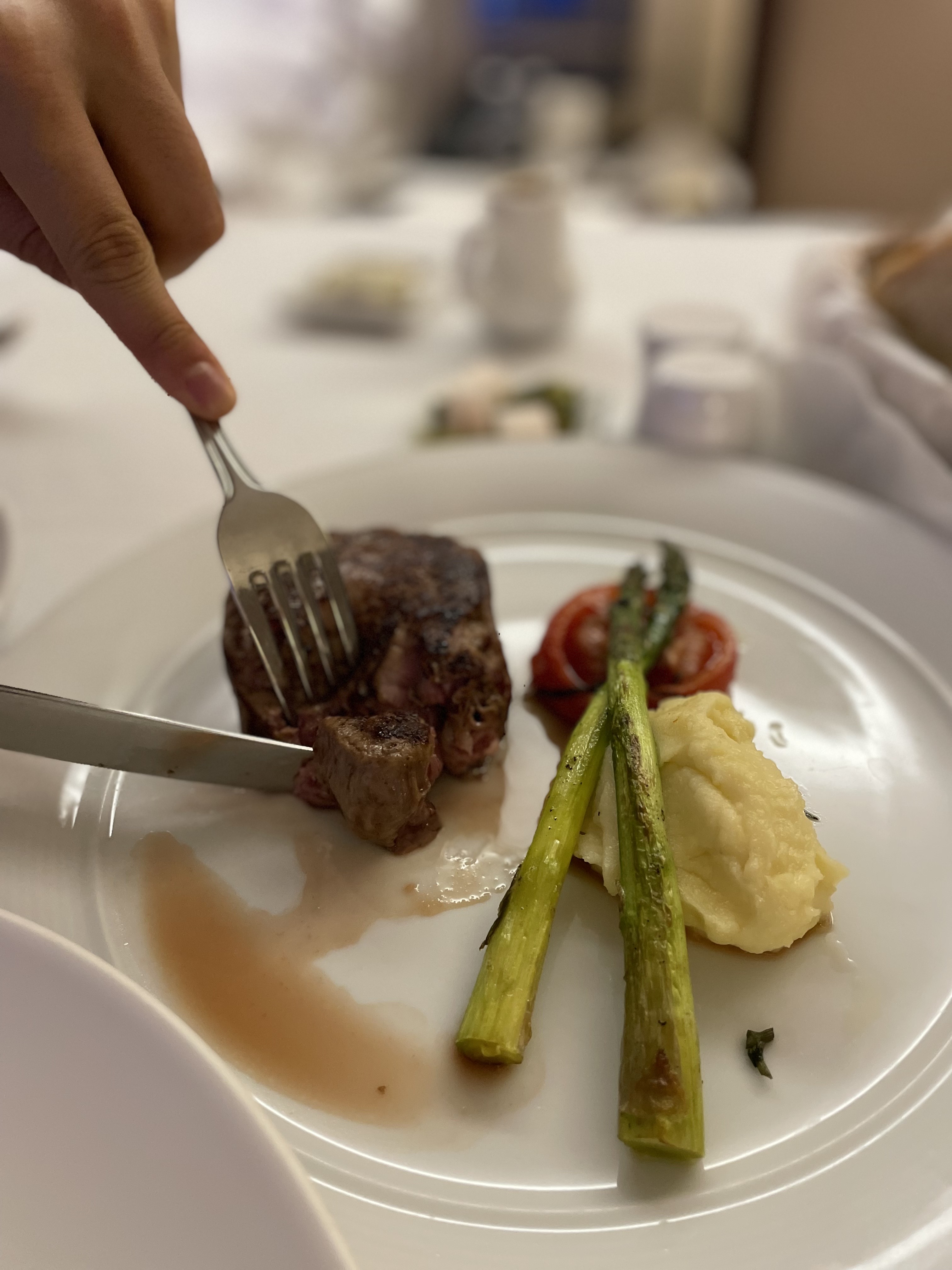 가니쉬로는 매쉬드 포테이토와 구운 아스파라거스와 토마토가 곁들여져 나왔습니다.