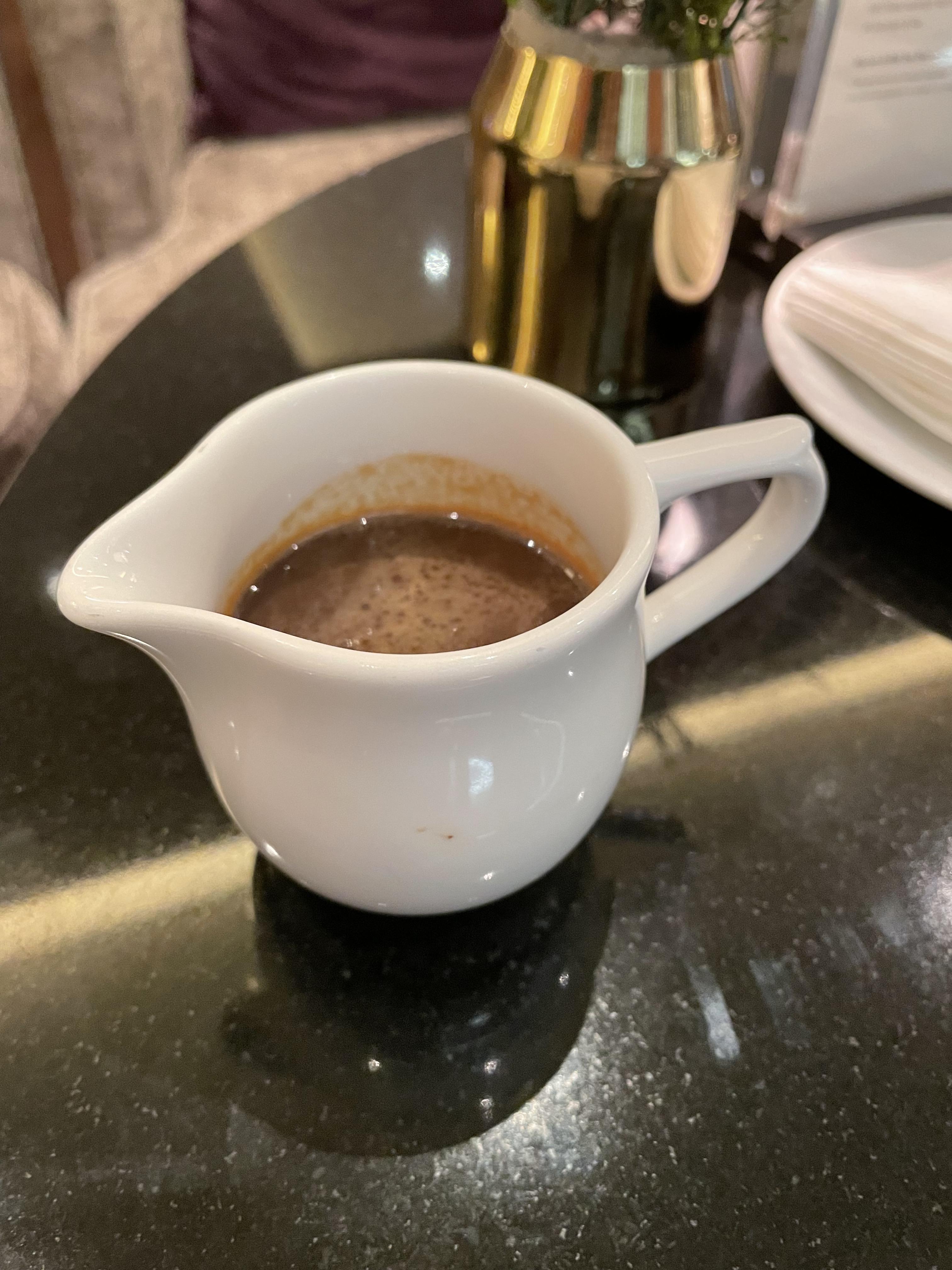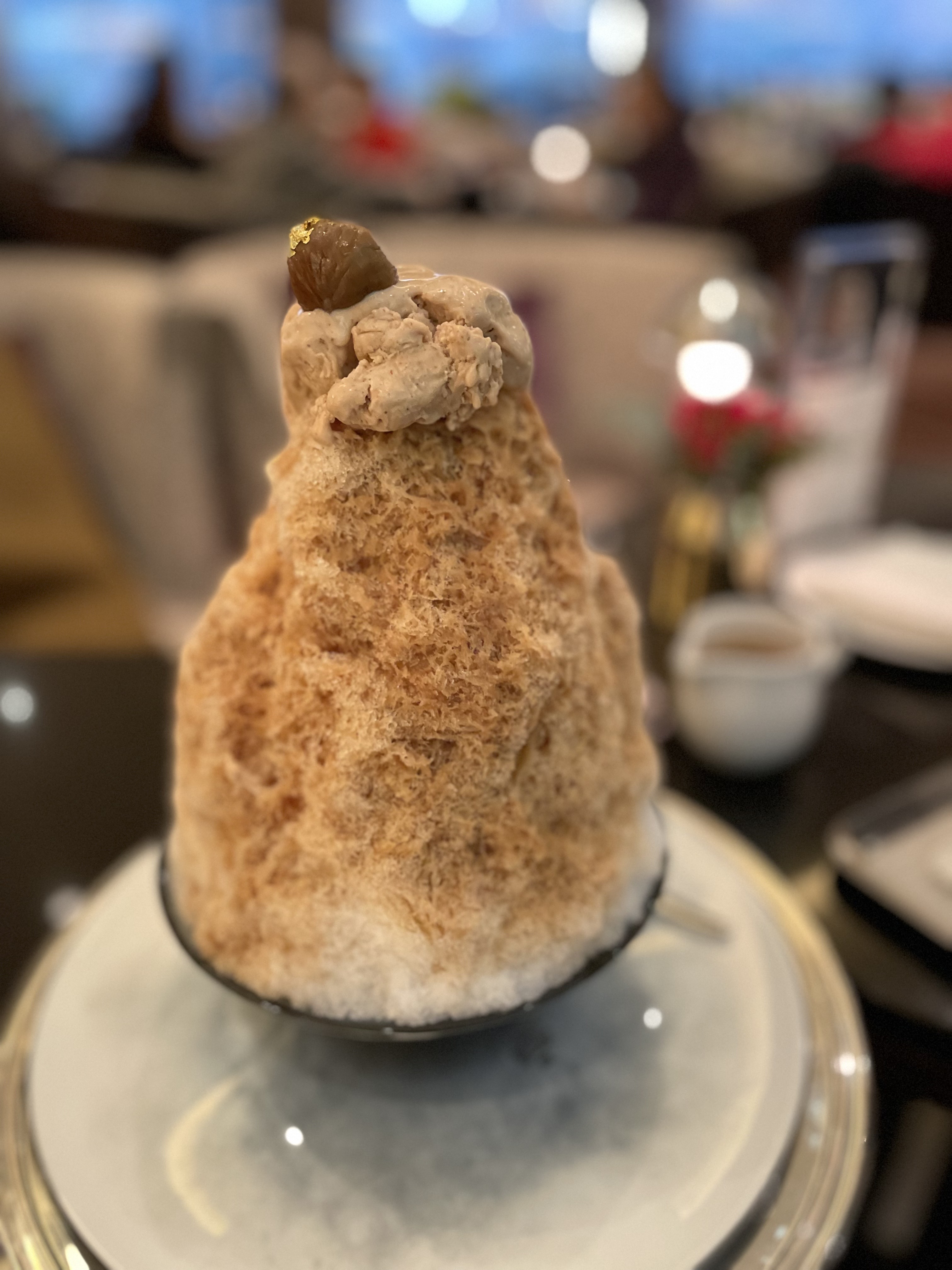 얼그레이 향 밀크티 얼음 위로 밤 젤라또와 진짜 밤이 올려져 있고, 금가루가 살짝 뿌려져 있어요. 그릇을 회전시켜 먹을 수 있어서 좋았어요. 너무 달지도 않고 맛있었습니다!