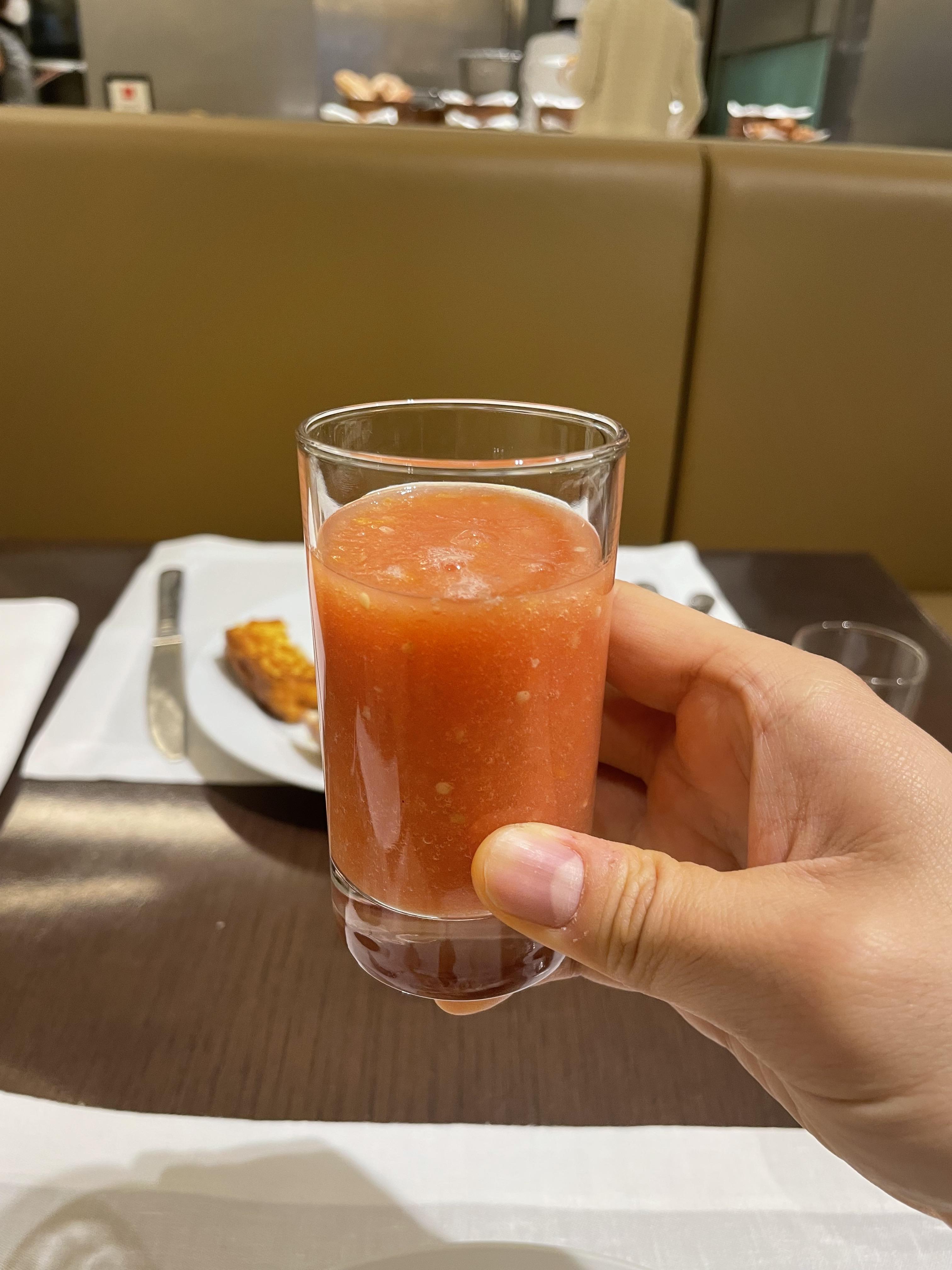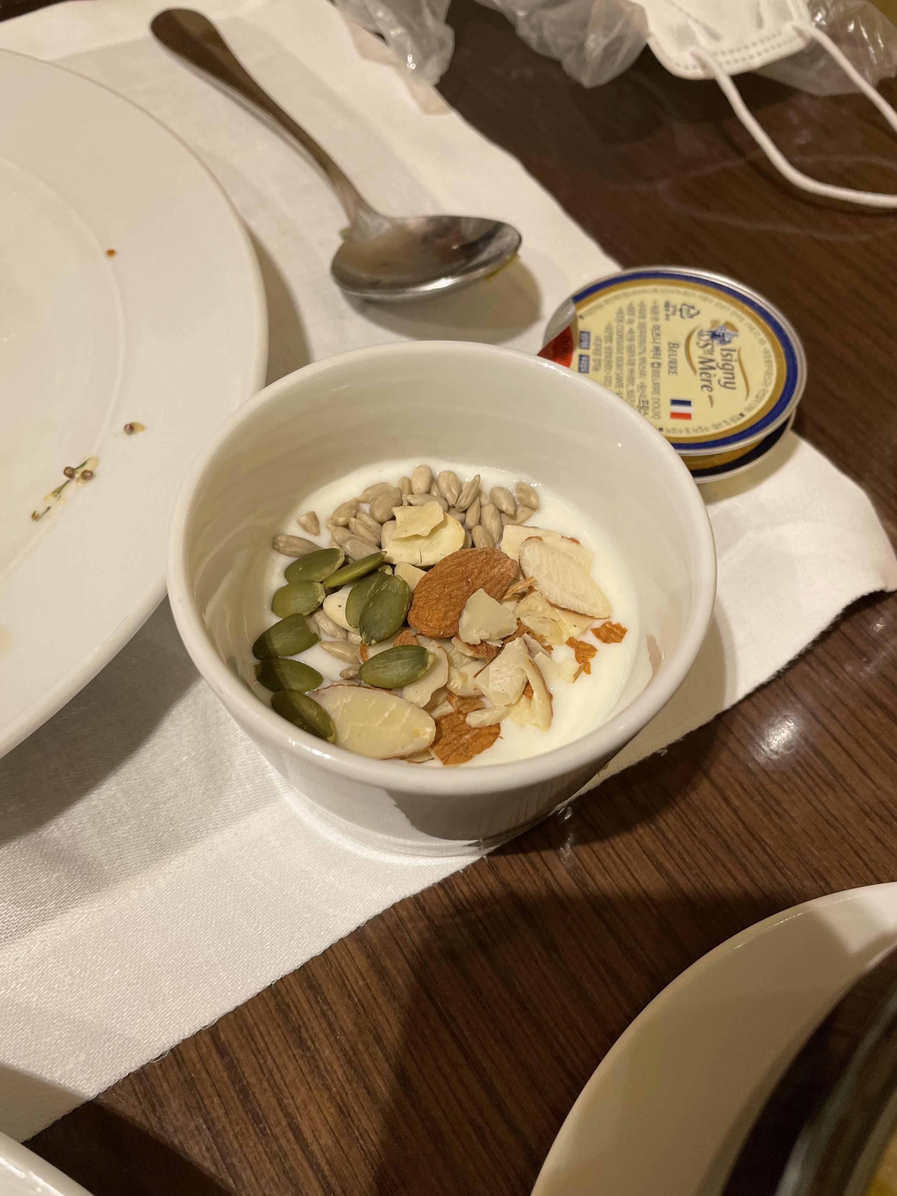 일행의 요거트와 토마토 주스입니다. 일행은 어제 룸서비스에서 나온 버터에 감명받았는지 조식 먹을 때도 버터를 챙겨 왔어요.