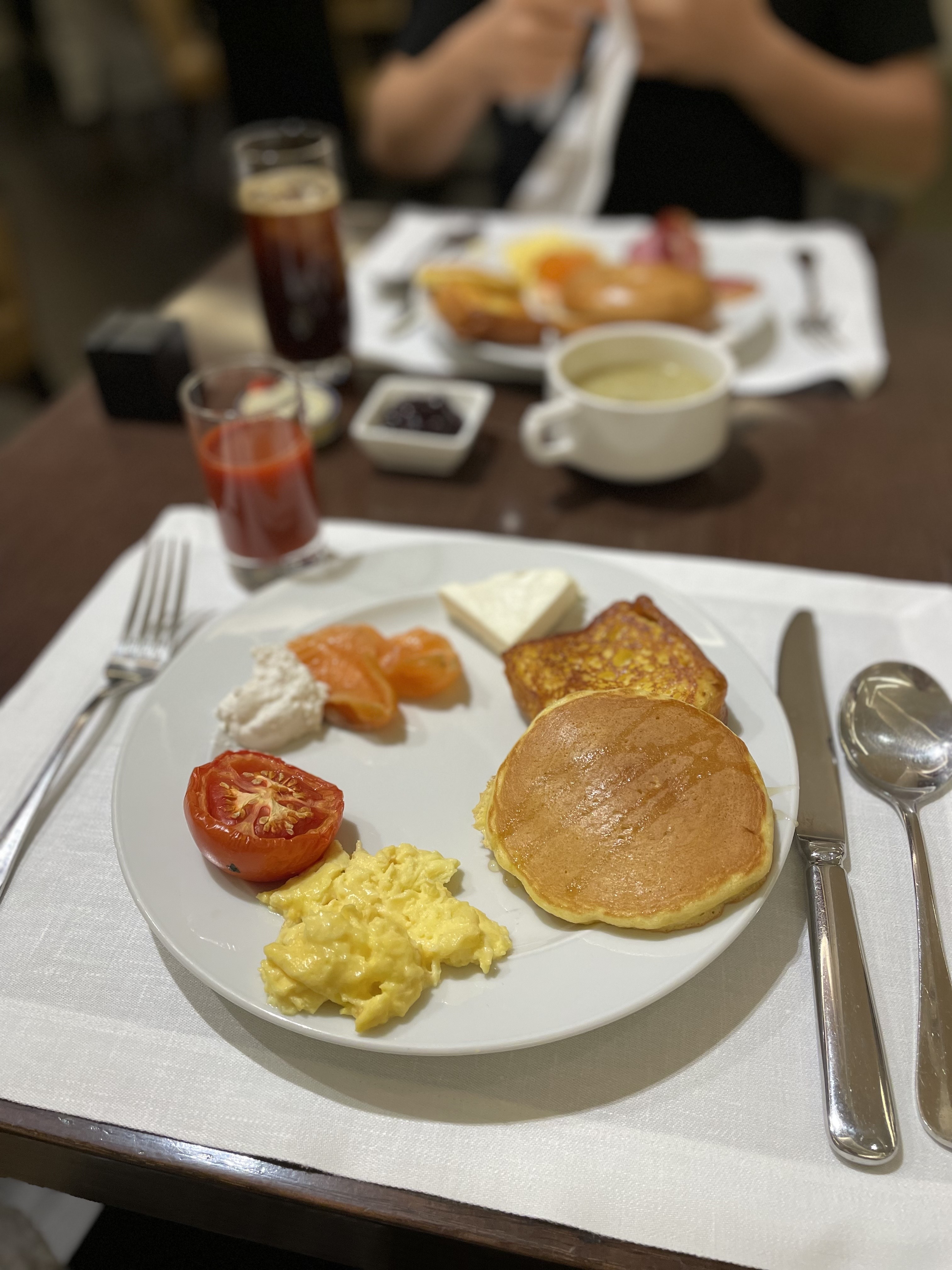 저희의 첫 번째 그릇입니다. 팬케익과 프렌치토스트, 베이글, 스크램블 에그와 구운 토마토, 연어샐러드와 베이글, 그리고 전복죽을 가져왔어요. 빵류가 맛있어서 좋았어요.