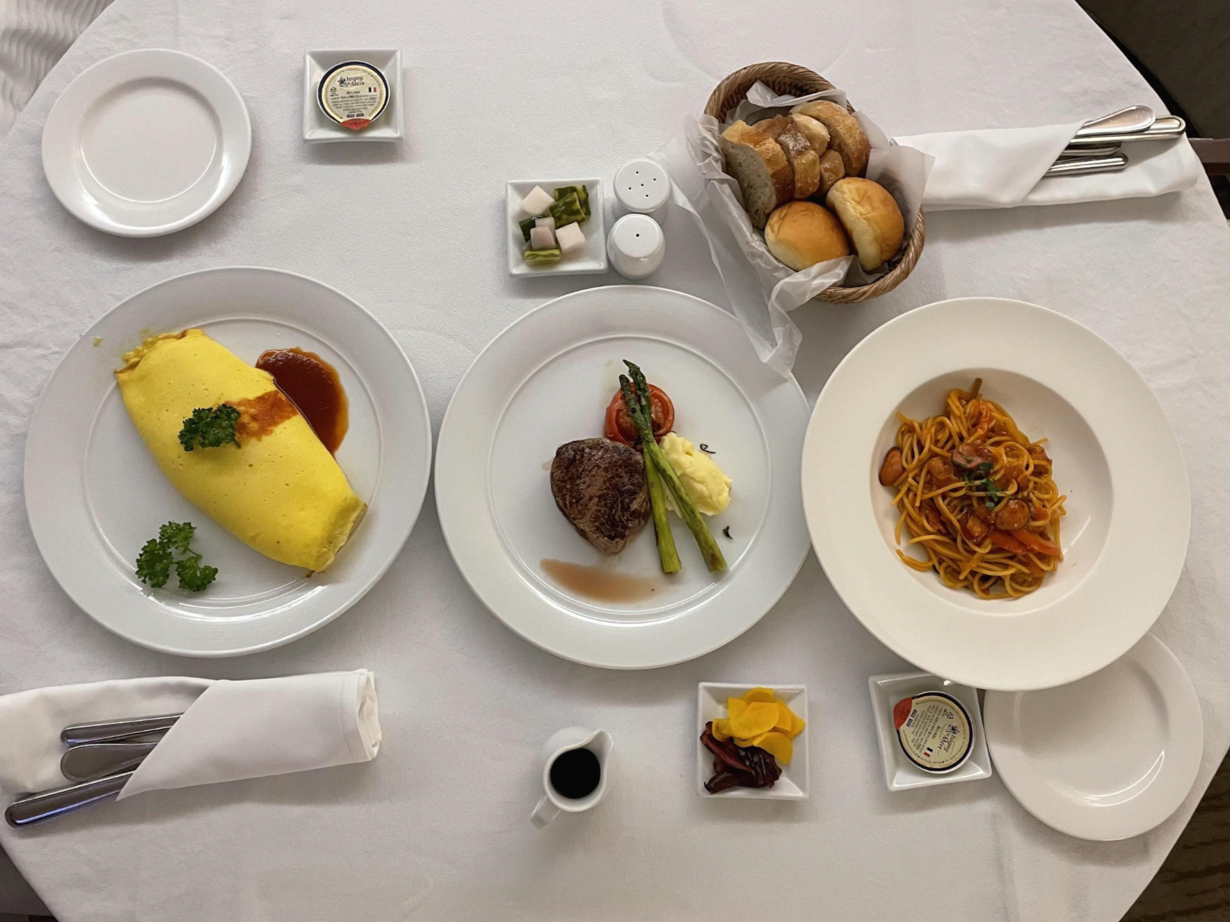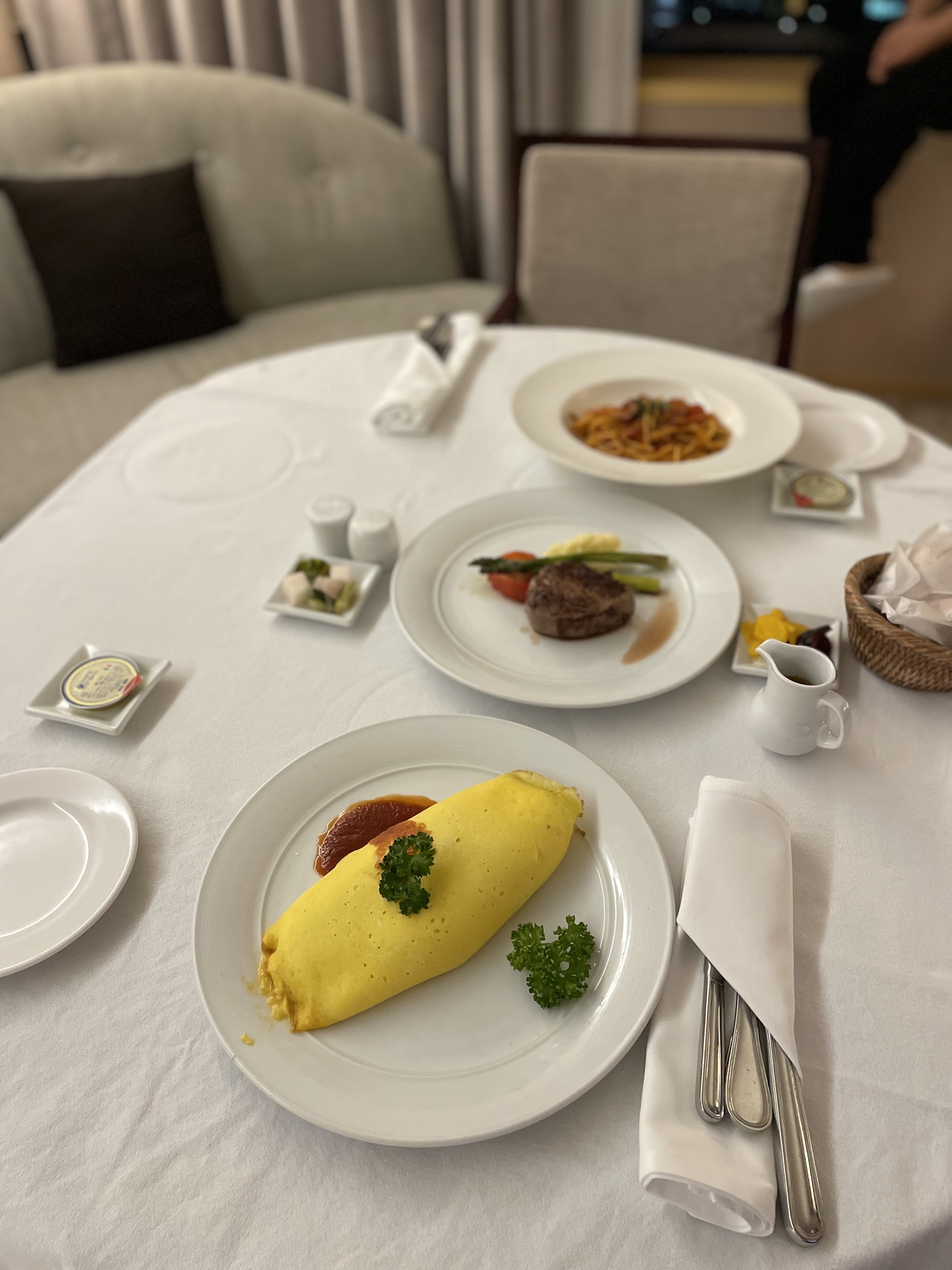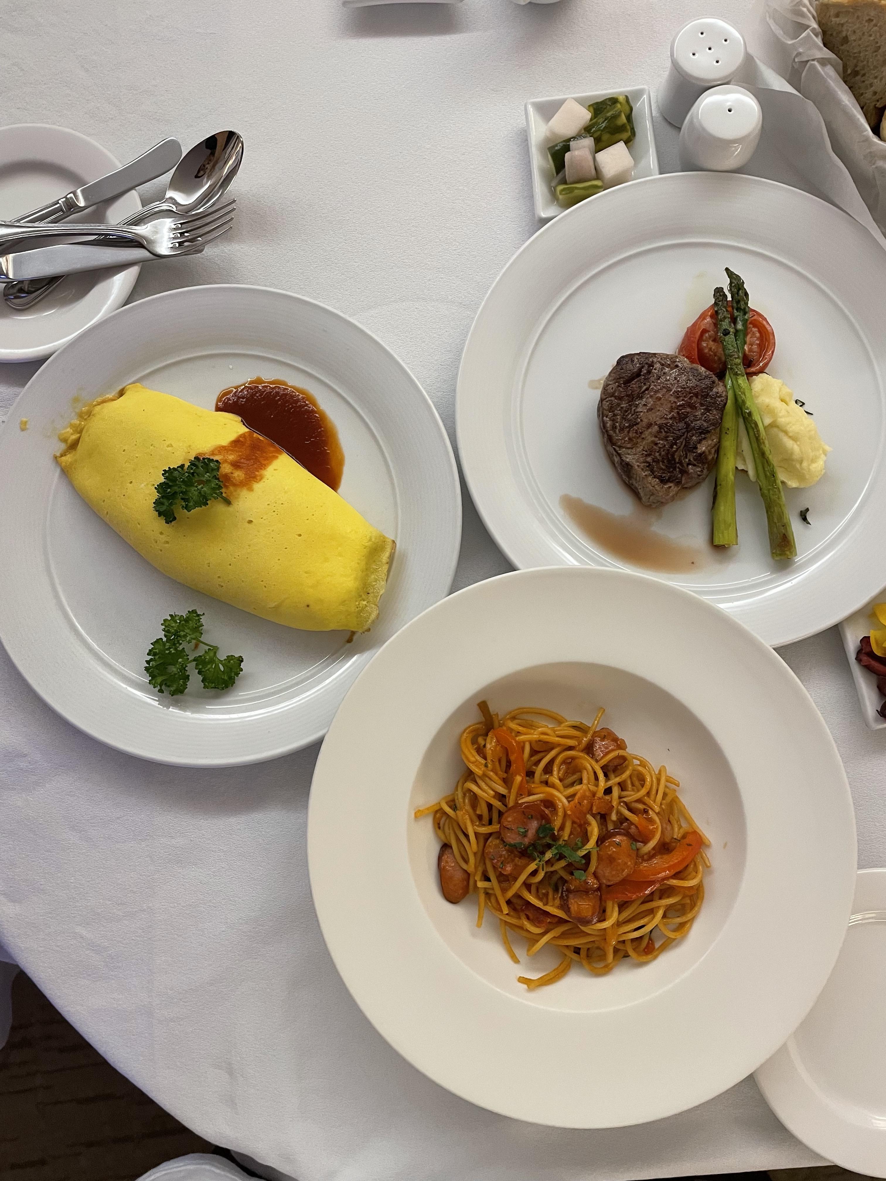 안심 스테이크(72,000원)와 나폴리탄 스파게티(29,000원), 오므라이스(30,000원)를 주문했습니다. 사실 오므라이스 대신 비프 카레라이스를 먹고 싶었는데, 재료가 소진되었는지 어렵다고 하셔서 바꿨어요.
